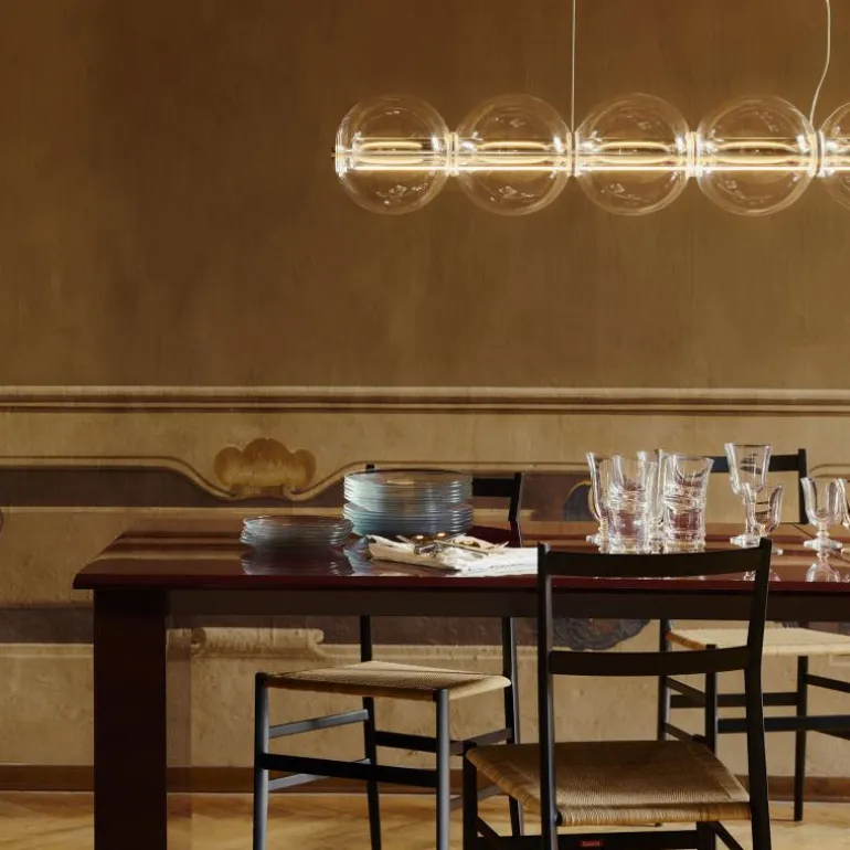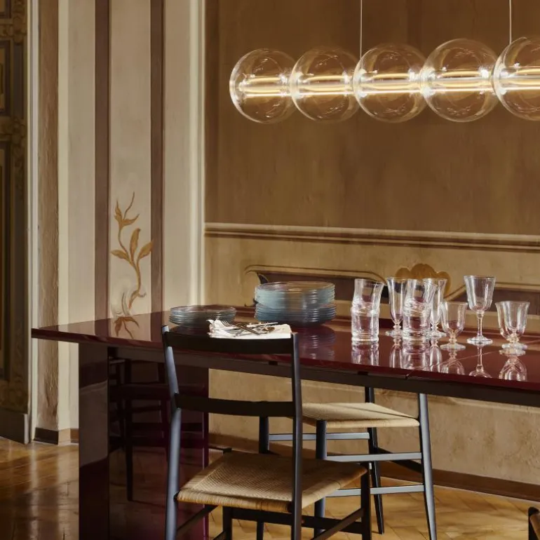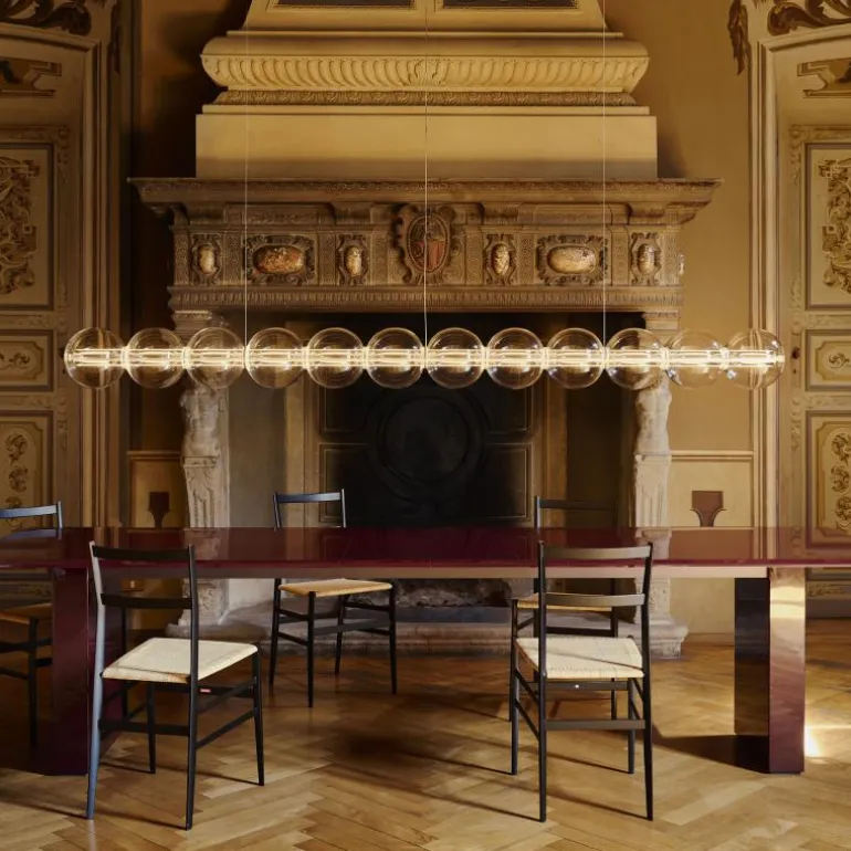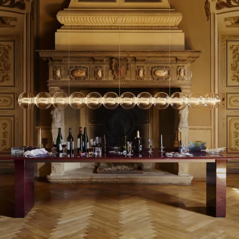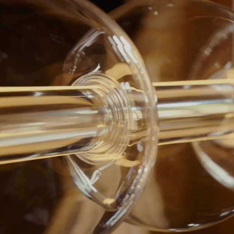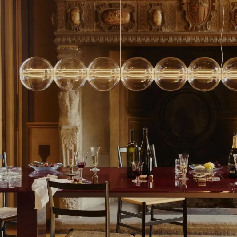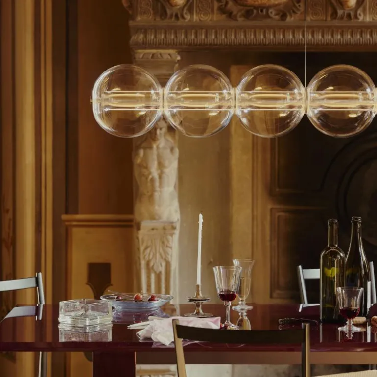 Rond het aluminium profiel bevindt zich een reeks met de hand geblazen glazen bollen, gescheiden door subtiele metalen afstandhouders. Deze constructie geeft de lamp een lichte, transparante uitstraling en benadrukt de technische precisie van het ontwerp. De modulaire opbouw maakt het mogelijk om meerdere elementen in parallelle rijen te plaatsen, waardoor de lamp schaalbaar is voor verschillende interieurconcepten. Het gebruik van hoogwaardige materialen garandeert duurzaamheid, terwijl de afwerking het karakter van ambachtelijk vakmanschap behoudt.