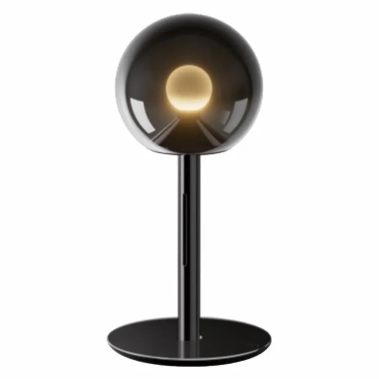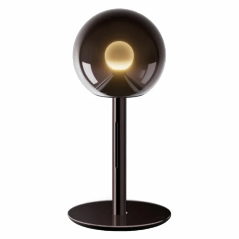De Luna Sogno Tafellamp heeft een armatuur van aluminium en PVD gecoat staal in donker chroom of phantom. Het metaal lijkt naadloos over te lopen in de donker getinte, glazen lampenkap en andersom. De glazen bol rust op een metalen armatuur en de vuurballichtbron welke in het midden lijkt te zweven, weerspiegelt het licht waardoor het subtiel naar beneden stroomt.
