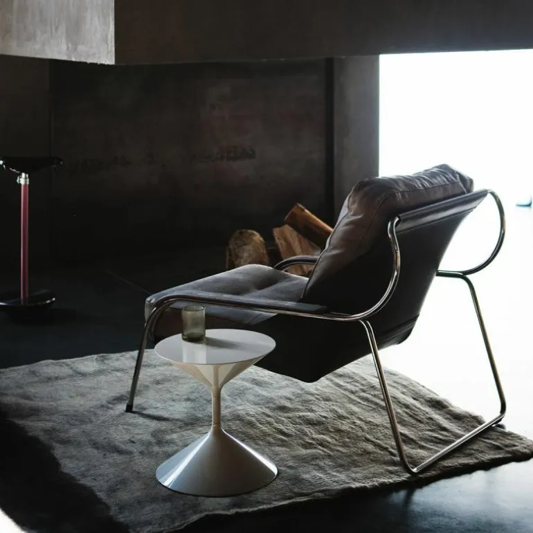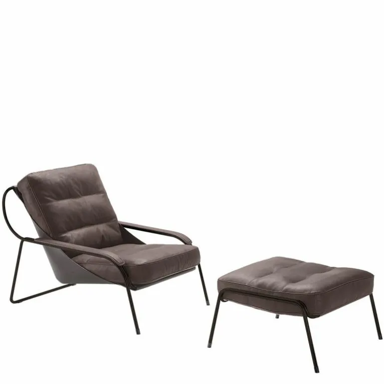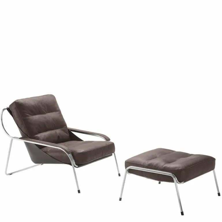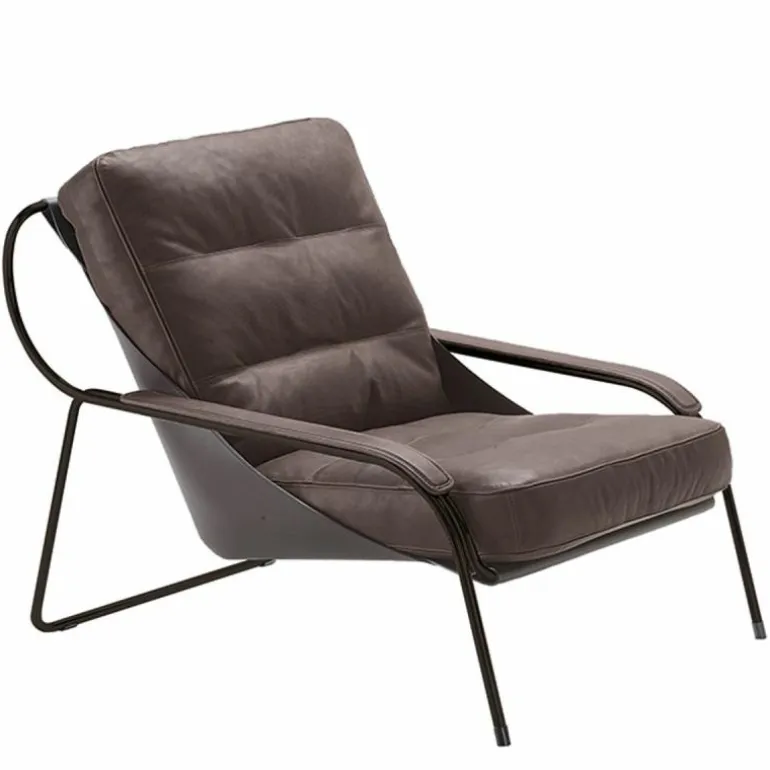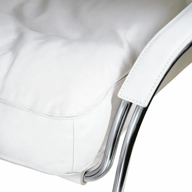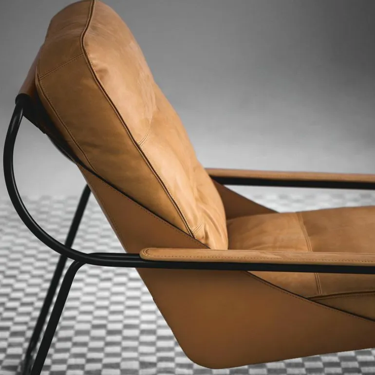 Het stalen buisframe is verkrijgbaar in een gepolijste afwerking, een zwartgeverfde afwerking of een nickel satin vergulde afwerking. De draagdoek die tussen het frame gespannen is vervaardigd van Pigmento 90 koeienhuid. Deze draagt twee kussens die kunnen worden gestoffeerd in vier verschillende leersoorten en ‘Ecofire’ stoffering. De gestoffeerde armleggers bestaan uit dezelfde stoffering als de kussens. De loungestoelen die direct online te bestellen zijn, beschikken over een zwart en gepolijst frame met aniline leder als stoffering. Informeer bij onze interieurspecialisten voor alle mogelijkheden of om een van de andere uitvoeringen te bestellen.