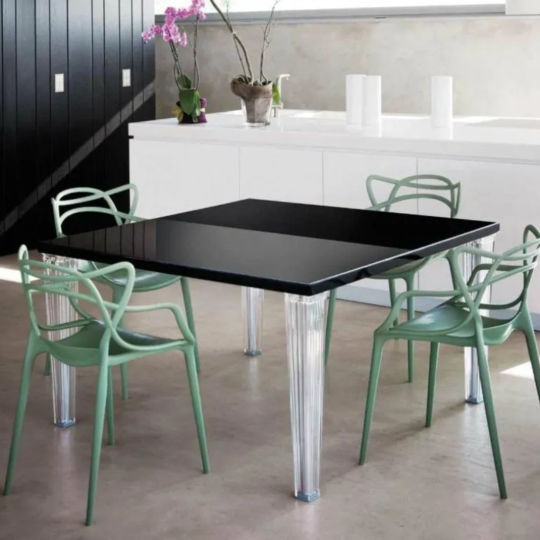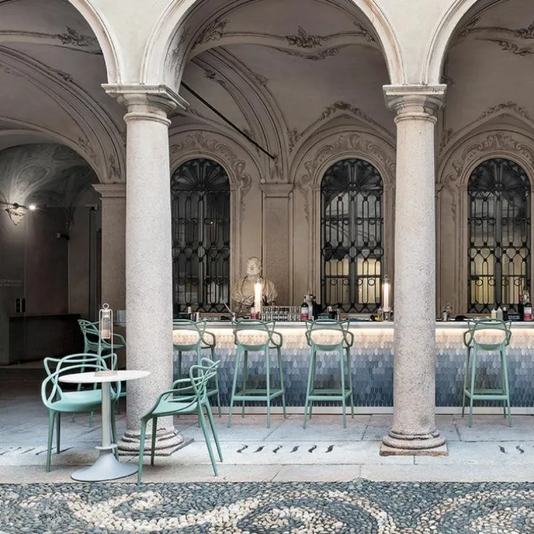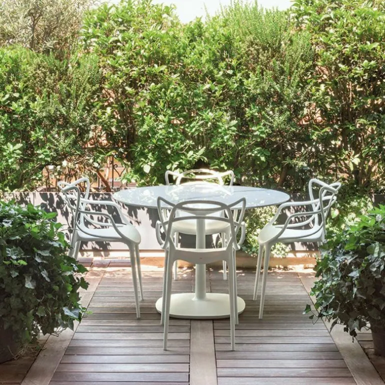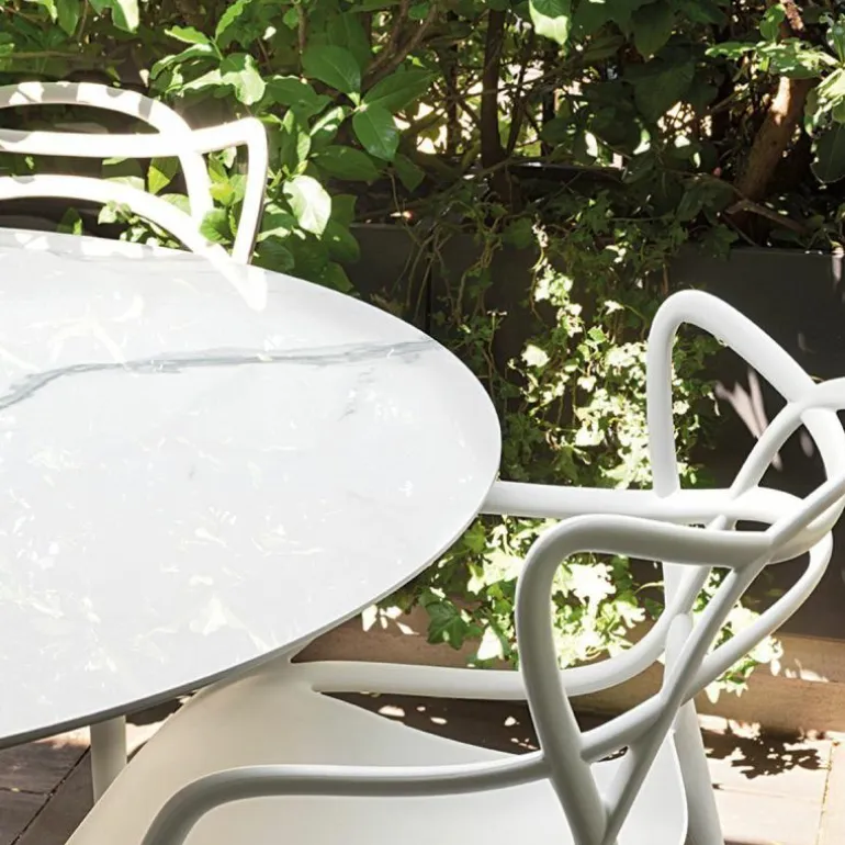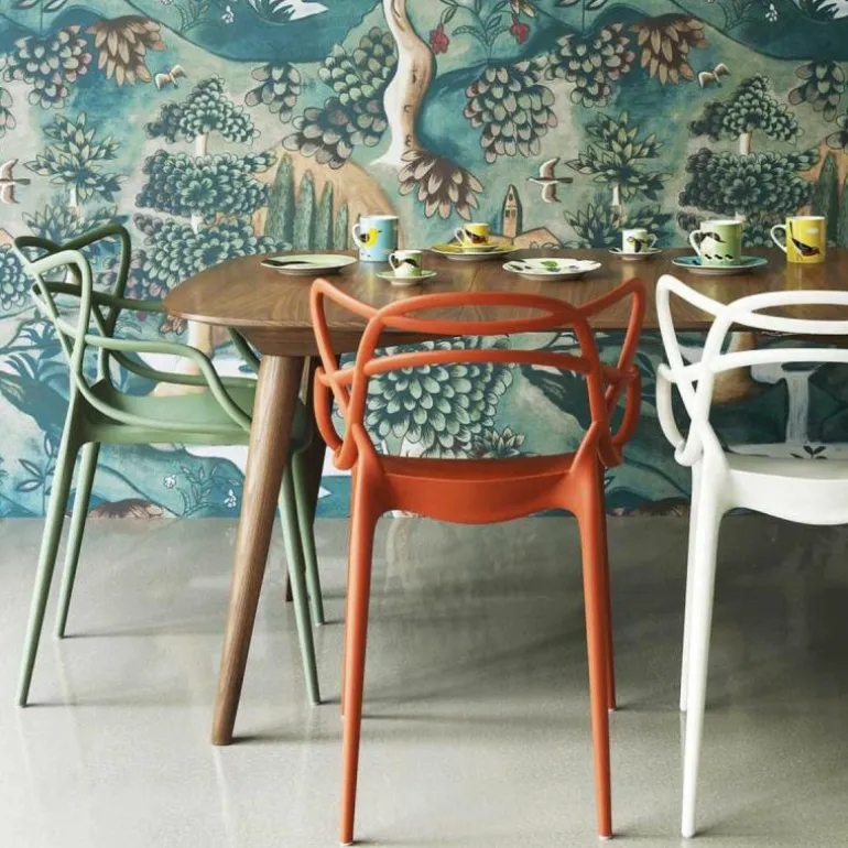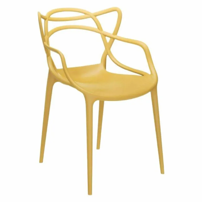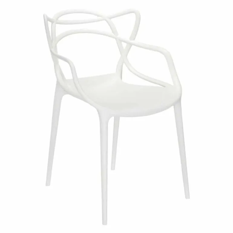 De Masters Stoel van Philippe Starck voor Kartell is een bijzonder fraai en doordacht ontwerp. De Franse designer van meerdere klassiekers uit de Kartell-collectie voegde drie beroemde silhouetten samen tot één stoel: de vlinderstoel van Arne Jacobsen, de tulpenstoel van Eero Saarinen en de Eiffel-stoel van Charles Eames. De herkenbare contouren van deze iconen vormen als buizenframe de arm- en rugleuningen. Philippe Starck over de Kartell Masters: “De meesterontwerpers die ons voorgingen hebben ons helpen vormen tot wie we nu zijn. In de Masters stoel weven de lijnen van drie bekende meesterwerken samen tot een nieuw product. Een nieuw project en een weerspiegeling van de huidige samenleving.”r