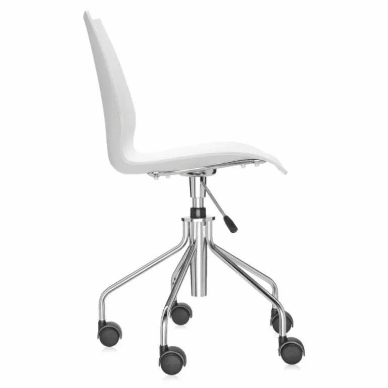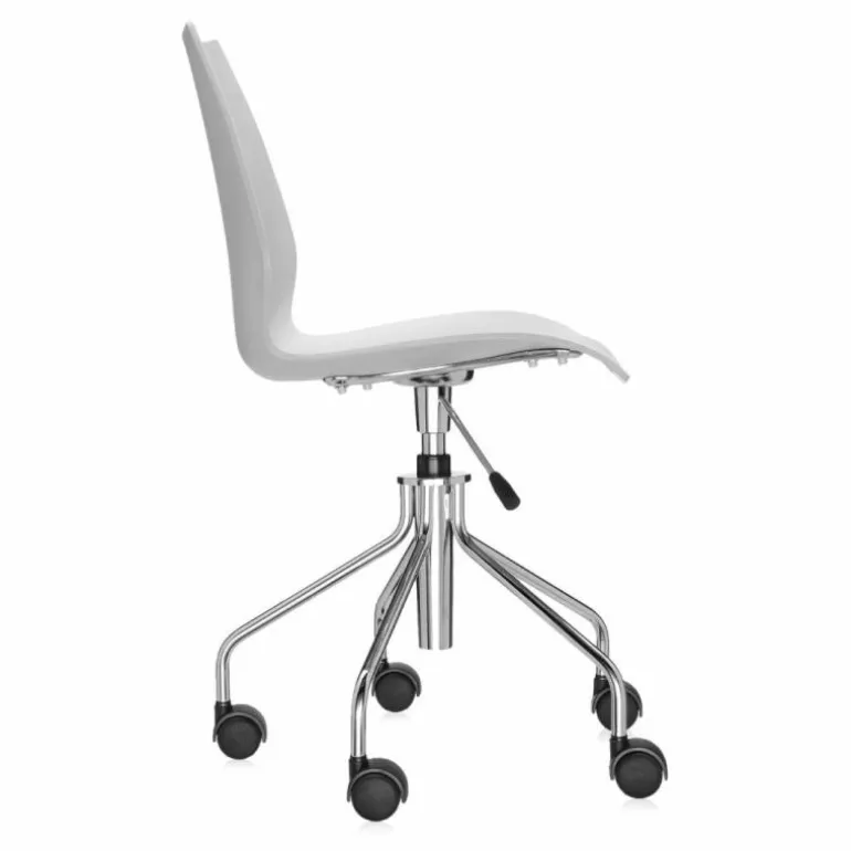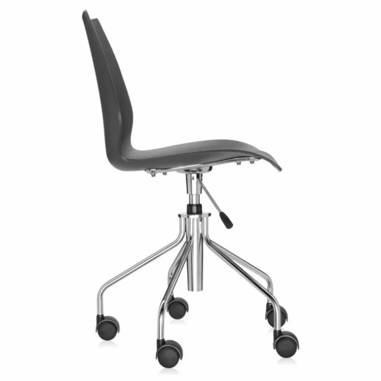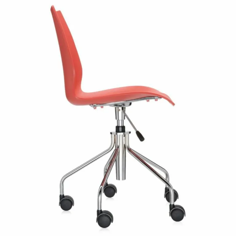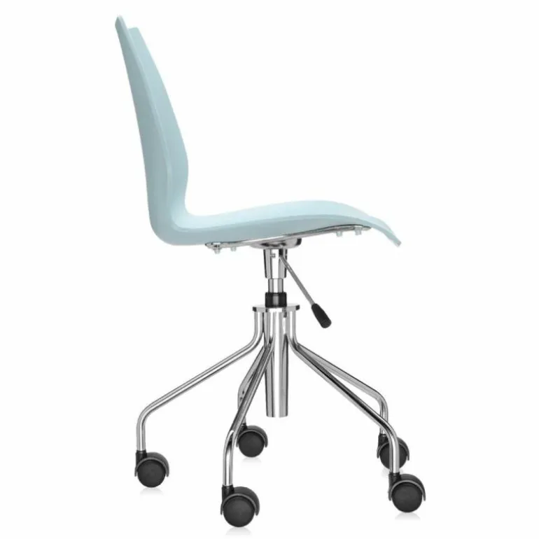 De Maui bureaustoel is beschikbaar met hydraulische pomp, zoals te zien is op de eerste 2 foto’s, en met of zonder armsteun (de overige foto’s zijn ter indicatie voor de kleuren). De zitting in polypropyleen is vastgemaakt aan een verchroomde stalen structuur. De wielen zijn vastgemaakt aan een verchroomde stalen basis met 5 spaken.