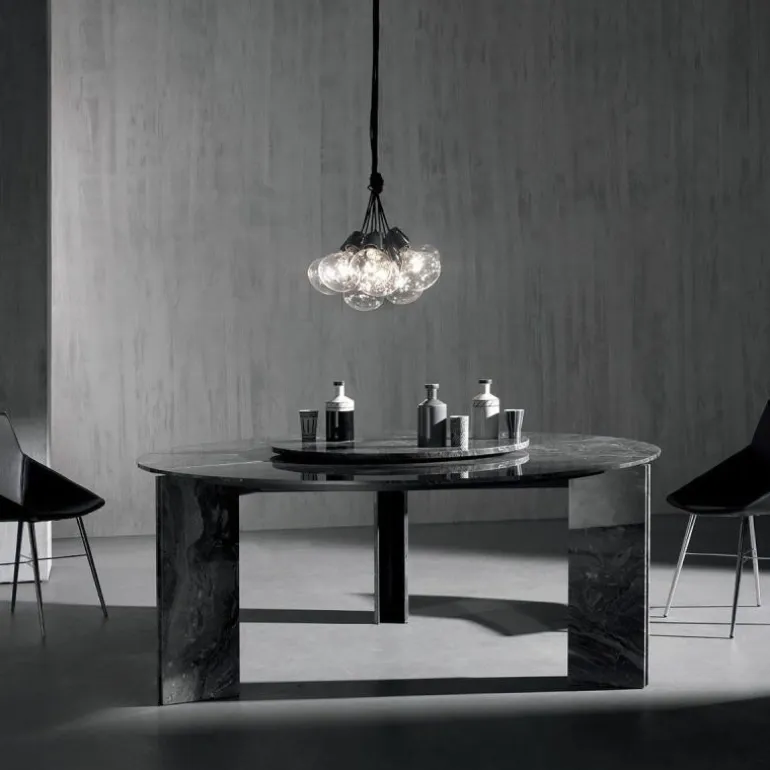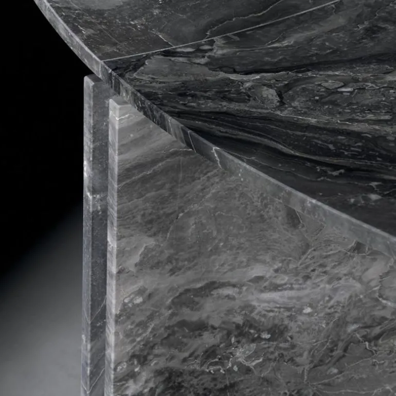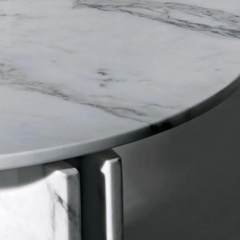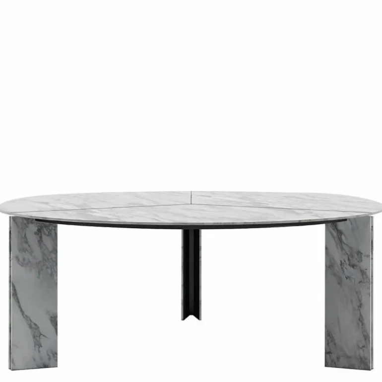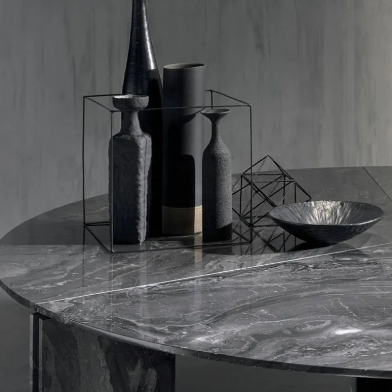 Dit ontwerp is verkrijgbaar in wit of grijs Arabescato marmer en Graphite Grey marmer. Het metaal is bij alle uitvoeringen marmer in ‘Slate Grey’ afgewerkt. Deze ronde tafel is uitgebracht met een diameter van 180 of 200 centimeter, en tevens verkrijgbaar in een vierkant of rechthoekig model.