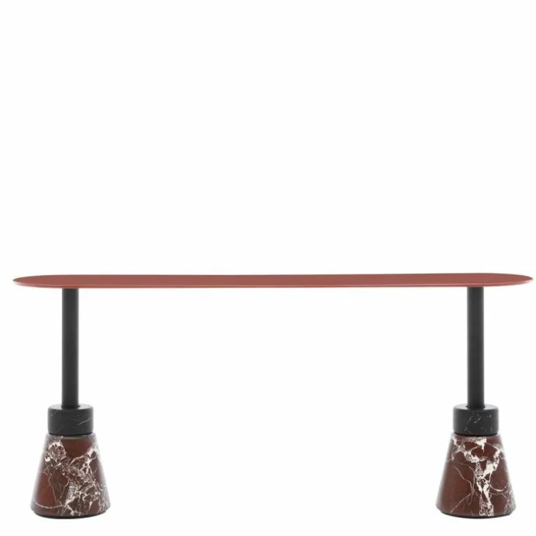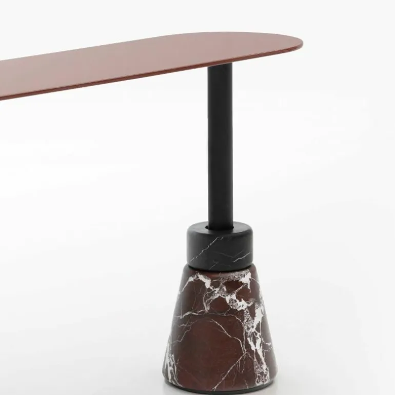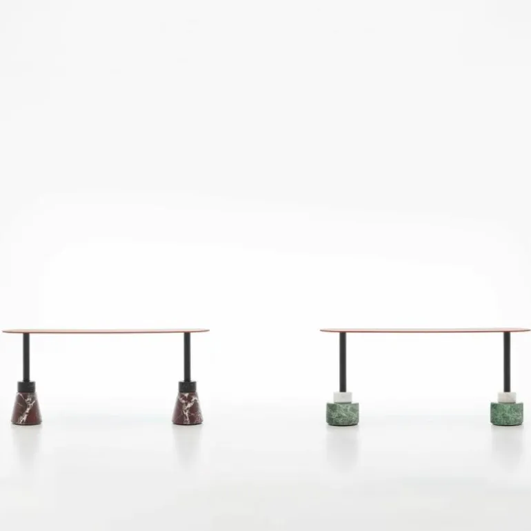 De sculpturale Menhir Salontafel Hoog heeft een onderstel vervaardigd uit matzwart gepoedercoat staal met een mat marmeren voet. De marmeren voet is verkrijgbaar in Carrara Statuario wit, Marquinia zwart, Levanto rood en Alpi groen. Het tafelblad heeft een dikte van 20 millimeter en is vervaardigd uit houtvezel met een glanzend gelakte afwerking in zwart, wit, linnen, sand, clay, burgundy, roze, donkergroen, mosterdgeel, brick red en navy blue. Bovendien is het tafelblad verkrijgbaar in geborsteld nerf fineer, zwart essenhout en donker gebeitst walnoothout. r
