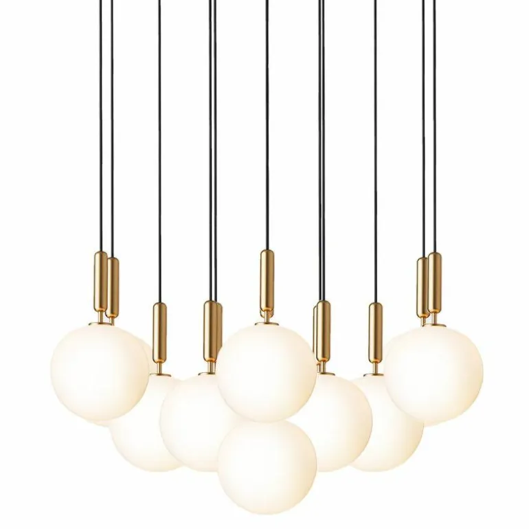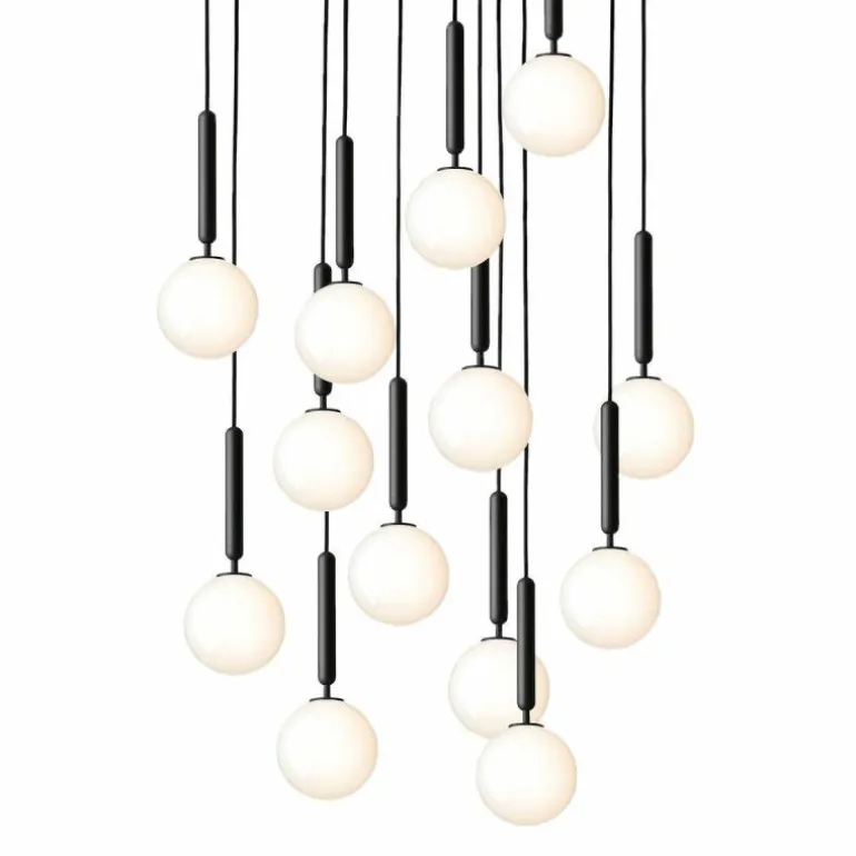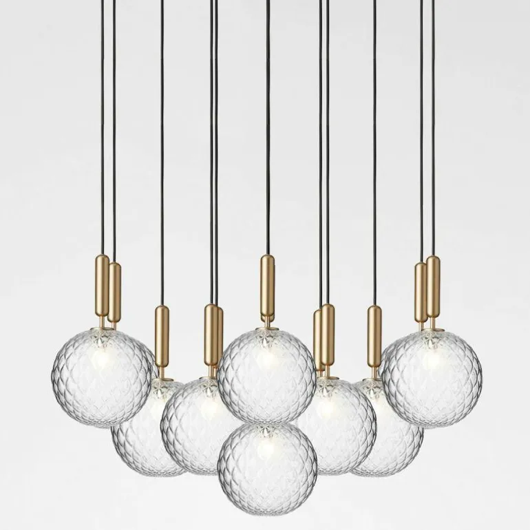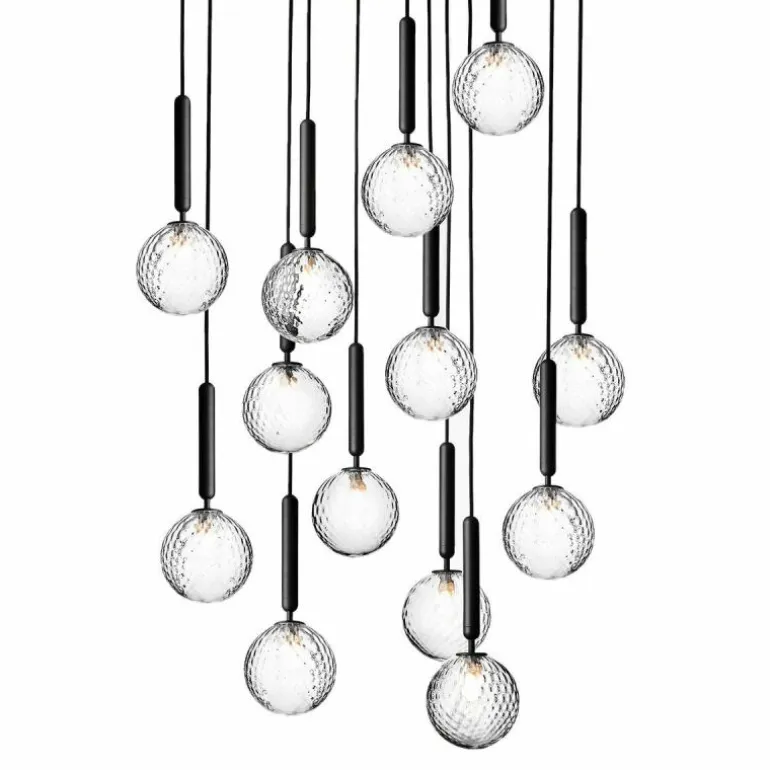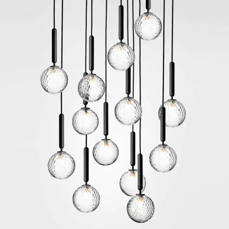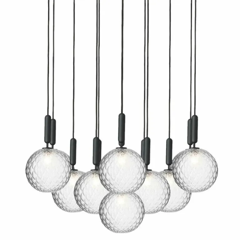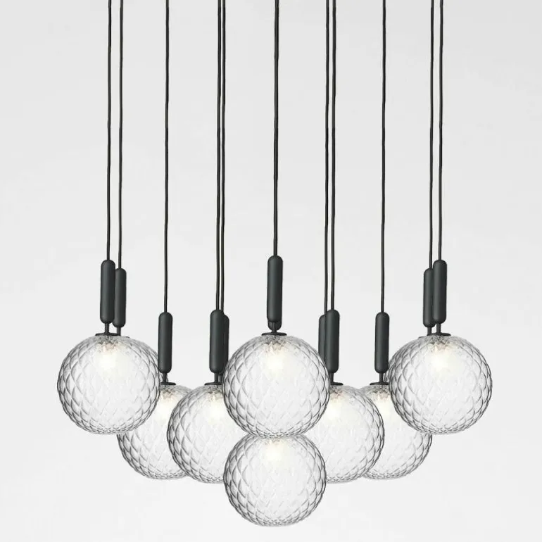 De Miira 13 telt zoals de naam weggeeft maar liefst dertien aparte lichtbronnen die samen een sfeervol en zwoel licht uitstralen. De lamp bestaat uit een dertiental metalen armaturen voorzien van de diepe kleur ‘Rock Grey’ of een afwerking in geborsteld messing. Aan de onderkant van zo’n armatuur bevindt zich een aansluiting voor een G9 LED lichtbron van maximaal 7 Watt. Deze wordt omhuld door een bolvormige mondgeblazen kap in semi-transparant opaal glas of transparant optisch glas. De lampen lopen middels een zwarte snoer in de meegeleverde plafondkap (Ø90 centimeter) en worden geleverd zonder lichtbron. Deze kunt u apart mee bestellen. r