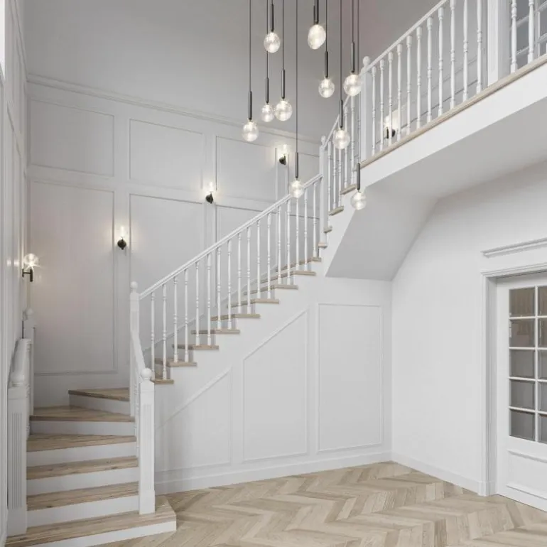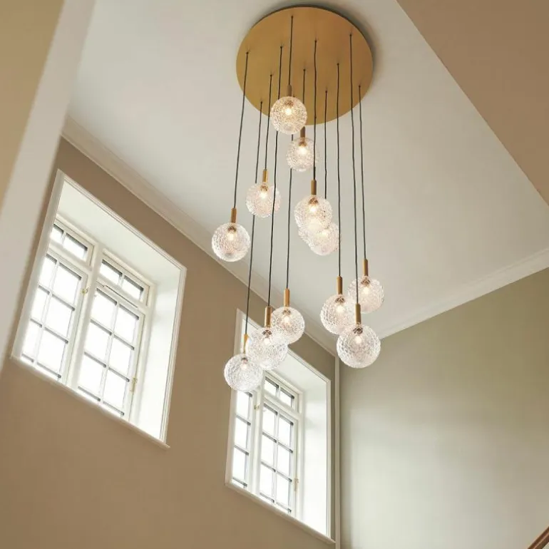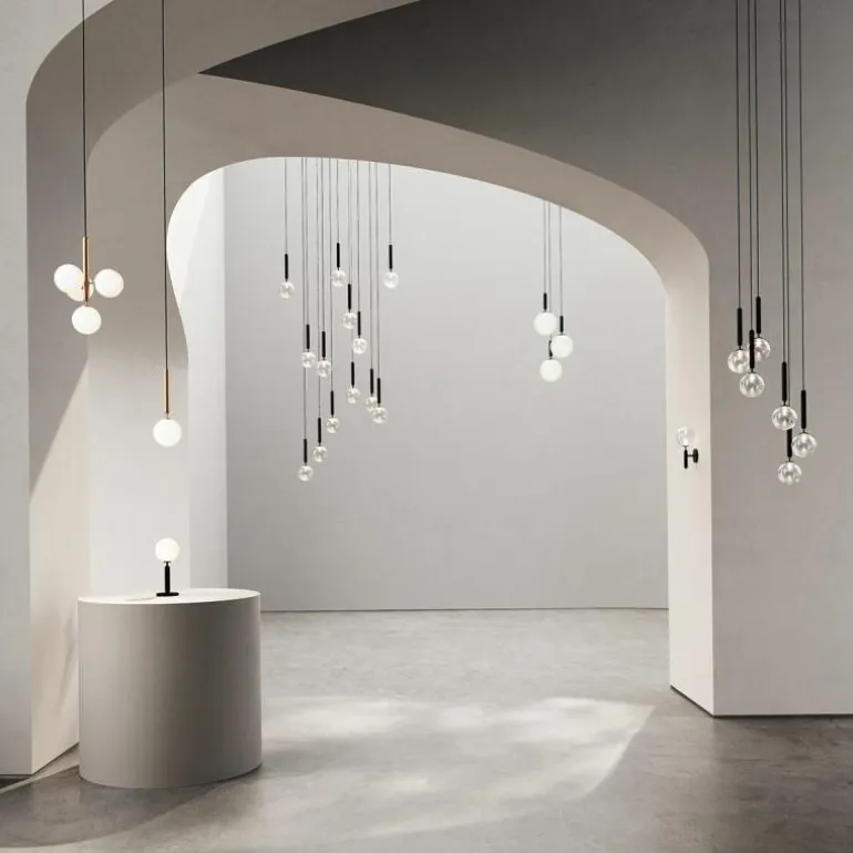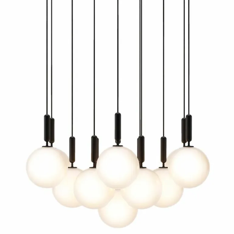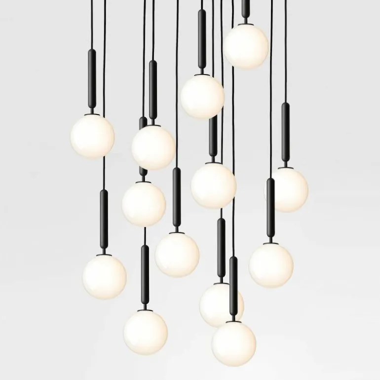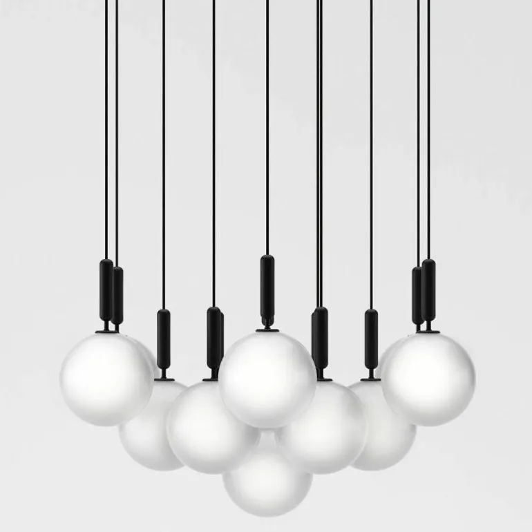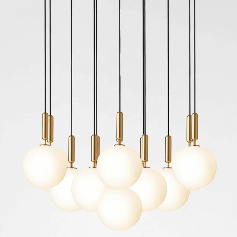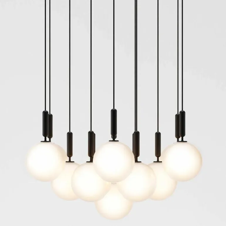 De Miira 13 telt zoals de naam weggeeft maar liefst dertien aparte lichtbronnen die samen een sfeervol en zwoel licht uitstralen. De lamp bestaat uit een dertiental metalen armaturen voorzien van de diepe kleur ‘Rock Grey’ of een afwerking in geborsteld messing. Aan de onderkant van zo’n armatuur bevindt zich een aansluiting voor een G9 LED lichtbron van maximaal 7 Watt. Deze wordt omhuld door een bolvormige mondgeblazen kap in semi-transparant opaal glas of transparant optisch glas. De lampen lopen middels een zwarte snoer in de meegeleverde plafondkap (Ø90 centimeter) en worden geleverd zonder lichtbron. Deze kunt u apart mee bestellen. r