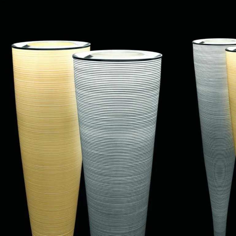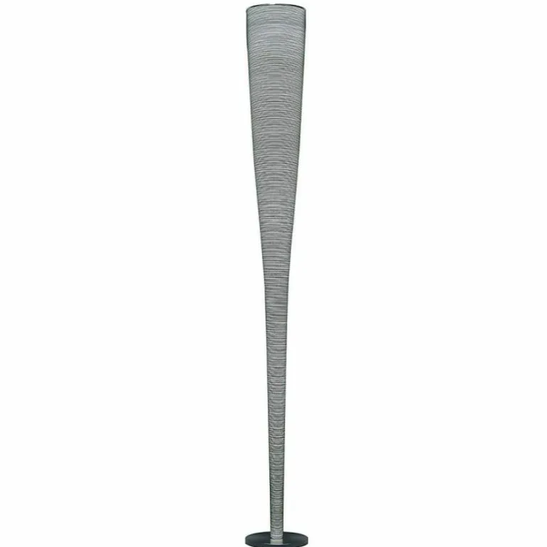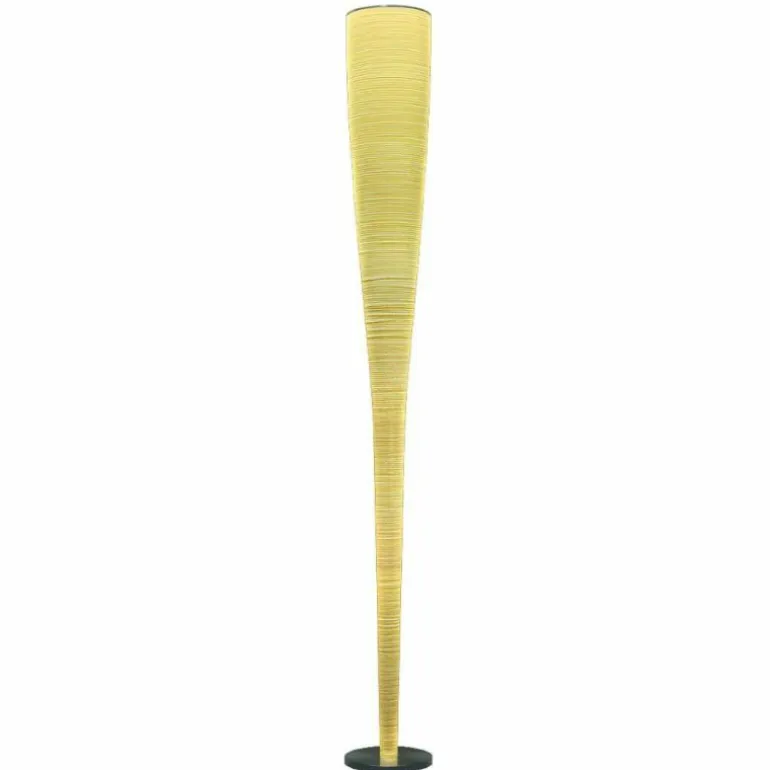 De vloerlamp heeft een chromen voet en de kap is gemaakt van fiberglas met zwart carbon draad en is verkrijgbaar in de kleuren zwart en geel.r