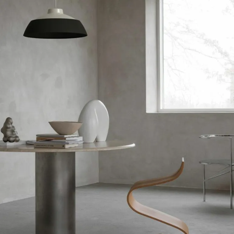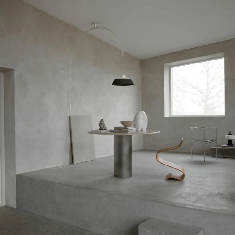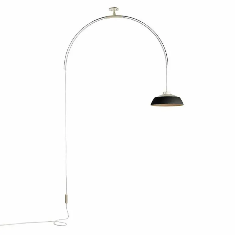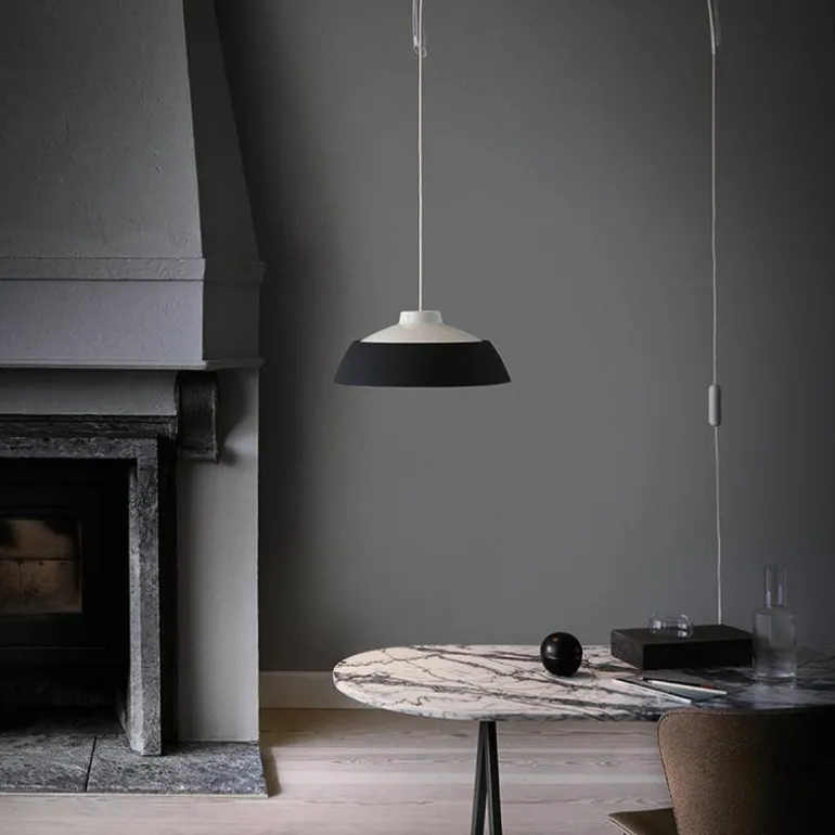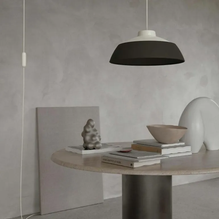 De buis is gemaakt van transparant kunststof. De lampenkap is gemaakt van twee gedraaide aluminium stukken die geverfd zijn in de kleuren wit en caviar grey. Zowel de plug voor de plafondbevestiging als het contragewicht zijn gemaakt van wit gelakt messing. In de heruitgave van dit design is de originele lichtbron vervangen door ledverlichting. Alle informatie over het bevestigen van de lamp en het aanpassen van de hoogte vindt u in de bijgevoegde instructie handleiding.