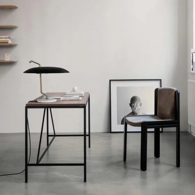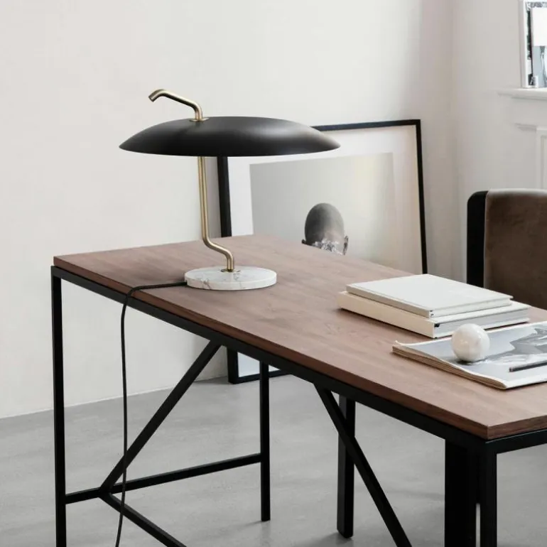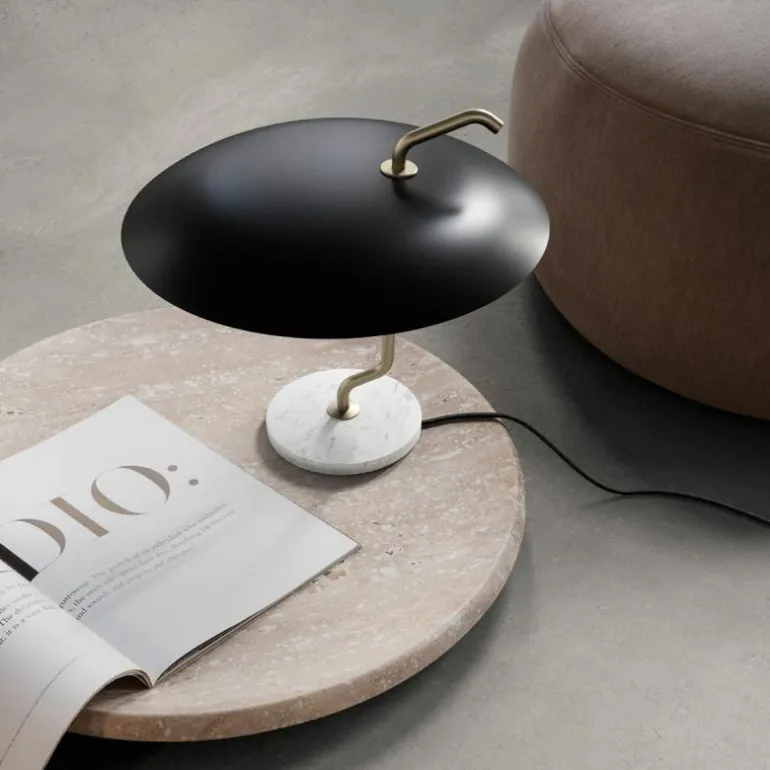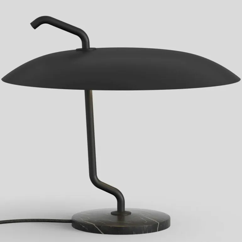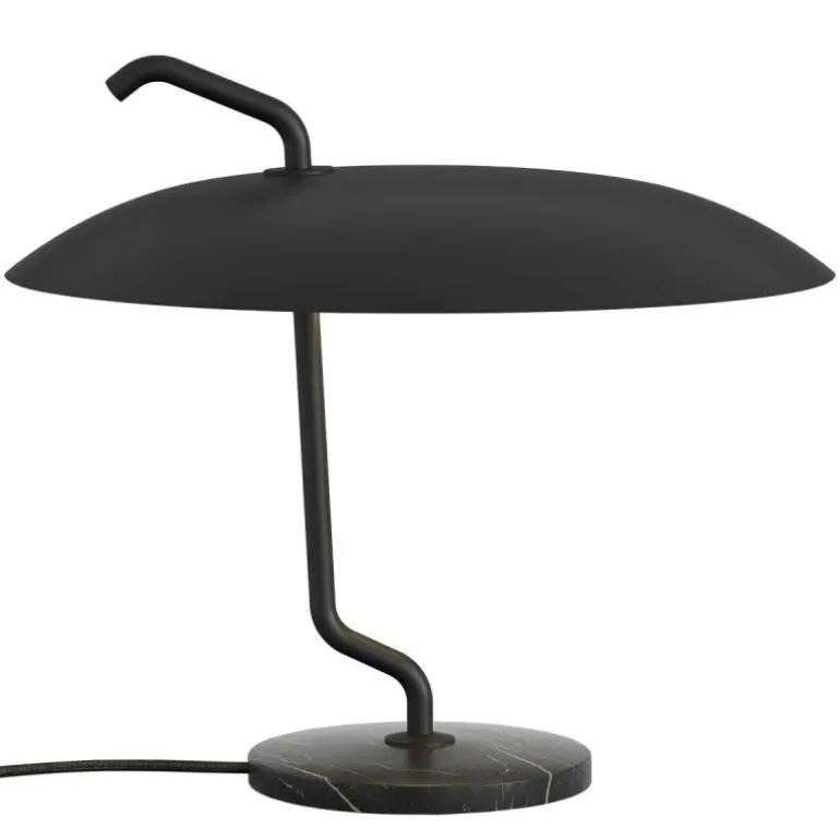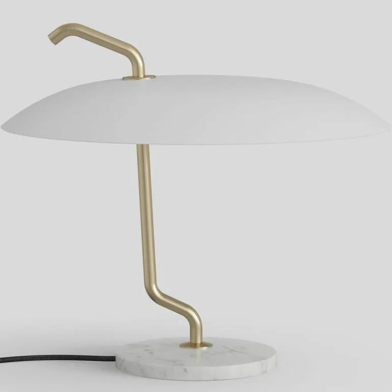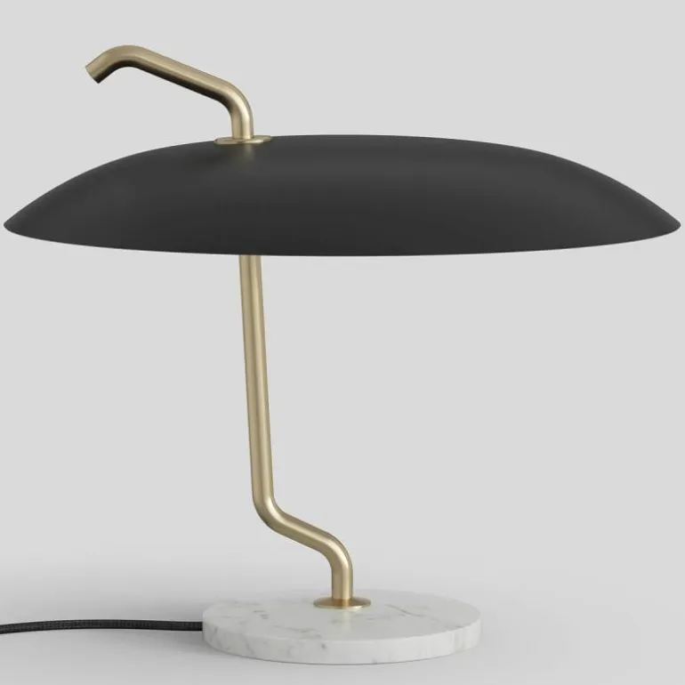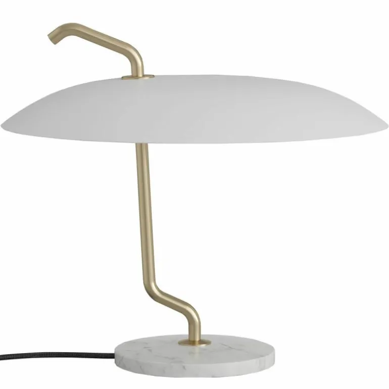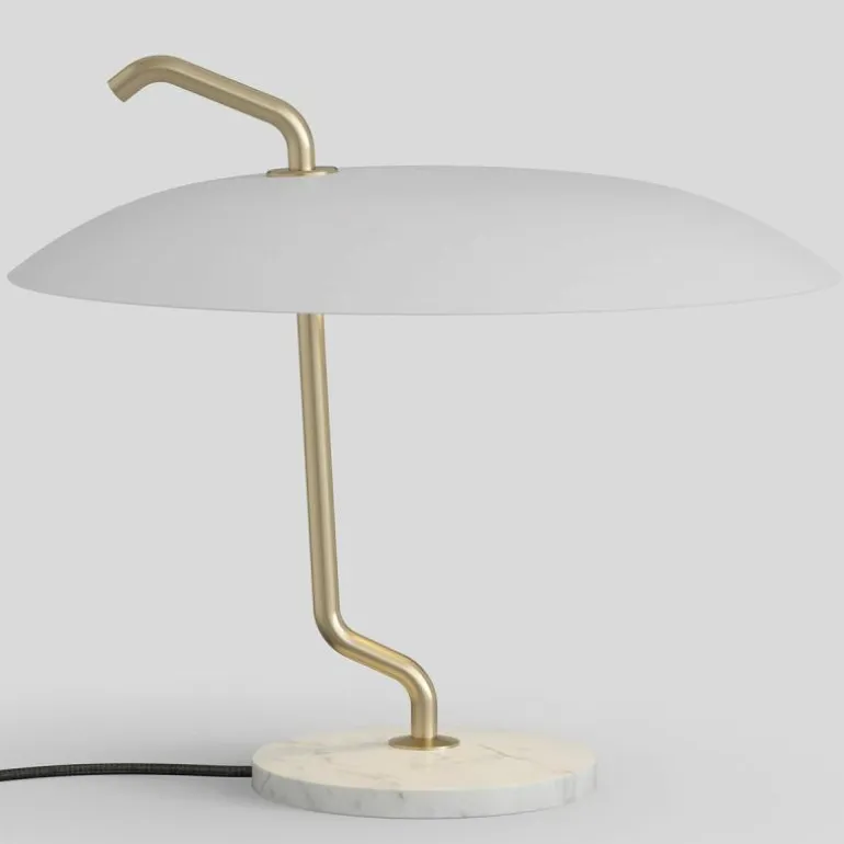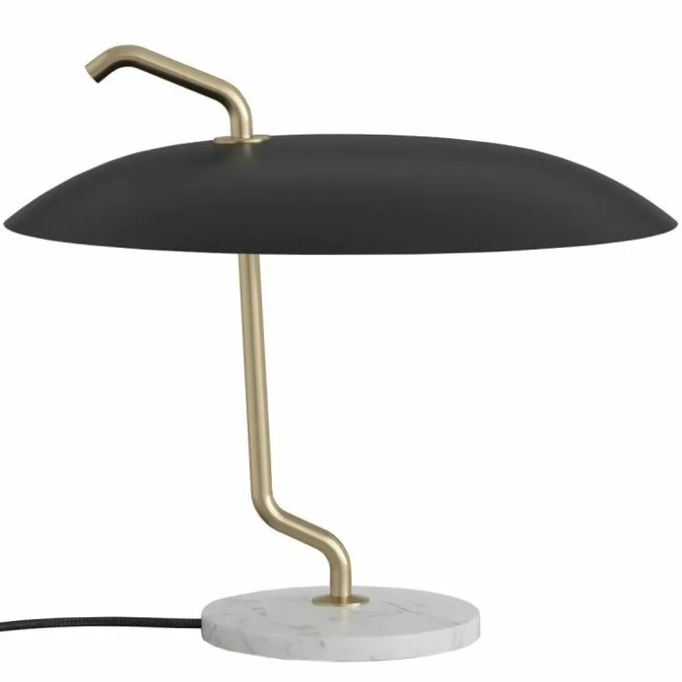 De voet is gemaakt van marmer en de daaraan bevestigde steel is gemaakt gelakt of geborsteld messing. De lampenkap is vervaardigd uit aluminium en gelakt in de kleur zwart of wit. Aan de bovenkant van de kap steekt de steel een stukje uit zodat de lamp makkelijk opgetild kan worden. U heeft de keuze uit drie mooie varianten.