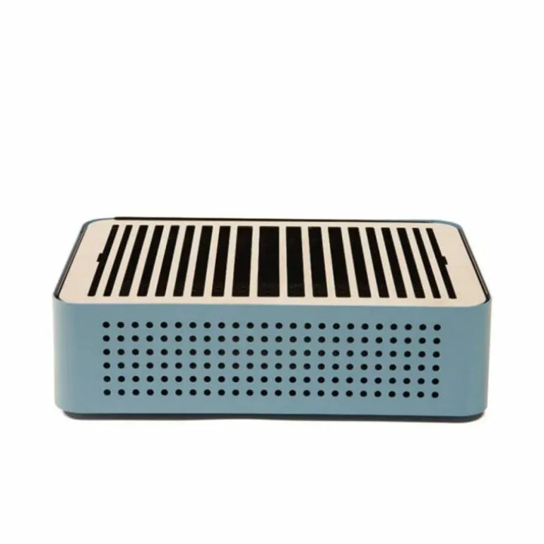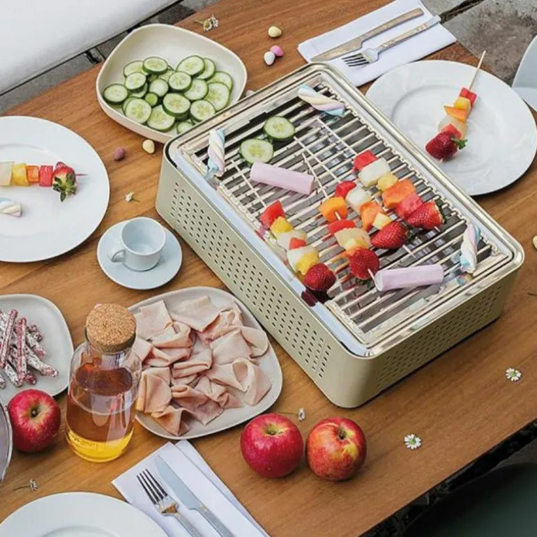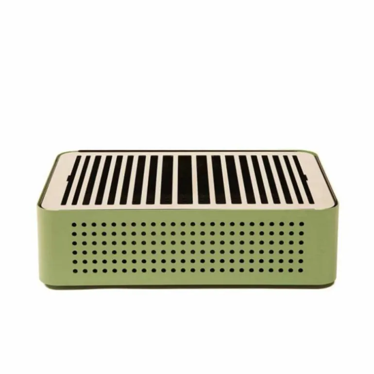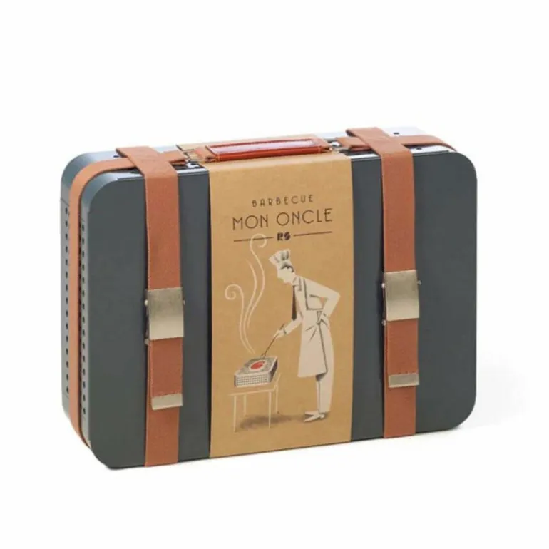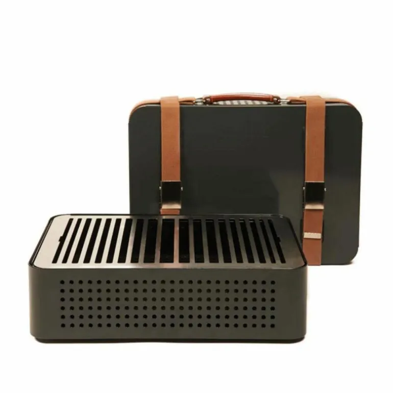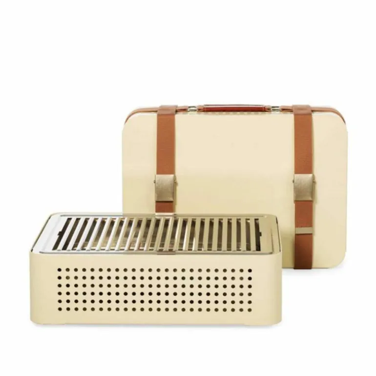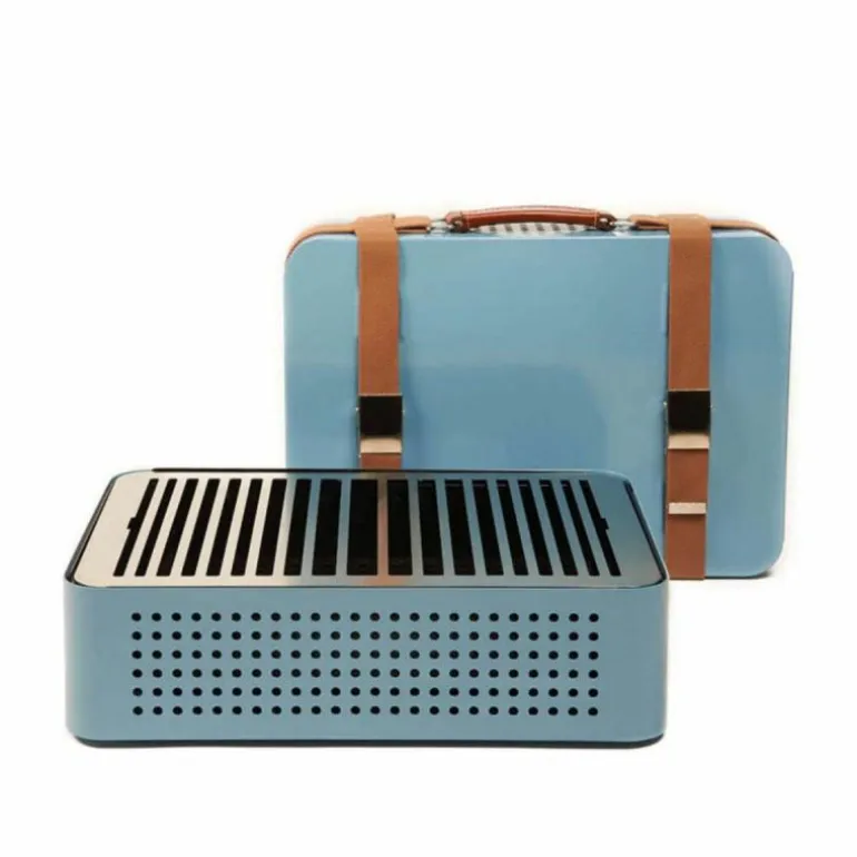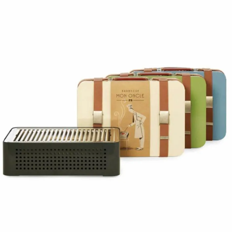 Deze kleine tafelbarbecue bestaat uit een grill en binnenzijde van roestvast staal, een geperforeerd stalen frame voorzien van polyester verf, een band van nylon en een lederen handvat. Naast de karakteristieke vintage uitstraling zorgt het geperforeerde oppervlak ervoor dat de luchtstroom wordt vergroot en de barbecue niet oververhit raakt. Deze handige barbecue is eenvoudig te demonteren en af te wassen, zelfs in de vaatwasser. De Mon Oncle is in diverse kleuren uitgebracht, die altijd een vrolijke sfeer met zich meebrengen.