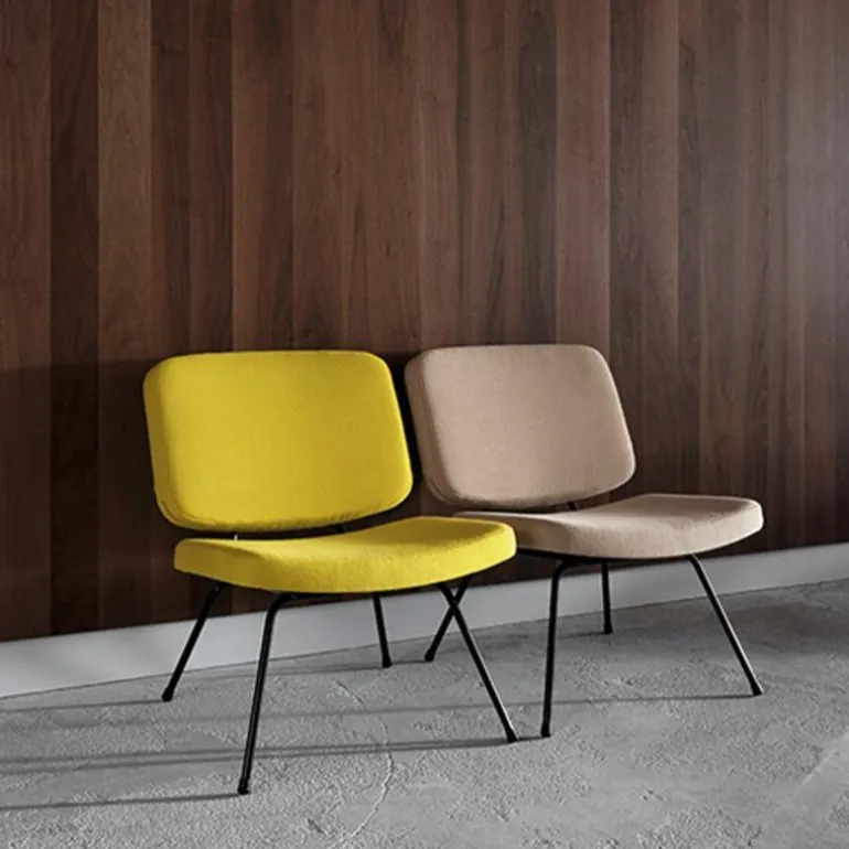 De Moulin Loungestoel heeft een ingetogen design dat wordt gecombineerd met een bijzonder zitcomfort. Kenmerkend is het slanke, stalen frame die de zitting en de rugleuning met elkaar verbindt. De comfortabele stoel is voorzien van een beklede rugleuning en zitting en is verkrijgbaar in verschillende kleur- en stofmogelijkheden. Bovendien is de loungestoel te bekleden in leder. Het onderstel is afgewerkt met een poedercoating in een kleur naar wens. Optioneel is de loungestoel te verrijken met armleuningen die naadloos overgaan in de licht gebogen zitting en rugleuning. r