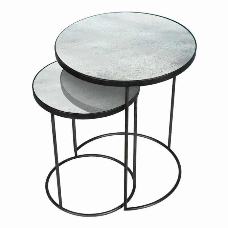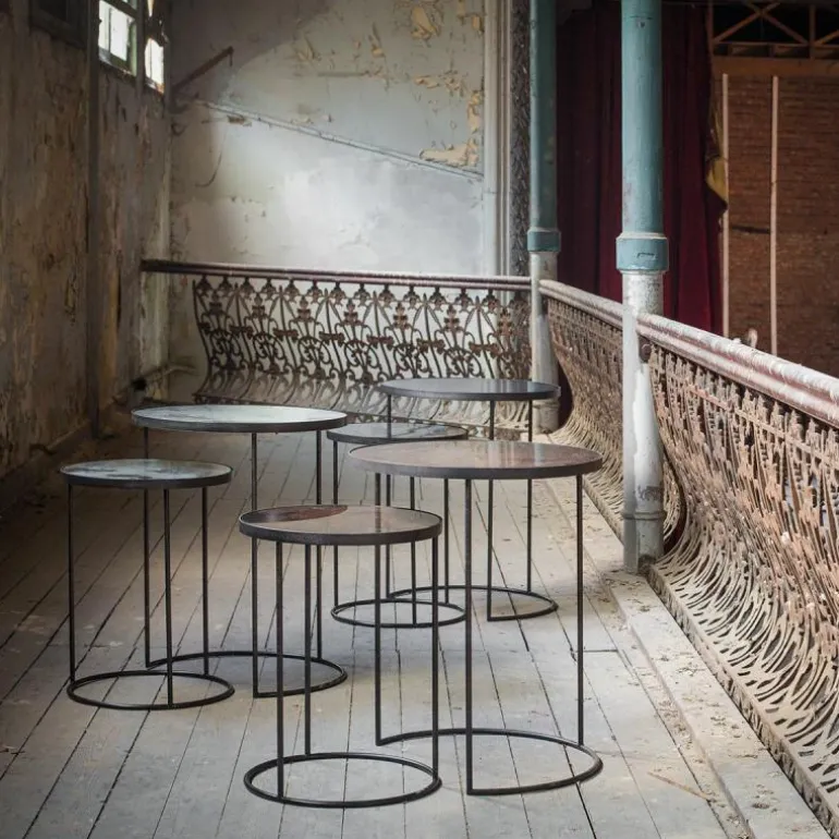 De bijzettafels hebben smalle poten van verweerd donkerbruin staal wat zorgt voor een industriële uitstraling. Door het tijdloze design passen deze tafels echter in ieder interieur. De bijzettafels kunnen uw zithoek perfect aanvullen, maar misstaan ook niet in de slaapkamer of werkkamer. Het hoogteverschil tussen beide bijzettafels zorgt voor dynamiek en diepte. Doordat de hoogste bijzettafel een uitsparing in de poten heeft is het mogelijk om de kleinere tafel eronder te schuiven. r
