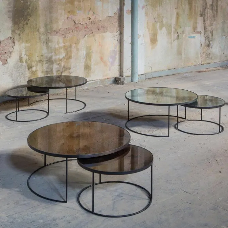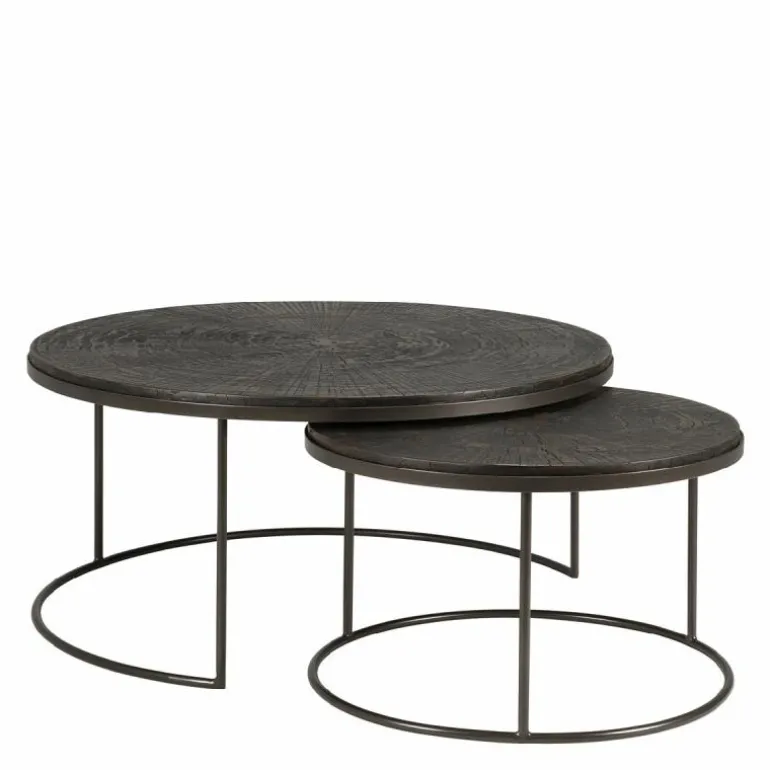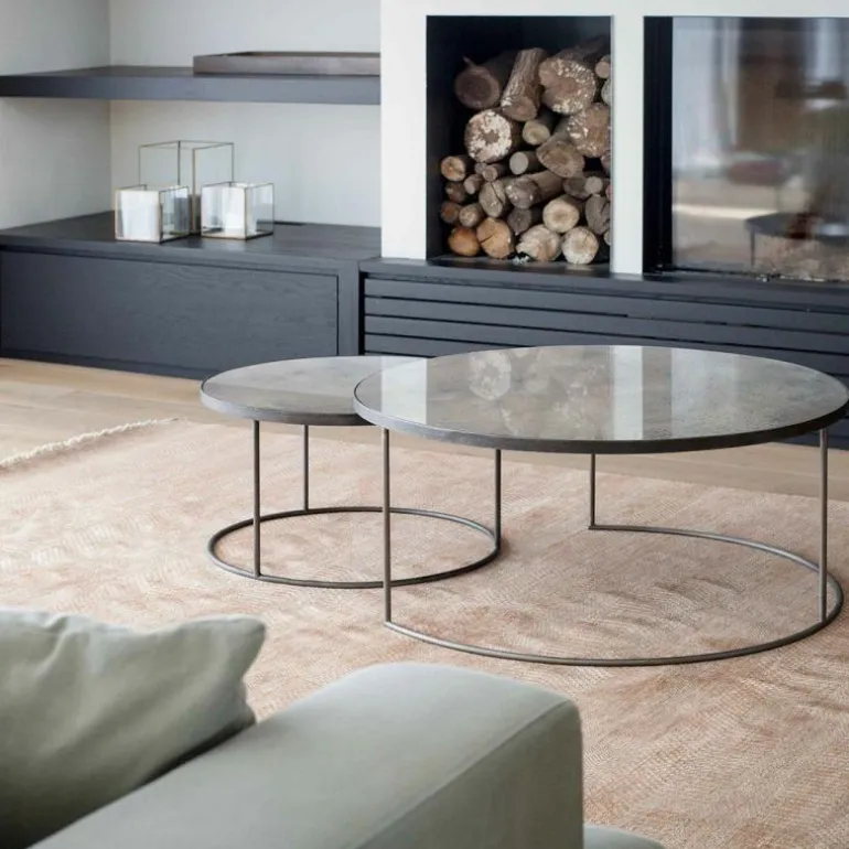 De poten van de salontafels zijn gemaakt van verweerd donkerbuin staal, waardoor ze een industriële look hebben. Het luxe en stijlvolle design zorgt er echter voor dat deze tafels in ieder interieur tot z’n recht komen, ook als u geen industriële stijl heeft. De grootste salontafel heeft een uitsparing bij de poten. Hierdoor kan de kleine salontafel eronder geschoven worden. Het hoogteverschil tussen beide tafels zorgt ervoor dat er meer diepte en dynamiek in uw interieur ontstaat. r