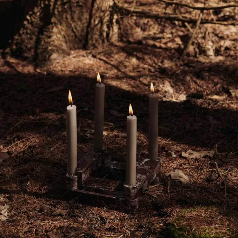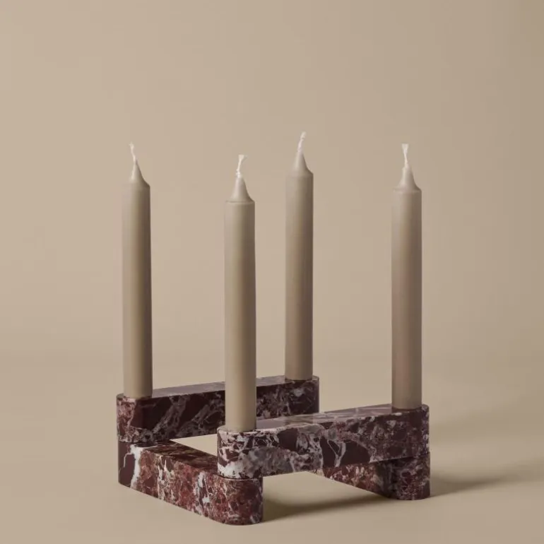 De Ferm Living Newel Modular Kandelaar is een decoratief object dat architectonische inspiratie combineert met ambachtelijk vakmanschap. Het ontwerp is opgebouwd uit vier afzonderlijke elementen die op elkaar kunnen worden gestapeld tot één geheel. Door de modulaire opbouw kan de kandelaar worden aangepast aan verschillende composities en ruimtes, waardoor variatie ontstaat in vorm en hoogte. Het ontwerp verwijst naar traditioneel metselwerk, waarbij de structuur zowel dragend als decoratief is.De kandelaar is volledig vervaardigd uit Rosso Levanto-marmer, een steensoort die bekendstaat om zijn diepe roodbruine kleur met subtiele witte aders. Dit natuurlijke materiaal geeft elk exemplaar een uniek karakter en zorgt voor een luxueuze uitstraling. Met een gewicht van 2,2 kilogram heeft de kandelaar een solide basis, waardoor deze stabiel blijft staan op verschillende oppervlakken. Door de warme kleurtint en de gladde afwerking vormt de kandelaar een opvallend middelpunt op een eettafel, dressoir of salontafel.De Newel Modular Kandelaar is ontworpen voor standaard dinerkaarsen. De gladde uitsparingen houden de kaarsen stevig op hun plaats en zorgen voor een uitgebalanceerde presentatie. De robuuste marmeren constructie maakt de kandelaar geschikt voor langdurig gebruik en behoudt zijn kwaliteit bij zorgvuldig onderhoud. Het materiaal is eenvoudig te reinigen met een licht vochtige doek. Het gebruik van schurende middelen of agressieve schoonmaakproducten wordt afgeraden om het oppervlak te beschermen.Aangezien marmer een natuurproduct is, kunnen lichte kleur- en structuurverschillen voorkomen. Deze variaties versterken de authenticiteit van het ontwerp en benadrukken de natuurlijke oorsprong van het materiaal. Bij gebruik is het belangrijk om de kaars te doven voordat het wasniveau de rand van de kandelaar bereikt en een brandende kaars nooit onbeheerd te laten.De Ferm Living Newel Modular Kandelaar is ontwikkeld als een sculpturaal object dat warmte en elegantie toevoegt aan het interieur. Door de combinatie van natuurlijke materialen, architectonische vormgeving en functionele veelzijdigheid is het een duurzaam ontwerp dat moeiteloos integreert in uiteenlopende interieurstijlen. De kandelaar vormt een verfijnd accent binnen de woonruimte en brengt balans tussen vorm, materiaal en licht.
