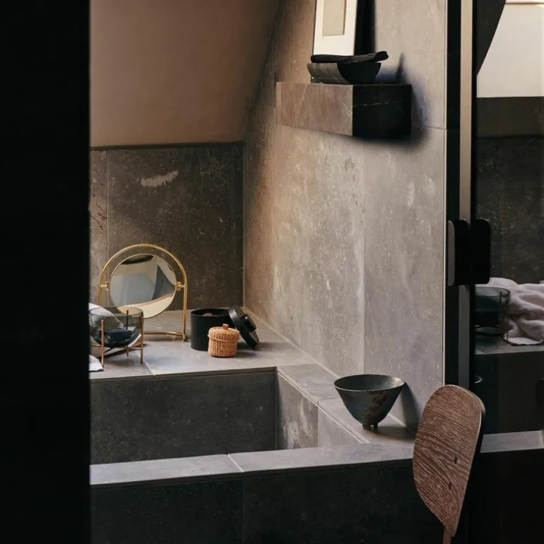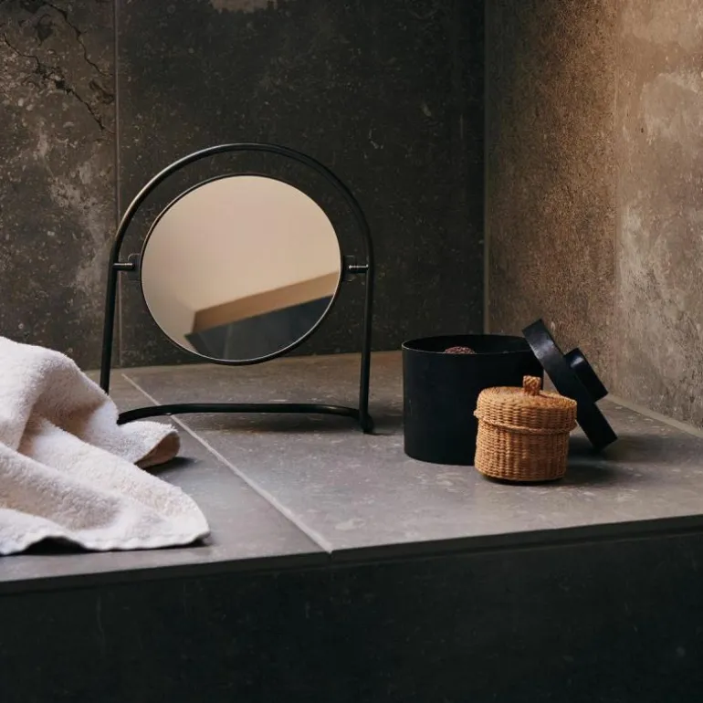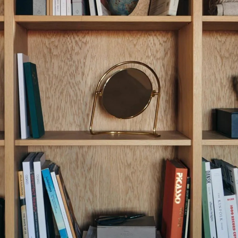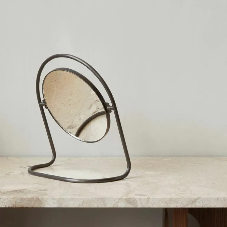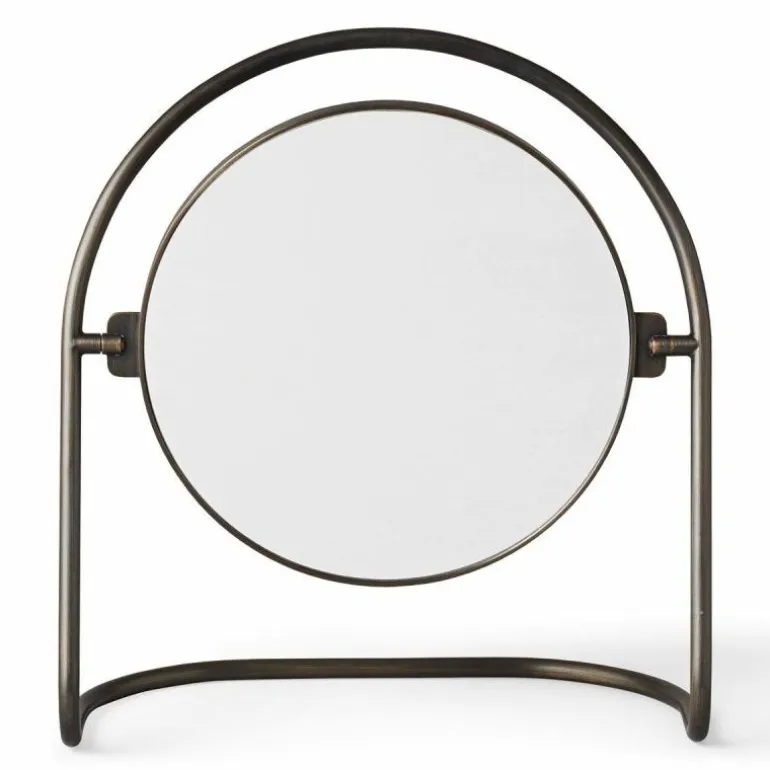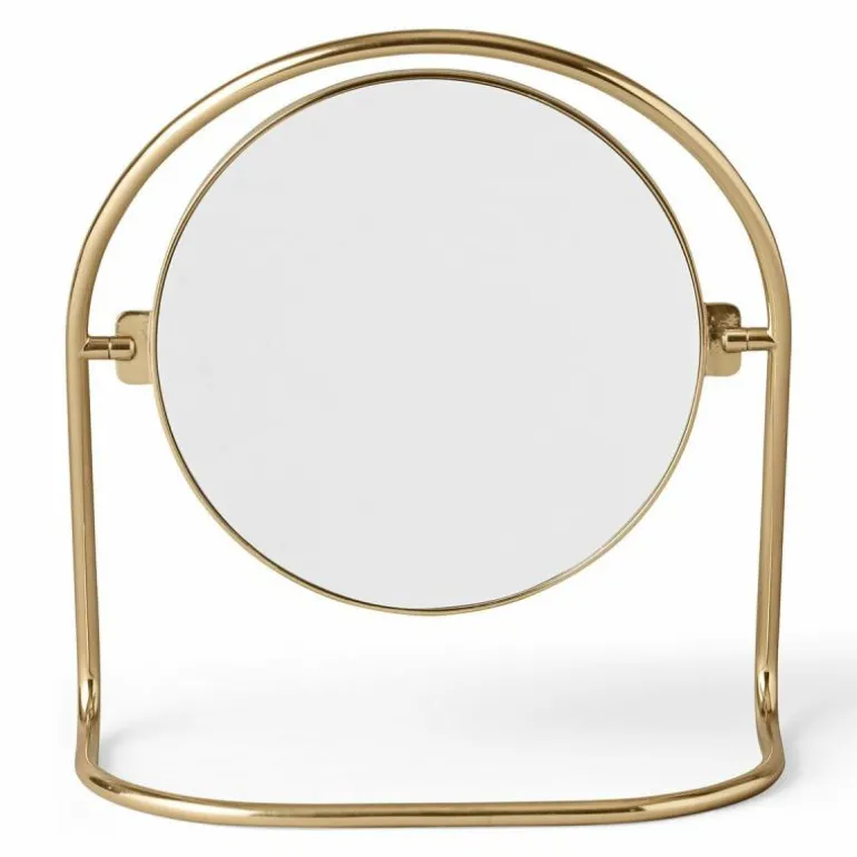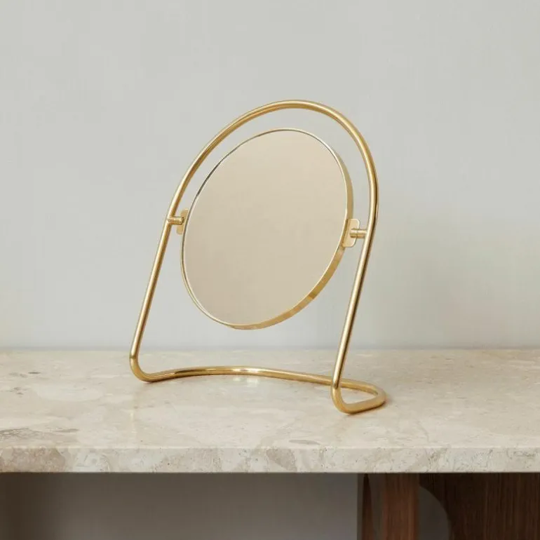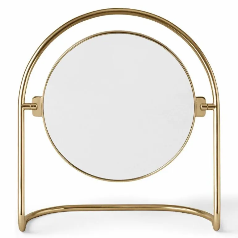 De Menu Nimbus Tafelspiegel is een ontwerp van Krøyer-Sætter-Lassen. Geïnspireerd op de manier waarop foto’s en schilderijen worden ingelijst, hebben de designers onderzocht hoe een spiegel omlijst kan worden zonder afbreuk te doen aan de schoonheid en reflectie van het weerspiegelende glas. De Nimbus serie is het resultaat: een moderne spiegel met een slank frame van messing dat net iets van het weerspiegelende glas af loopt. De gebogen lijnen in de Nimbus tafelspiegel lijken haast als een halo rondom het glas te lopen, wat een prachtige klassieke toets geeft aan het moderne ontwerp. Het weerspiegelende glas is kantelbaar dankzij twee mooie decoratieve schroeven, zo kunt u in iedere situatie altijd in de juiste hoek naar de spiegel kijken. r