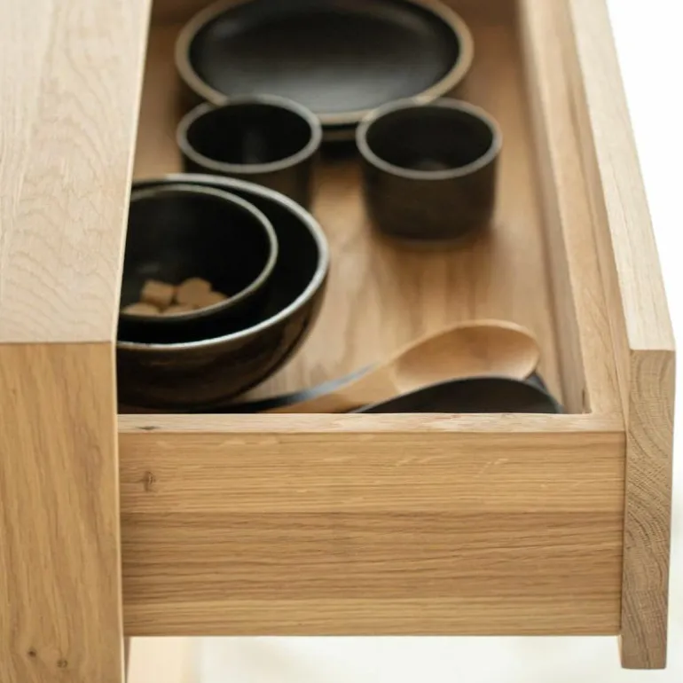 De eikenhouten variant heeft een afwerking van gepigmenteerde hardwaxolie. Afhankelijk van de gebruiksintensiteit is het verstandig om het meubel na een aantal jaren opnieuw te behandelen met een speciale olie. Een hardwaxolie voor eikenhout is direct mee te bestellen. Verwijder vlekken direct met een licht vochtige doek en milde zeep.r