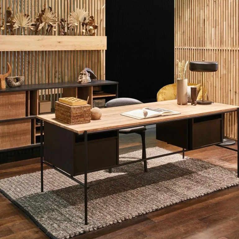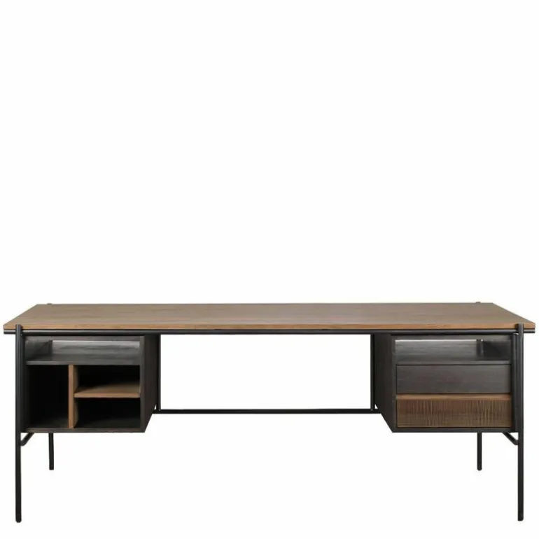 - Het model met kastjes bestaat uit een massief teakhouten tafelblad en een zwart metalen frame, waar twee kastjes van massief teakhout met een zwarte vernislaag aan bevestigd zijn. Binnen deze kastjes vormen verschillende vakken en lades een interessante compositie aan opbergruimte. Dit model is b. 200 x h. 76 x d. 90 centimeter.