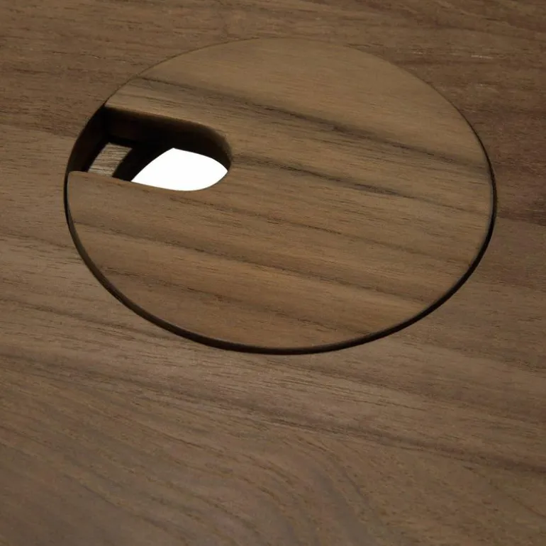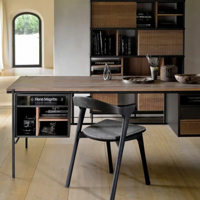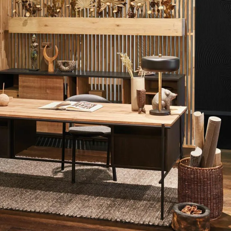 - De variant zonder kastjes bestaat uit een zwart metalen frame welke een massief teakhouten blad draagt, deze open constructie is ideaal voor liefhebbers van minimalistisch design. Dit model is te bestellen in twee afmetingen: b. 140 x h. 76 x d. 70 centimeter en b. 160 x h. 76 x d. 80 centimeter en is voorzien van een geïntegreerd kabelbeheer.
