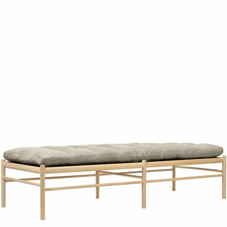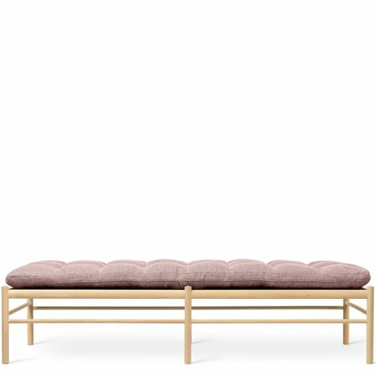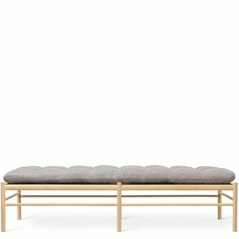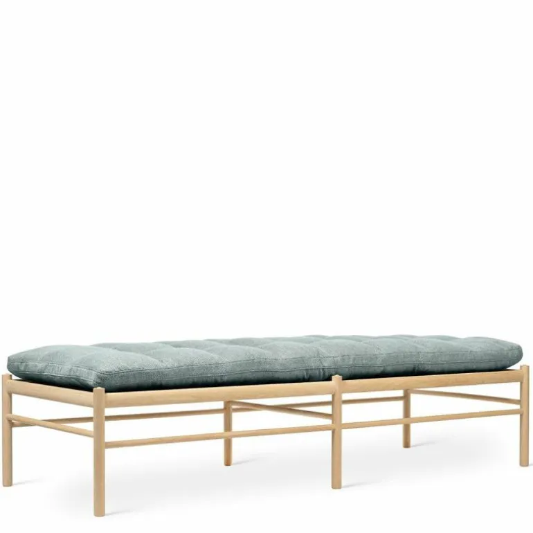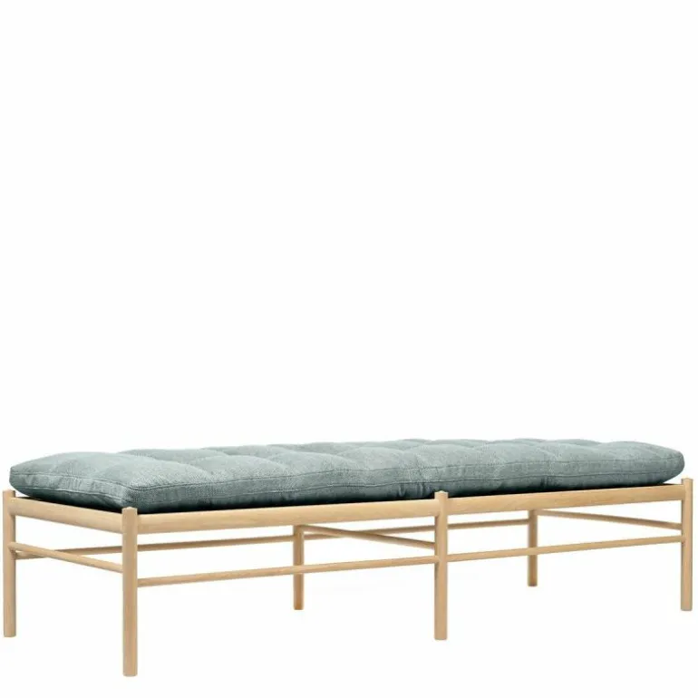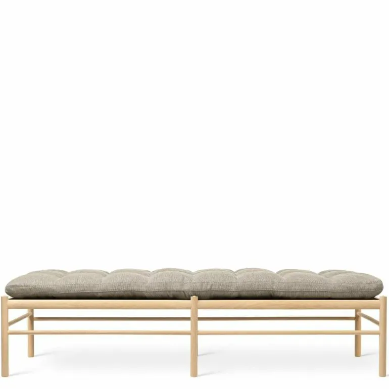 Het lange kussen dat uit één stuk bestaat lijkt vlak boven het frame te zweven. Het tegendeel is waar, want het kussen wordt ondersteund door geweven banden. Delicaat en tegelijkertijd erg sterk net zoals de massief eiken constructie waar de banden in gespannen zijn. Het strakke frame van het daybed is eenvoudig en elegant. Het rechte lijnenspel van het frame rijmt met dat van het kussen. Het geometrische element komt tot uiting in het kussen door het simpele vierkante patroon dat ontstaat door de knopen die met de hand op het kussen genaaid worden. Voor extra comfort en ontspanning is er nog een los cilindervormig nekkussen bij te bestellen. De OW150 is in een aantal varianten direct te bestellen. Zit uw favoriete kleur of stofsoort er niet tussen? Neem dan contact op met onze interieuradviseurs. Zij vertellen u graag over de mogelijkheden!r