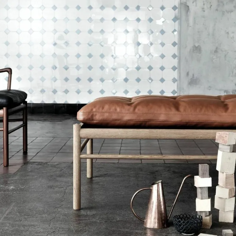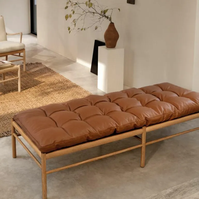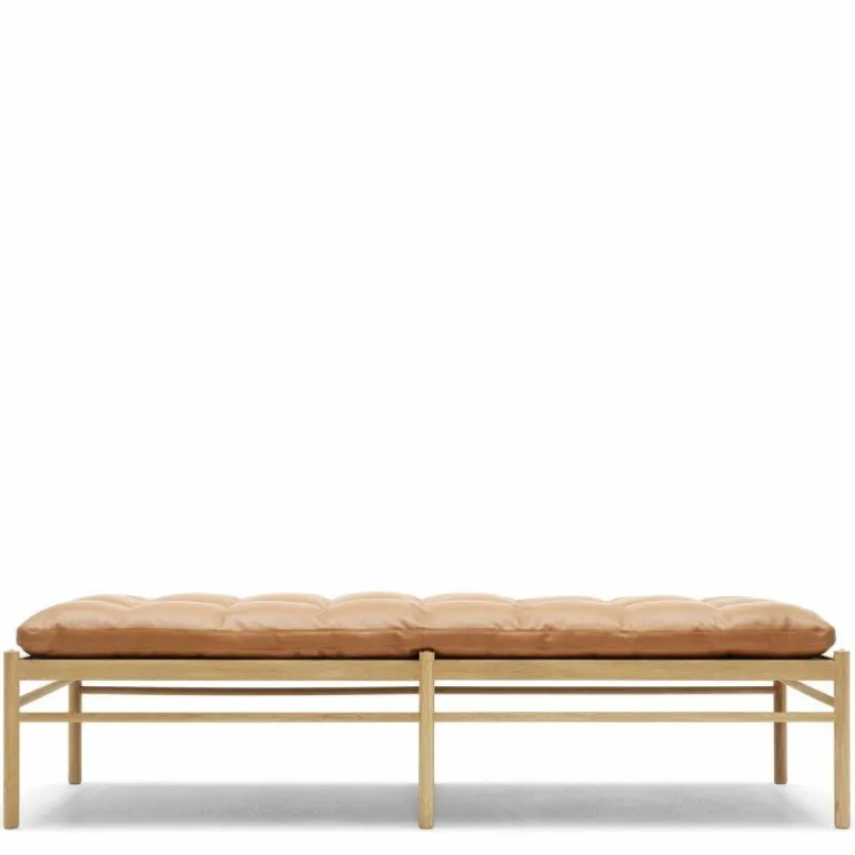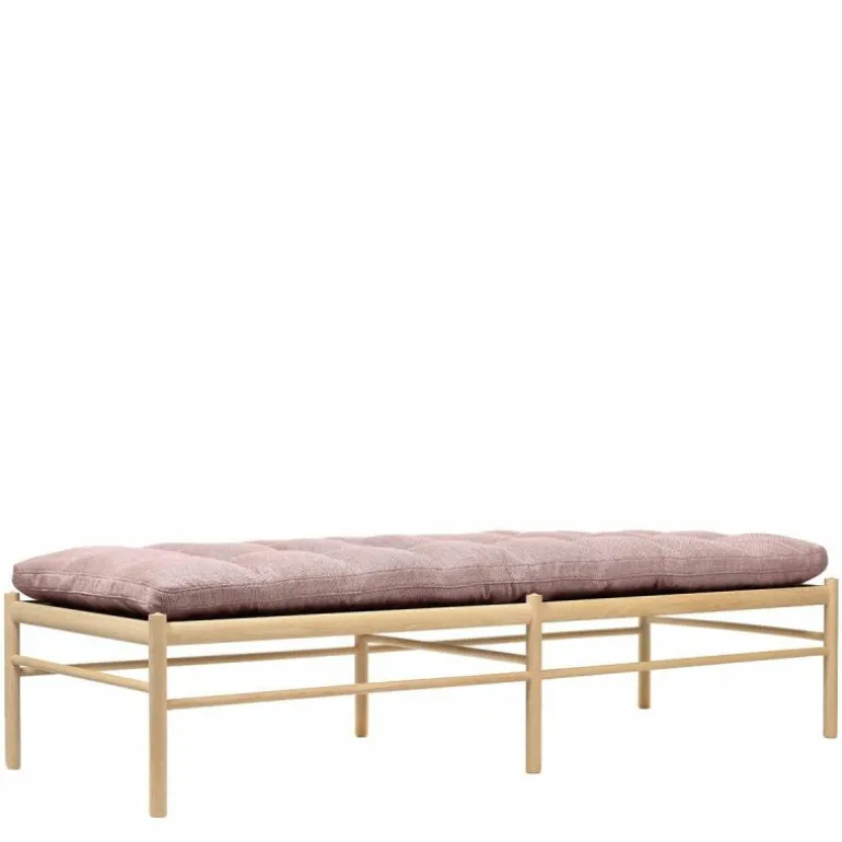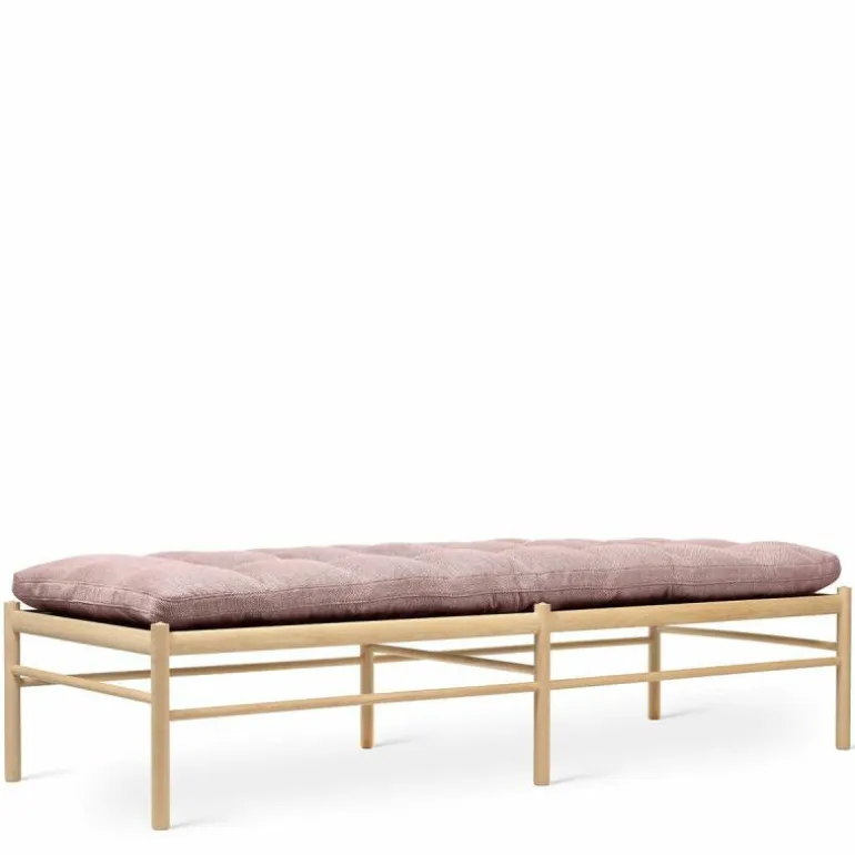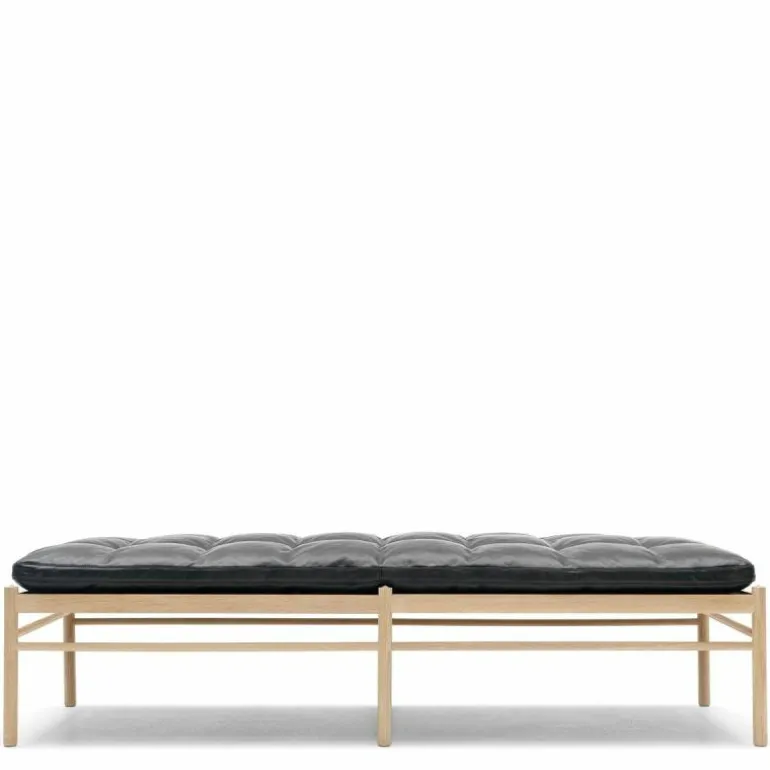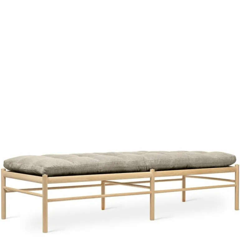 Het lange kussen dat uit één stuk bestaat lijkt vlak boven het frame te zweven. Het tegendeel is waar, want het kussen wordt ondersteund door geweven banden. Delicaat en tegelijkertijd erg sterk net zoals de massief eiken constructie waar de banden in gespannen zijn. Het strakke frame van het daybed is eenvoudig en elegant. Het rechte lijnenspel van het frame rijmt met dat van het kussen. Het geometrische element komt tot uiting in het kussen door het simpele vierkante patroon dat ontstaat door de knopen die met de hand op het kussen genaaid worden. Voor extra comfort en ontspanning is er nog een los cilindervormig nekkussen bij te bestellen. De OW150 is in een aantal varianten direct te bestellen. Zit uw favoriete kleur of stofsoort er niet tussen? Neem dan contact op met onze interieuradviseurs. Zij vertellen u graag over de mogelijkheden!r