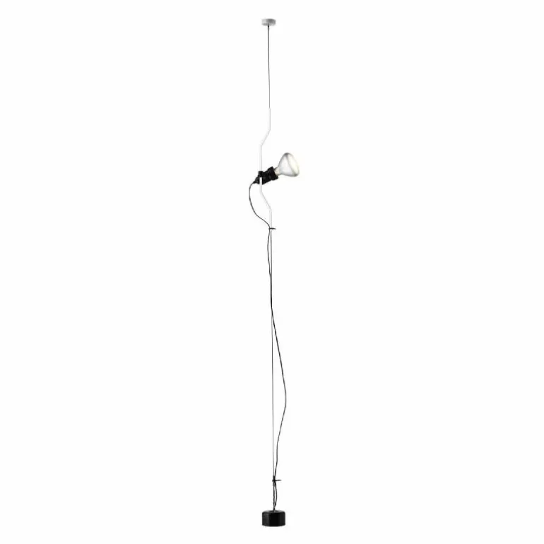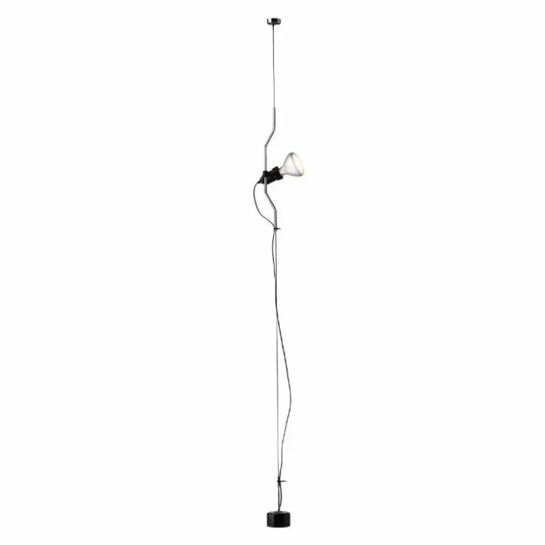 De constructie bestaat uit een stalen kabel die van plafond tot vloer wordt gespannen en een lengte heeft van circa 4000 millimeter. Langs deze kabel beweegt een gevormde stalen buis die verticaal verstelbaar is. Door deze verplaatsing kan de lichtbron eenvoudig op de gewenste hoogte worden gepositioneerd. De buis is afgewerkt in gelakt staal of nikkel, afhankelijk van de uitvoering. Deze opbouw maakt het mogelijk om de lamp aan te passen aan verschillende ruimtelijke situaties zonder vaste montagepunten.