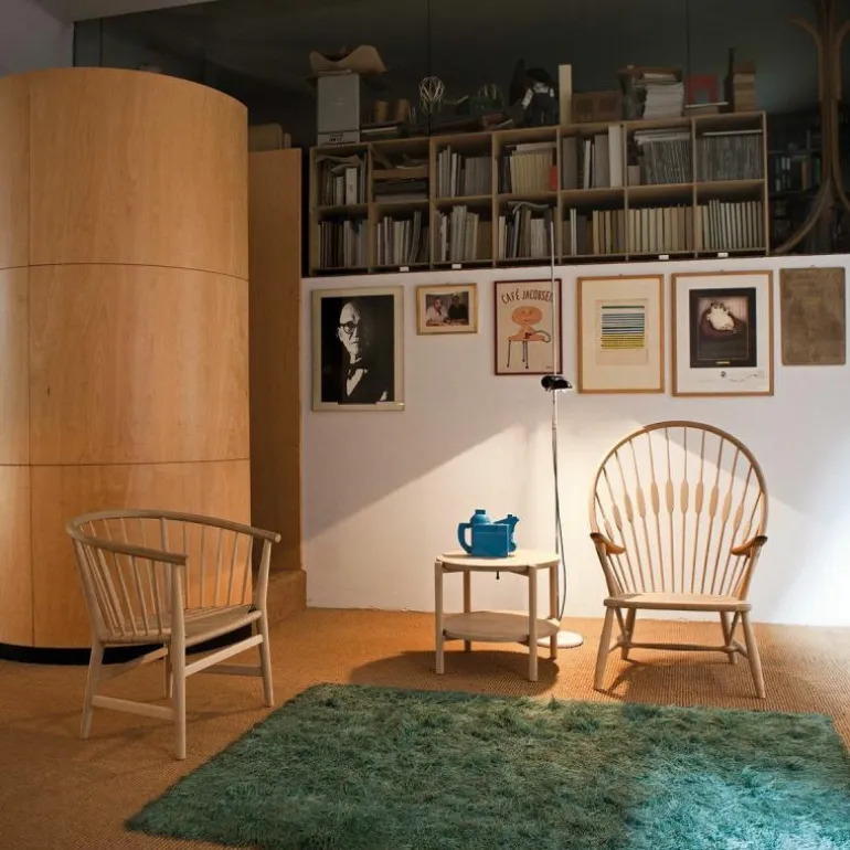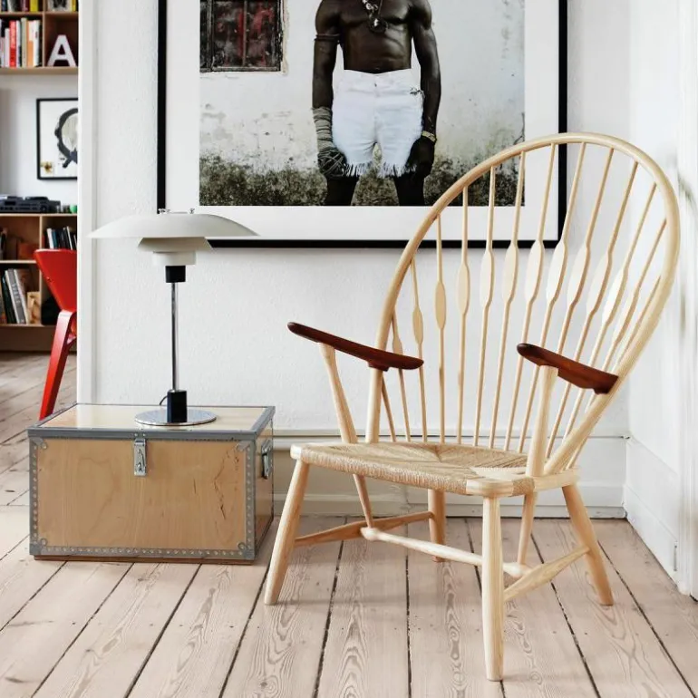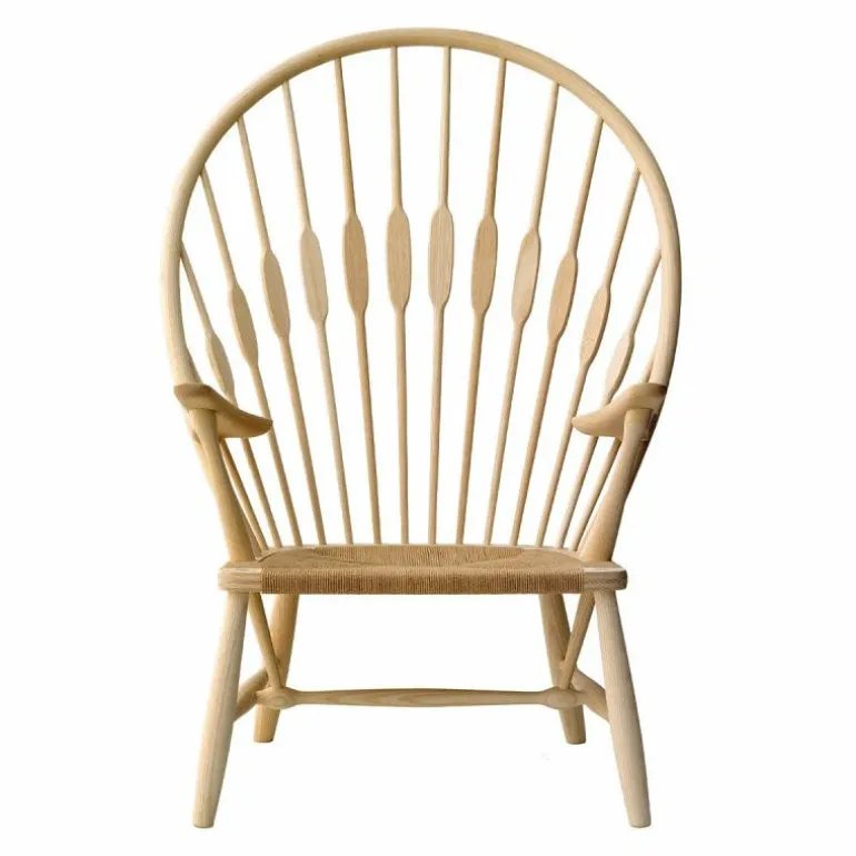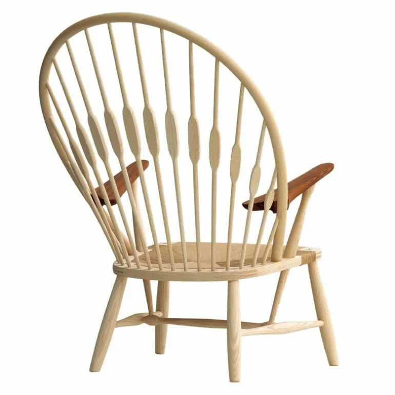 Een traditionele Engelse Windsor stoel is voor Wegner de inspiratie geweest voor de vervaardiging van dit Scandinavische ontwerp. In het ontwerp van de stoel heeft Wegner een evenwicht gevonden tussen een verfijnde vormgeving en ergonomische esthetiek. De Peacock Stoel heeft een herkenbare hoge spindelrugleuning, waarbij de spindels op de juiste hoogte zijn afgevlakt voor een optimale ergonomische ondersteuning van de schouderbladen. Bovendien bestaat het zitvlak uit papiersnoer. Met precisie wordt het papiersnoer zo geweven dat er een stevige en comfortabele zitting ontstaat. De combinatie met een plaid maakt de stoel nog aangenamer als toevluchtsoord in een interieur.r