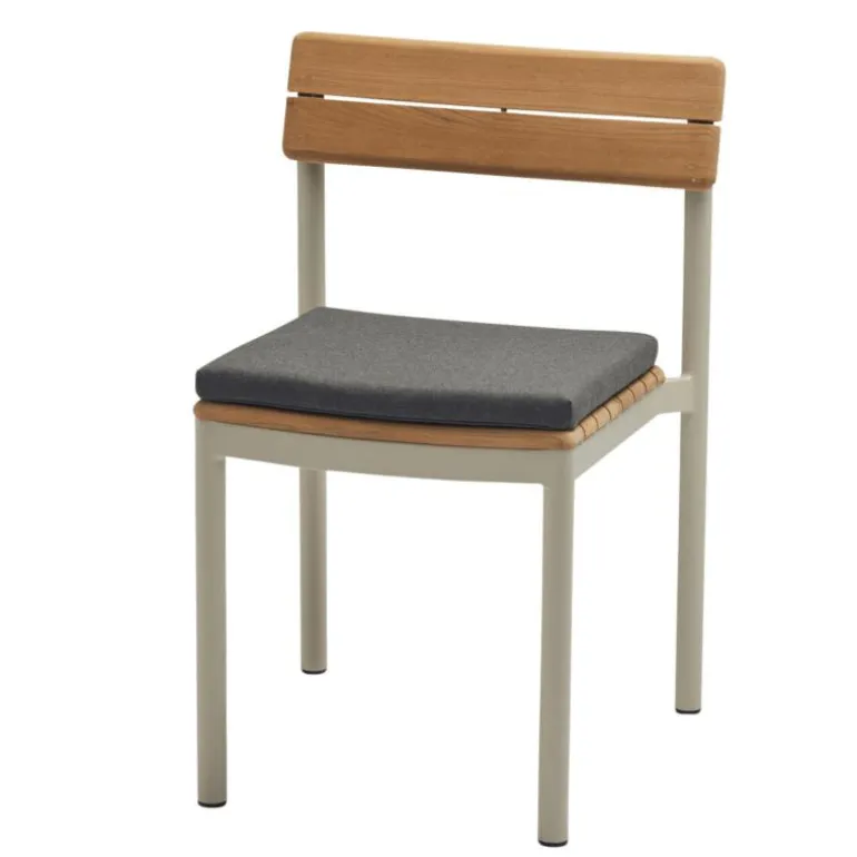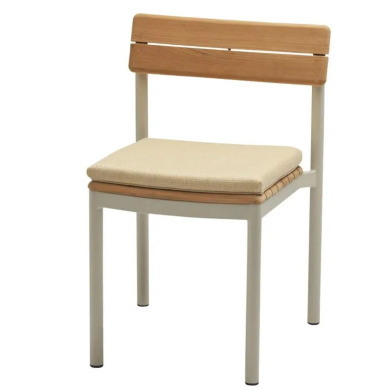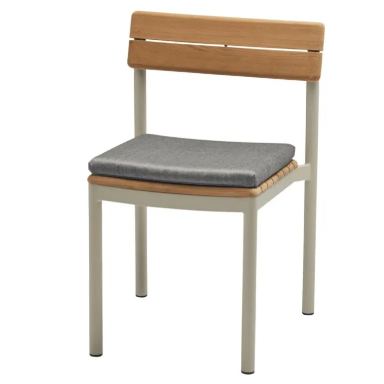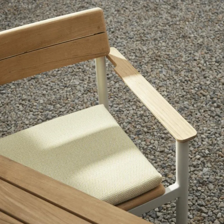Het kussen is bekleed met een duurzame outdoor textielsoort die weerbestendig en onderhoudsvriendelijk is. De stof is bestand tegen intensief gebruik, heeft een hoge kleurvastheid en is geschikt voor langdurige blootstelling aan zonlicht en weersinvloeden. Dit maakt het kussen toepasbaar in uiteenlopende buitenruimtes, van stedelijke terrassen tot natuurlijke tuinen. Tegelijkertijd vormt de textuur en kleurschakering van het textiel een aantrekkelijk contrast met het teakhout van de stoel, dat door de jaren heen een warme gloed of een zilvergrijze patina kan aannemen.
