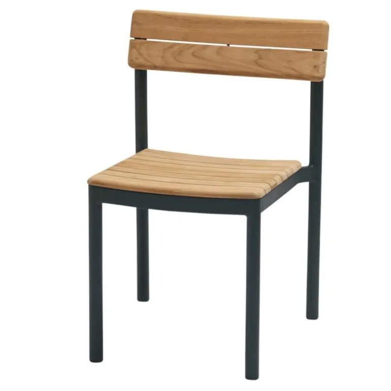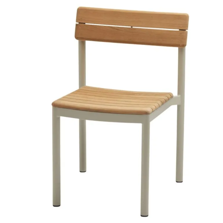 De constructie van de Pelagus Stoel is gebaseerd op duurzame materialen die bestand zijn tegen weersinvloeden. Het zitvlak en de rugleuning zijn gemaakt van 100% FSC-gecertificeerd teak. Dit hout staat bekend om zijn natuurlijke sterkte en wordt na verloop van tijd gekenmerkt door een patina dat het meubel nog meer karakter geeft. Het frame is uitgevoerd in gepoedercoat aluminium, een materiaal dat licht van gewicht is en eenvoudig kan worden verplaatst, terwijl het tegelijkertijd stevigheid en stabiliteit biedt.