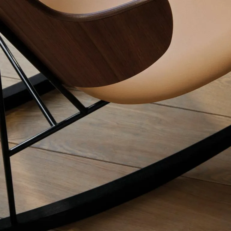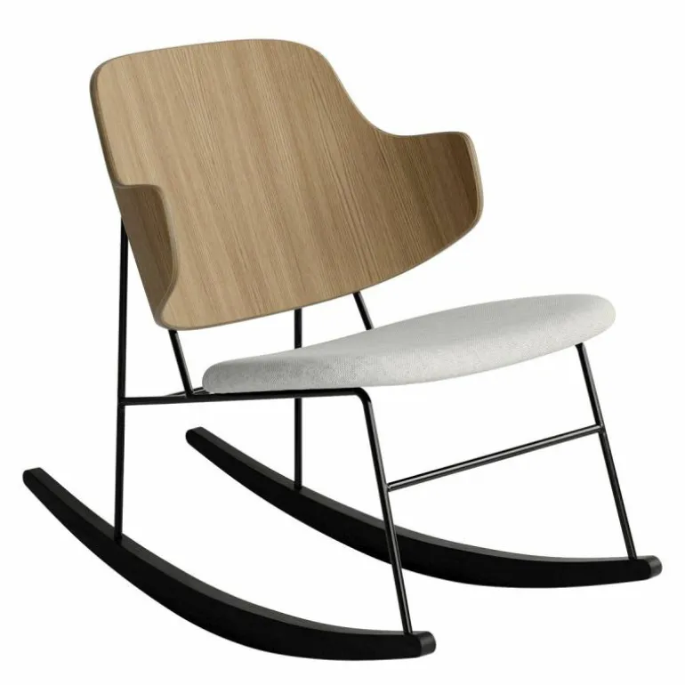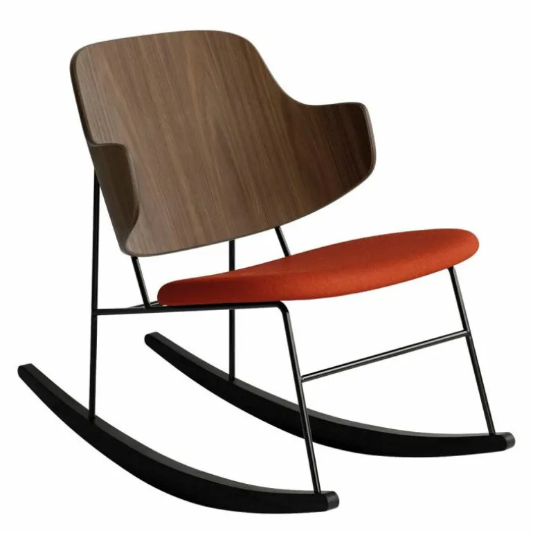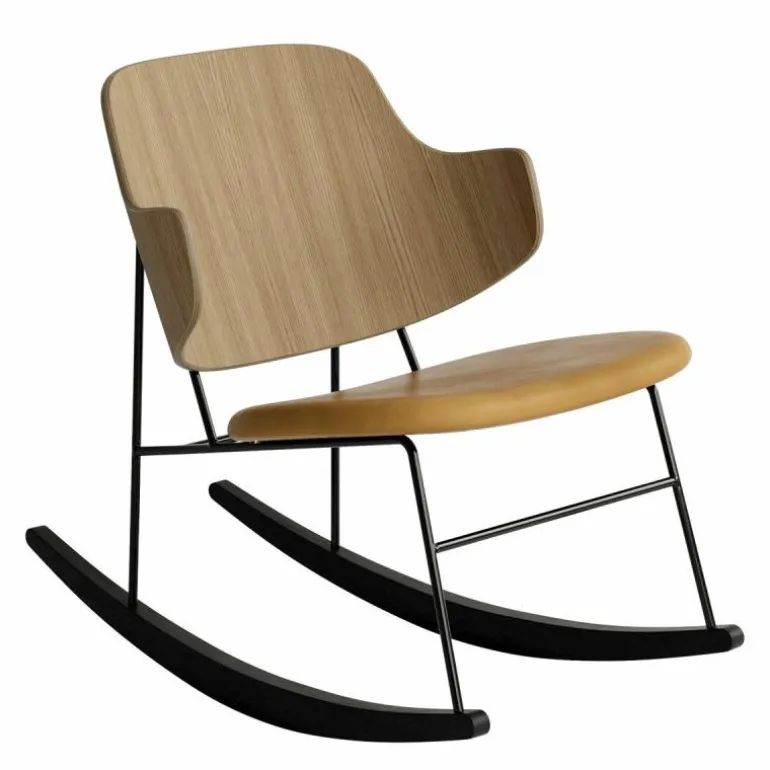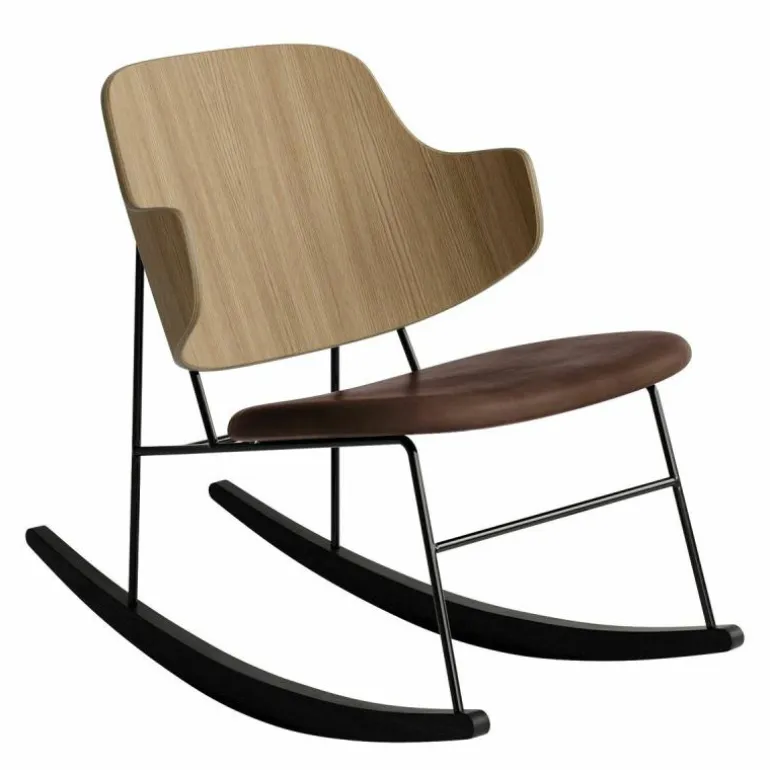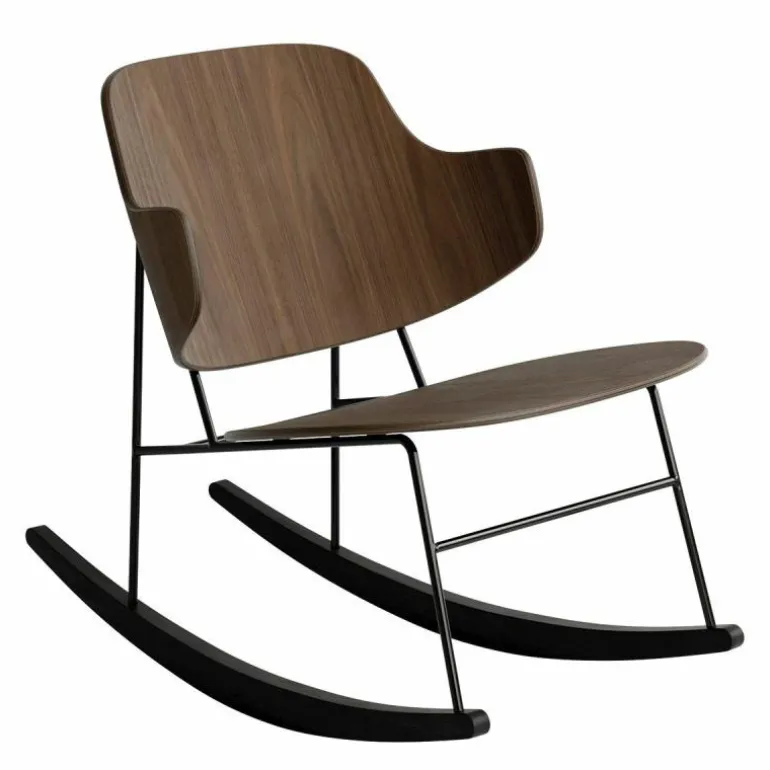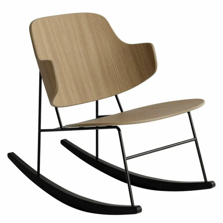 De karaktervolle Penguin Schommelstoel beschikt over een zitting en rugleuning van gebogen multiplex in eiken- of walnoothoutfineer. De zitschaal rust op een stalen frame welke voorzien is van een zwarte poedercoating. De achterste twee buizen lopen door tot de rugleuning waar deze met de rest van het frame wordt verbonden middels een horizontale buis. Dit maakt de schommelstoel, ondanks zijn slanke structuur, bijzonder stevig. Voor de liefhebber van extra zitcomfort is de stoel te verkrijgen met een gestoffeerd zitkussen in diverse stofsoorten en kleuren. Dankzij het schommelmechanisme nodigt de stoel uit tot ontspanning en biedt het ultiem loungecomfort tijdens een moment van rust.