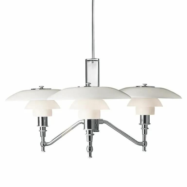 De Academy uitvoering van de originele PH 3/2 hanglamp verdriedubbelt de prachtige harmonieuze lichtverspreiding met maar liefst drie lichtpunten. Deze zijn met elkaar verbonden middels een frame van getrokken aluminium in de afwerking ‘hoogglans verchroomd’. Geheel volgens het PH 3 principe beschikt ieder lichtpunt van de PH 2/1 Stem hanglamp over drie schermen van drie lagen mondgeblazen opaalglas, waarbij het bovenste scherm een diameter van 29 centimeter heeft. Het opaalglas is aan de bovenzijde glanzend en aan de onderzijde gezandstraald mat, hierdoor ontstaat er een zachte en gelijkmatige lichtspreiding en wordt het licht nog steeds grotendeels naar beneden gericht. De lamp wordt geleverd met een zwart snoer. r