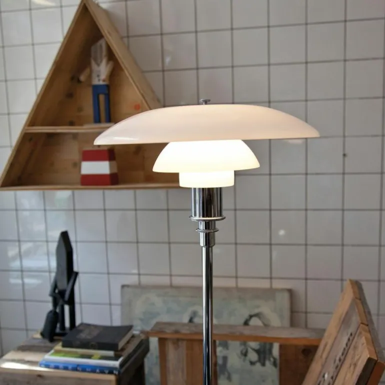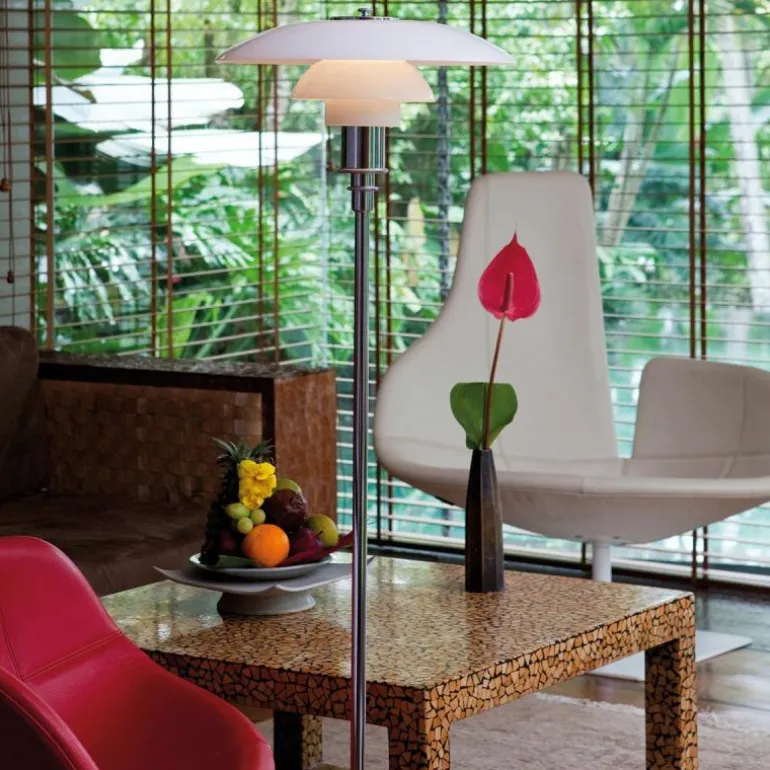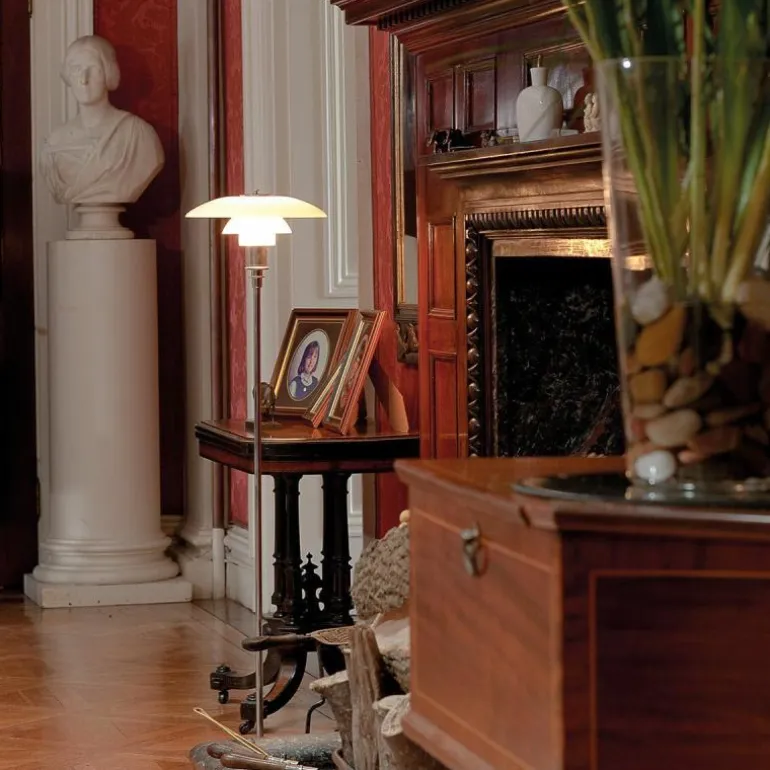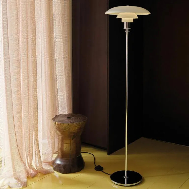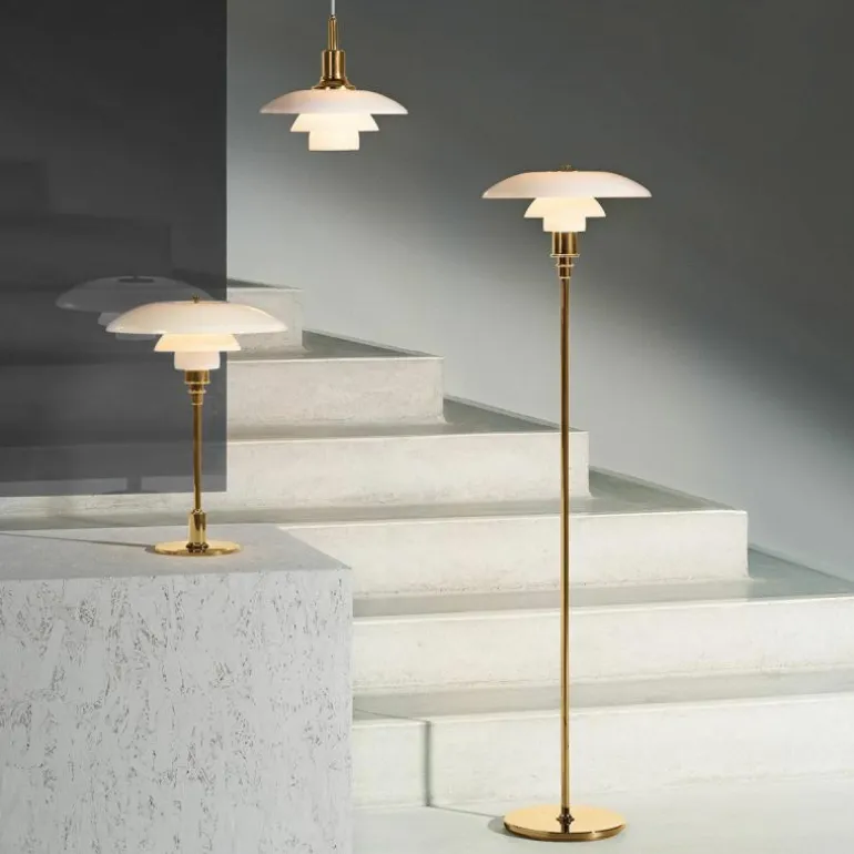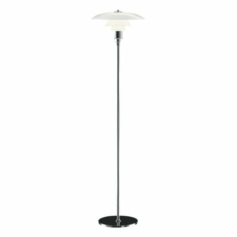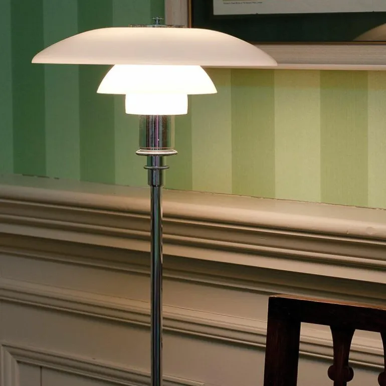 De PH 3,5-2,5 vloerlamp ziet er even prachtig uit als de PH 3-2 hanglamp, alleen is deze in diameter van het bovenste scherm (Ø33 centimeter) net iets groter én staat deze op een hoge stalen staander. Geheel volgens het PH 3 principe beschikt de vloerlamp over drie schermen van ieder drie lagen mondgeblazen opaalglas. Dit diffuse glas is aan de bovenzijde glanzend en aan de onderzijde gezandstraald mat, hierdoor ontstaat er een zachte en gelijkmatige lichtspreiding en wordt het licht nog steeds grotendeels naar beneden gericht. De lampvoet is uitgebracht in de afwerkingen ‘hoogglans verchroomd’, ‘zwart gemetalliseerd’ en ‘messing gemetalliseerd’. Als kers op de taart is de lamp afgewerkt met een prachtig detail bovenop de kap, uitgevoerd in dezelfde kleur als de staander en de lampvoet. Afhankelijk van de uitvoering die u kiest, wordt de lamp geleverd met een witte of zwarte vinyl snoer. De messingkleurige versie wordt geleverd met een witte kleur snoer, de verchroomde en zwarte uitvoeringen met een zwart snoer. De schakelaar zit hierbij in het snoer verwerkt. r