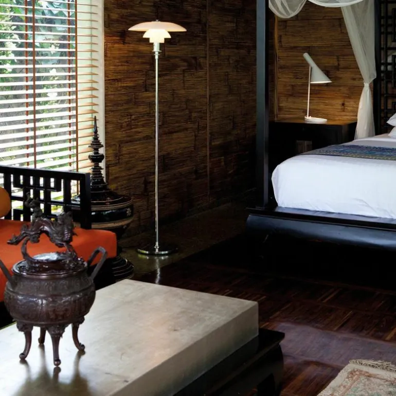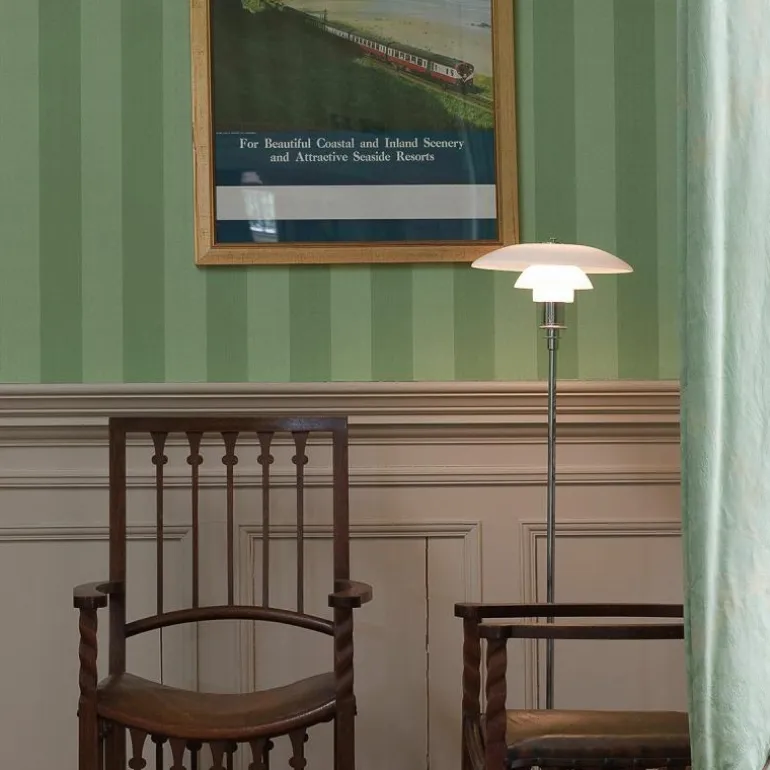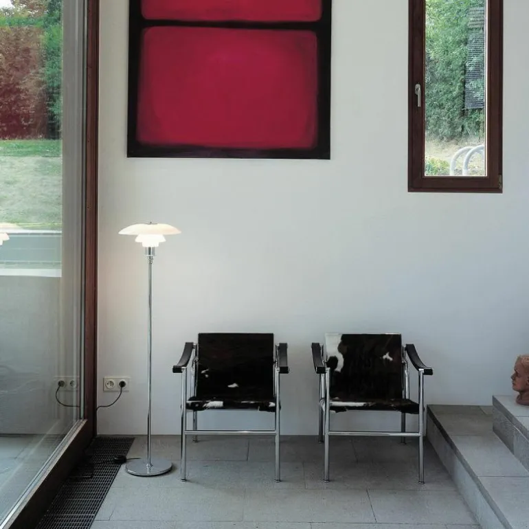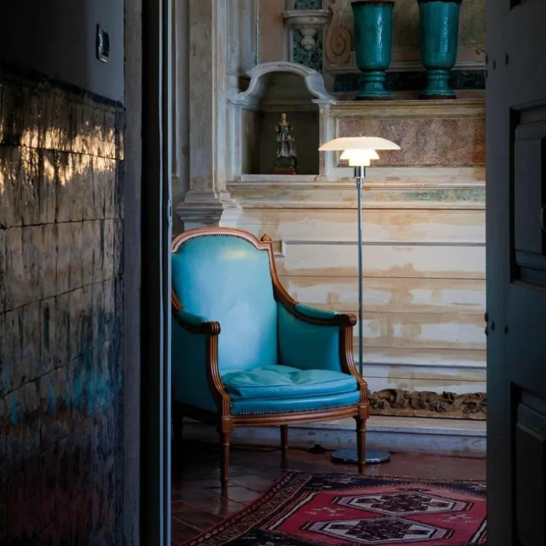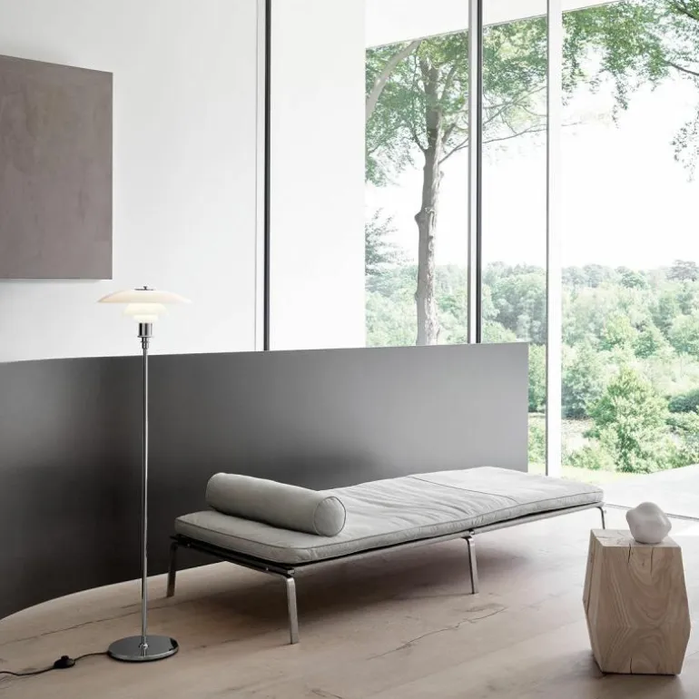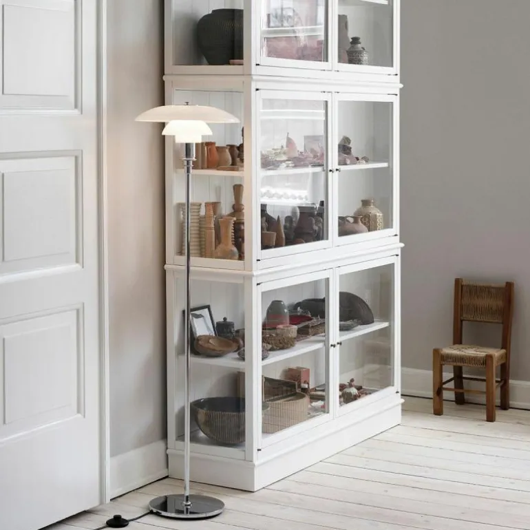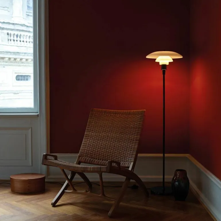 De PH 3,5-2,5 vloerlamp ziet er even prachtig uit als de PH 3-2 hanglamp, alleen is deze in diameter van het bovenste scherm (Ø33 centimeter) net iets groter én staat deze op een hoge stalen staander. Geheel volgens het PH 3 principe beschikt de vloerlamp over drie schermen van ieder drie lagen mondgeblazen opaalglas. Dit diffuse glas is aan de bovenzijde glanzend en aan de onderzijde gezandstraald mat, hierdoor ontstaat er een zachte en gelijkmatige lichtspreiding en wordt het licht nog steeds grotendeels naar beneden gericht. De lampvoet is uitgebracht in de afwerkingen ‘hoogglans verchroomd’, ‘zwart gemetalliseerd’ en ‘messing gemetalliseerd’. Als kers op de taart is de lamp afgewerkt met een prachtig detail bovenop de kap, uitgevoerd in dezelfde kleur als de staander en de lampvoet. Afhankelijk van de uitvoering die u kiest, wordt de lamp geleverd met een witte of zwarte vinyl snoer. De messingkleurige versie wordt geleverd met een witte kleur snoer, de verchroomde en zwarte uitvoeringen met een zwart snoer. De schakelaar zit hierbij in het snoer verwerkt. r