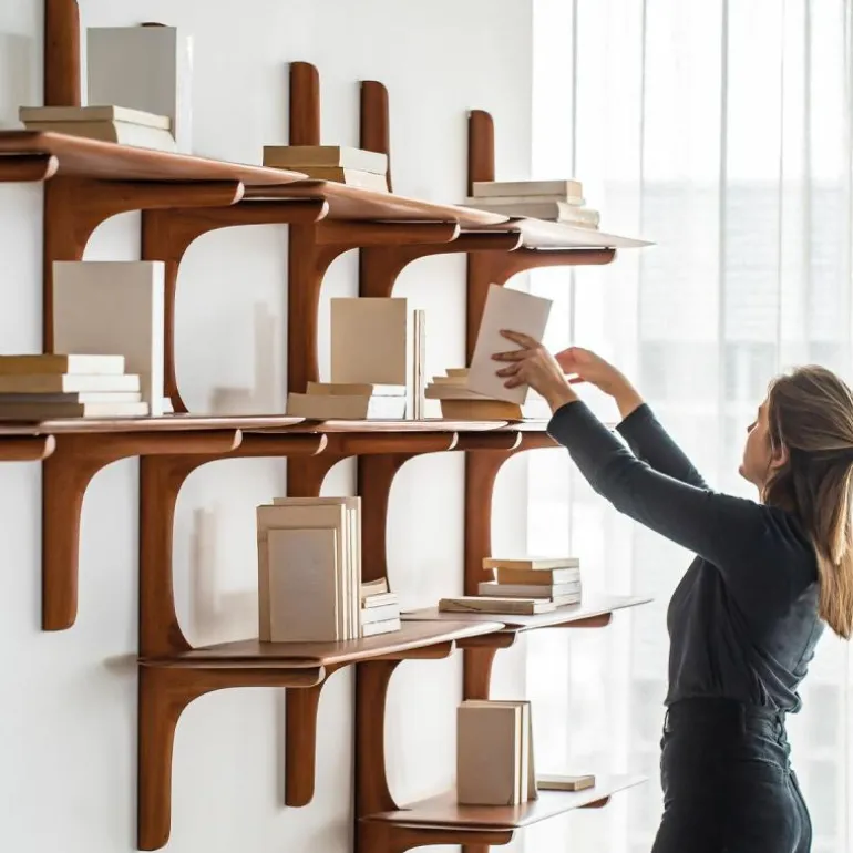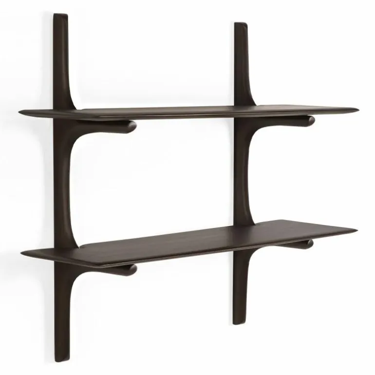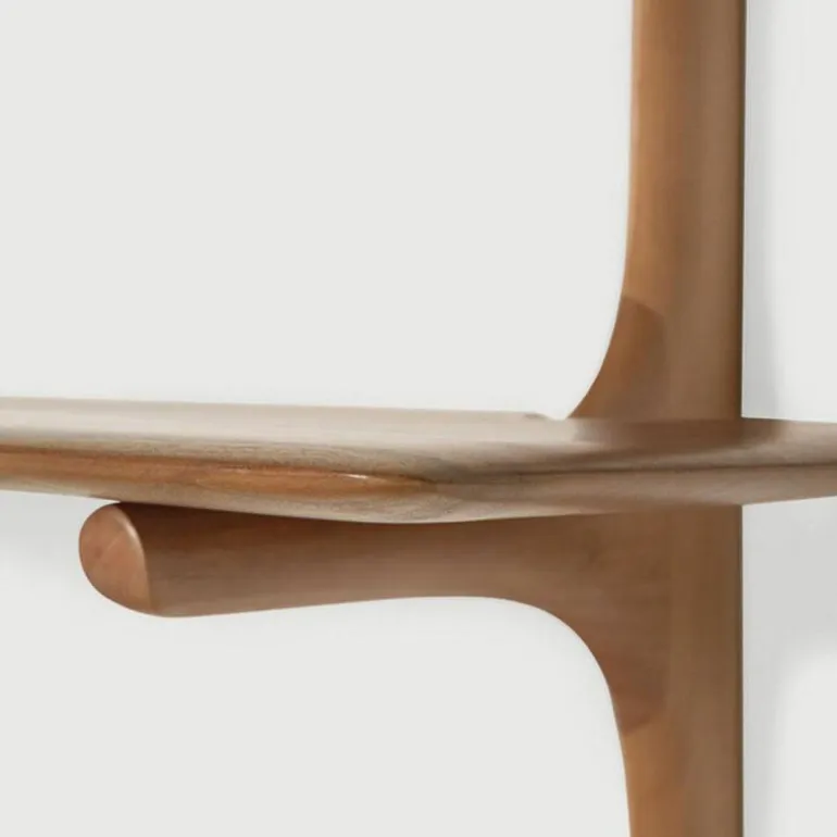 Elke wandplank in deze serie is vervaardigd uit zorgvuldig geselecteerd massief hout, waarbij de natuurlijke structuur behouden blijft. De afgeronde hoeken en subtiel golvende lijnen benadrukken het ambachtelijke karakter van het ontwerp en dragen bij aan een warme, natuurlijke uitstraling. Tegelijkertijd blijft de vormtaal ingetogen en consistent, waardoor de planken eenvoudig integreerbaar zijn in uiteenlopende interieurconcepten.