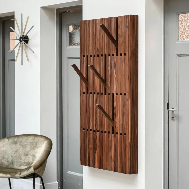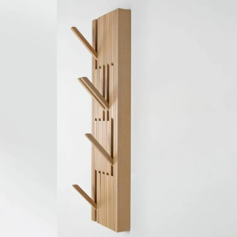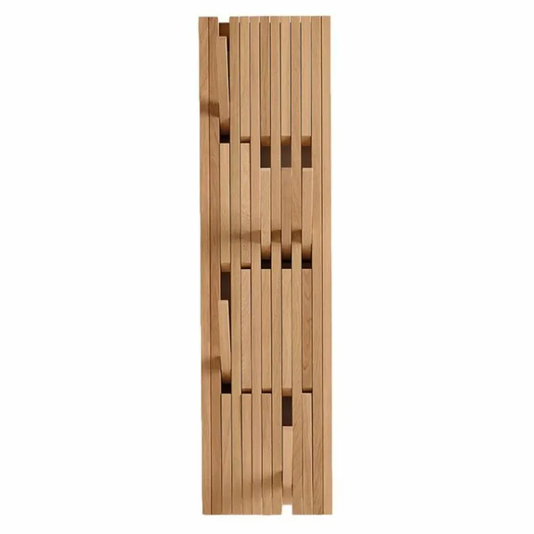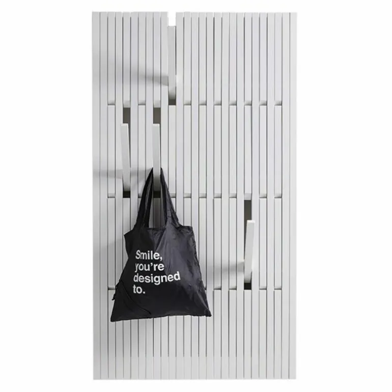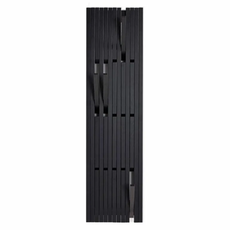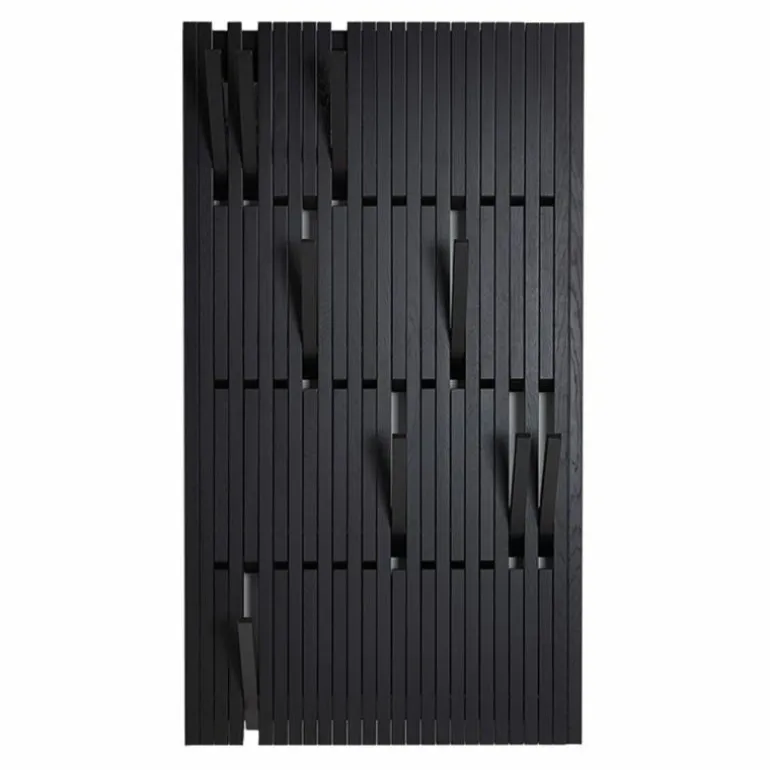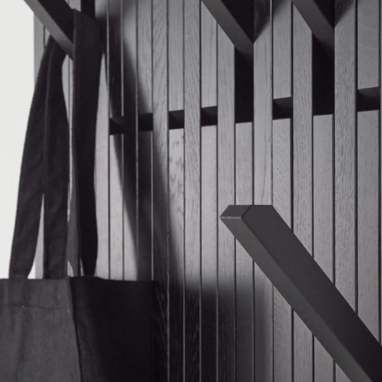 De kapstok bestaat uit een reeks individueel verstelbare latten die als haken functioneren. Deze beweegbare elementen kunnen afhankelijk van behoefte naar voren worden geklapt en bieden zo een praktische oplossing voor het ophangen van jassen, accessoires of andere gebruiksvoorwerpen. Wanneer niet in gebruik, vormt het geheel een strak, grafisch lijnenspel tegen de muur, dat esthetisch rust en ritme toevoegt aan de ruimte.