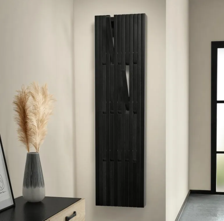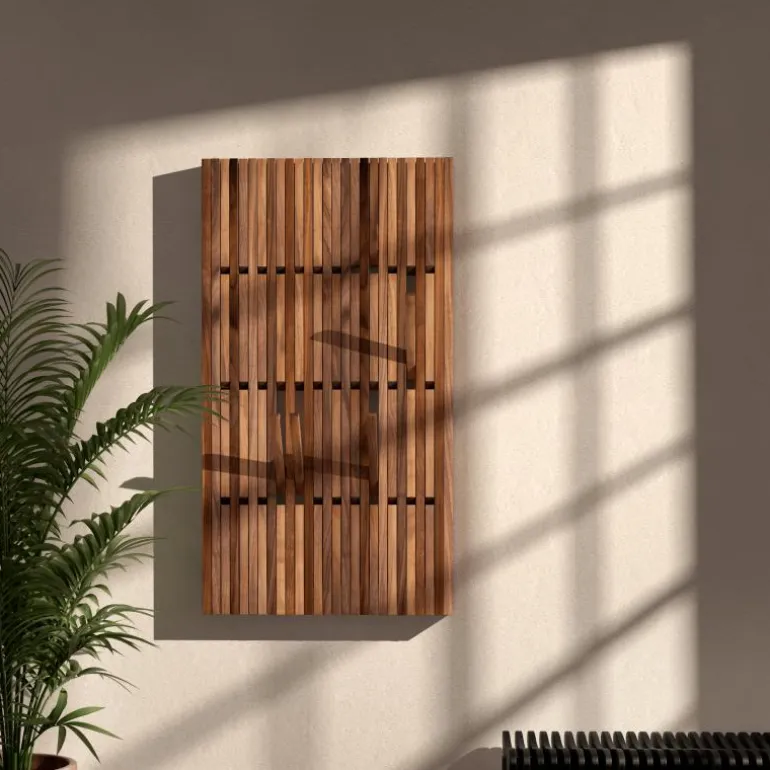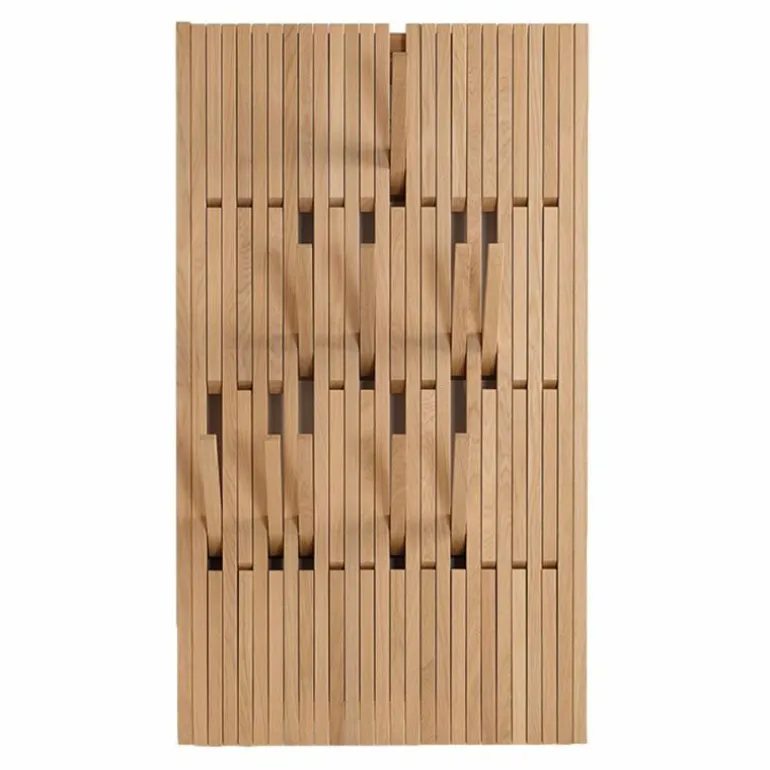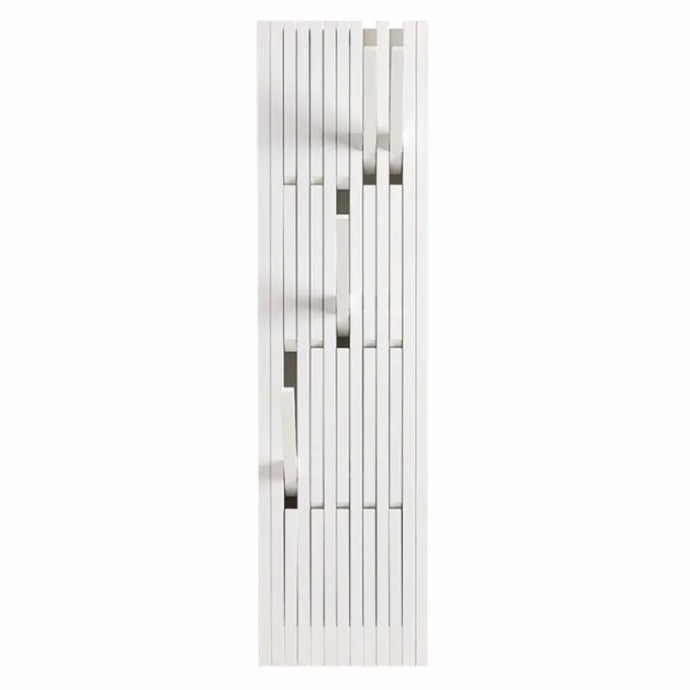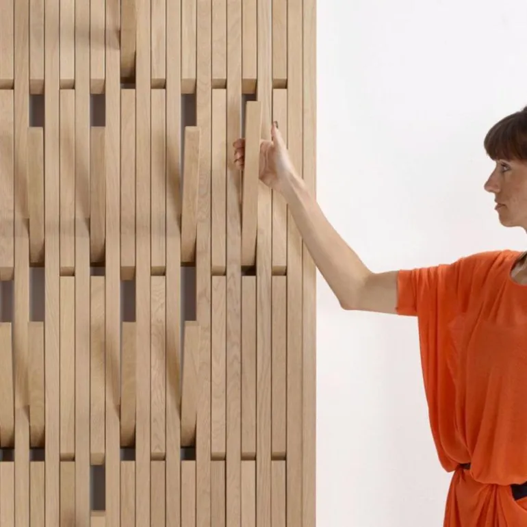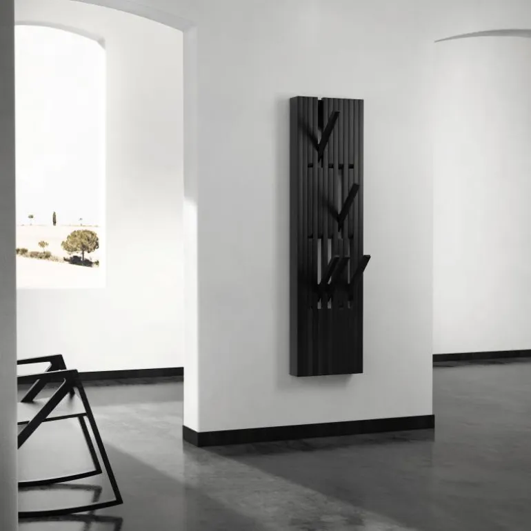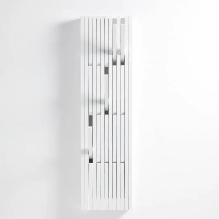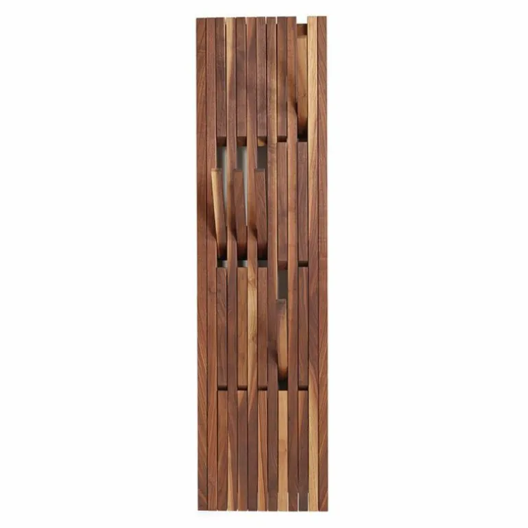 De kapstok bestaat uit een reeks individueel verstelbare latten die als haken functioneren. Deze beweegbare elementen kunnen afhankelijk van behoefte naar voren worden geklapt en bieden zo een praktische oplossing voor het ophangen van jassen, accessoires of andere gebruiksvoorwerpen. Wanneer niet in gebruik, vormt het geheel een strak, grafisch lijnenspel tegen de muur, dat esthetisch rust en ritme toevoegt aan de ruimte.