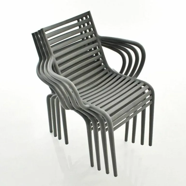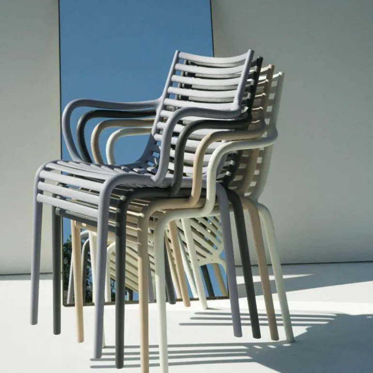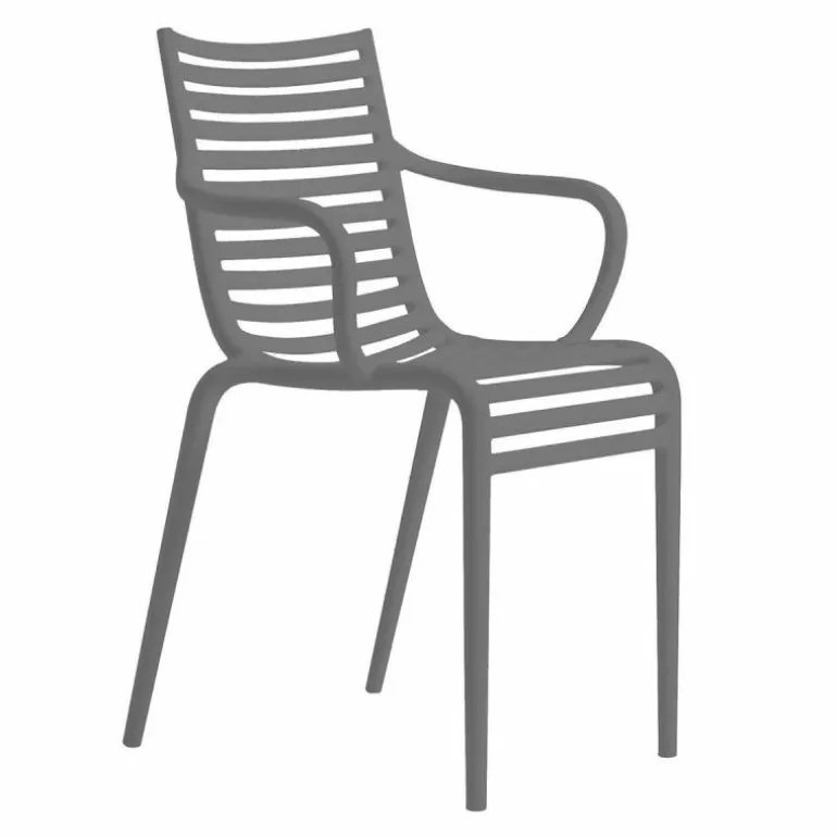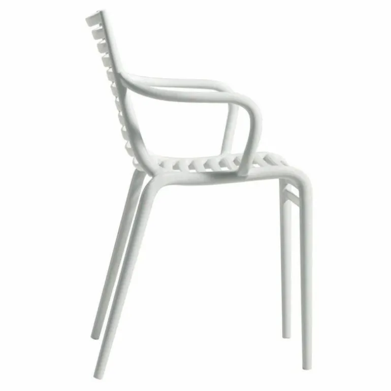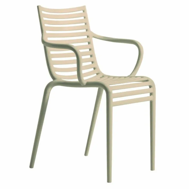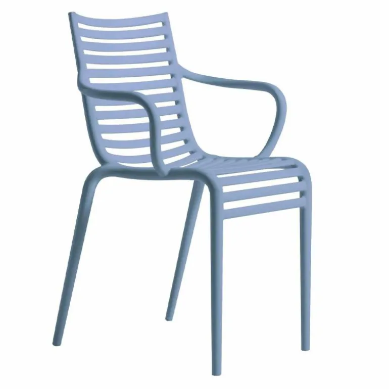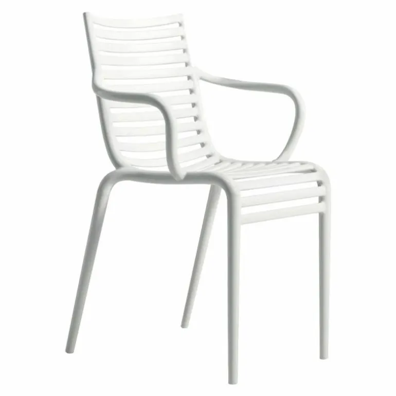 De minimalistische en toch elegante PIP-e Armstoel is vervaardigd uit weerbestendig en duurzaam polypropyleen. Dankzij dit materiaal is de stoel uitermate geschikt voor zowel binnen- als buitengebruik. Bovendien is de stoel uitgevoerd in verschillende kleuren: donkergrijs, wit, lavendel grijs en carnation en is hij stapelbaar tot vier stoelen. De combinatie van het materiaal en de kleur zorgen voor een spel van licht en donker wat zorgt voor een speels effect. De stoel heeft een diepte van 52,5 centimeter, een breedte van 54,5 centimeter en een hoogte van 83 centimeter.