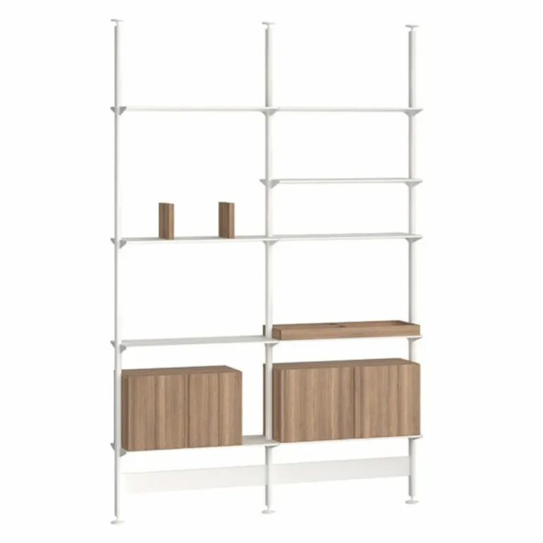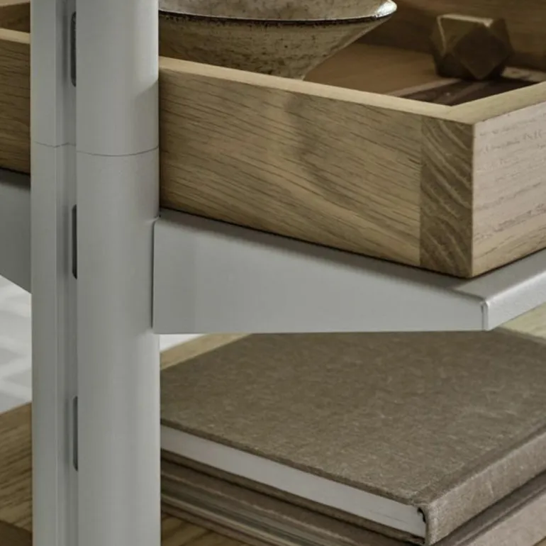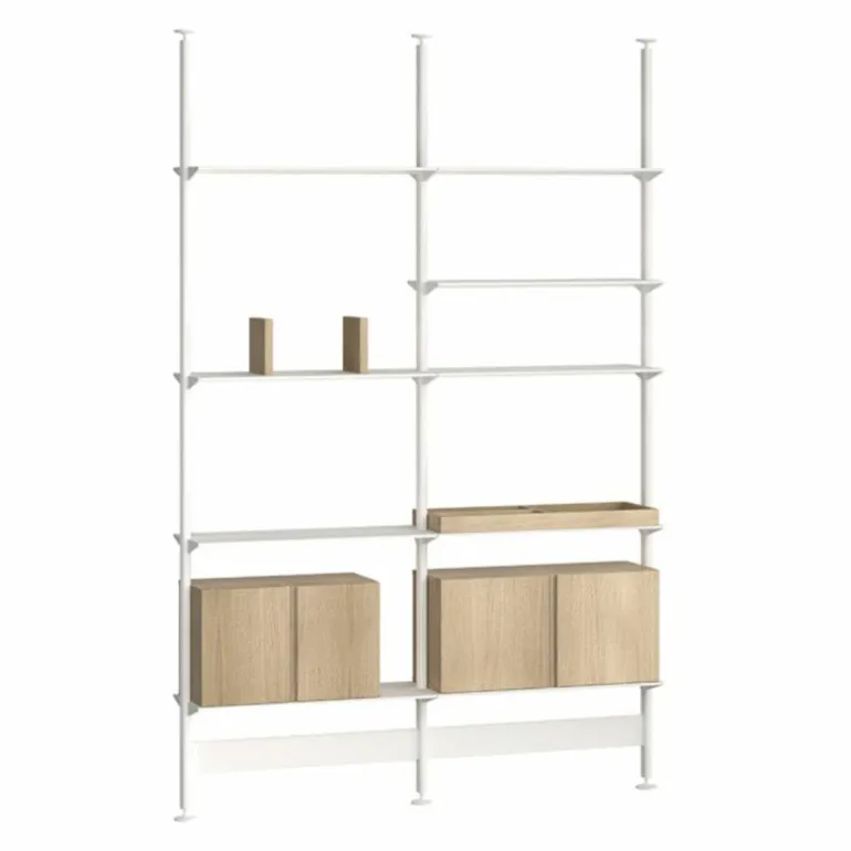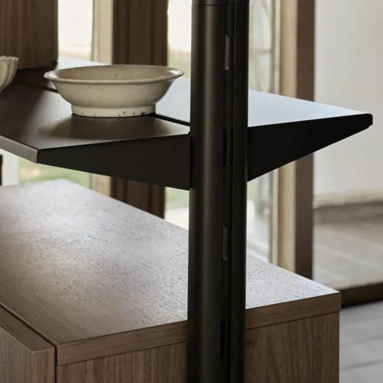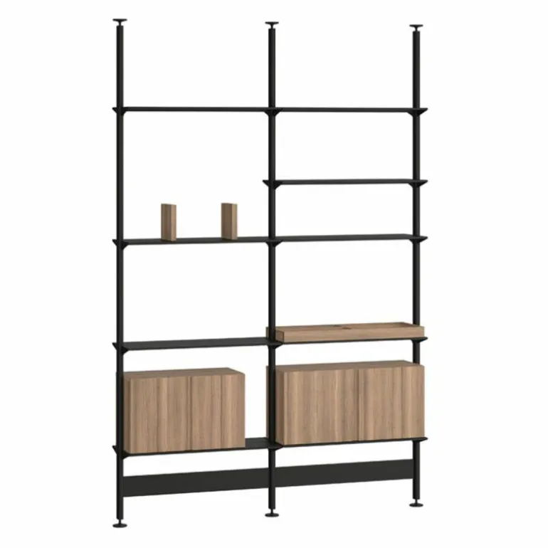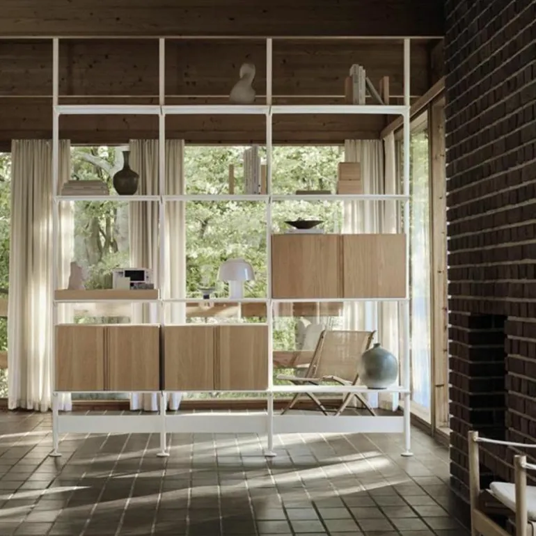 Het metalen Pira G2 Opbergsysteem is een lust voor het oog en vormt het middelpunt in elke ruimte, letterlijk. Het opbergsysteem is namelijk niet alleen geschikt als wandkast, maar breekt het open karakter van grote, open ruimtes door hem te gebruiken als roomdivider. Ondanks dat het systeem volledig modulair is, lijkt het als één geheel te zijn gebouwd. Het harde karakter van metaal wordt verzacht door de elementen van hout die een vleugje functionaliteit toevoegen aan het ontwerp. Zo is het mogelijk om het metalen frame te verrijken met houten boekensteunen, dienbladen en kastjes waardoor nóg meer opbergruimte ontstaat. Geniet van een opgeruimd interieur en complementeer het opbergsysteem met prachtige vazen, een functionele tafellamp en kunstzinnige sculpturen.r