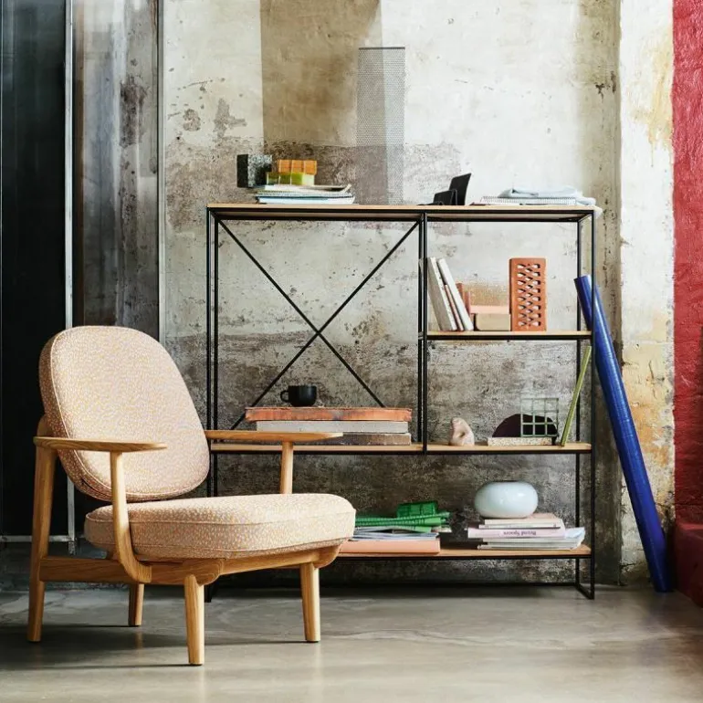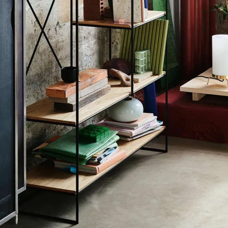 Het frame, waarvan de vormgeving op de Bauhaus stijl is geïnspireerd, is gemaakt van duurzaam gepoedercoat staal met een enigszins matte afwerking. De verbindingen van de stalen lijnen worden met de hand gelast en voorzichtig afgerond voor een zachte uitstraling. De planken zijn gemaakt van eikenfineer, dat aan de randen is afgeschuind om naadloos in het frame te passen. r