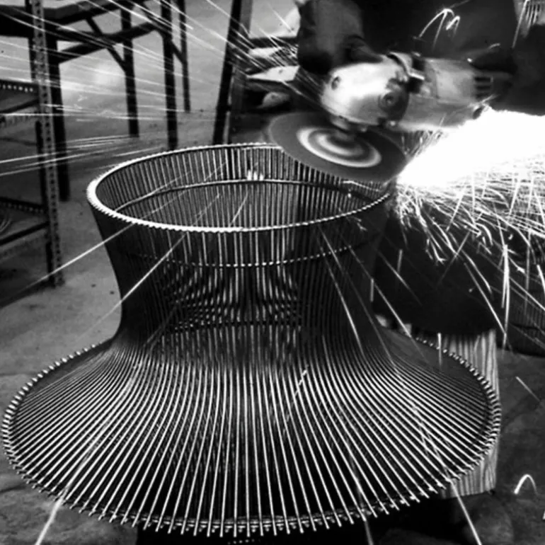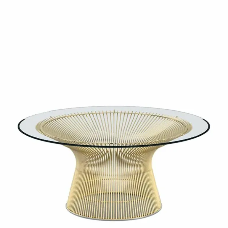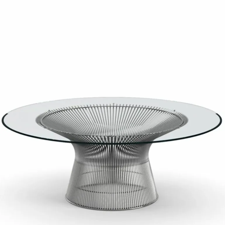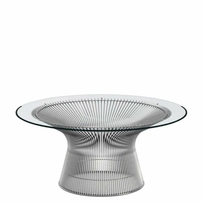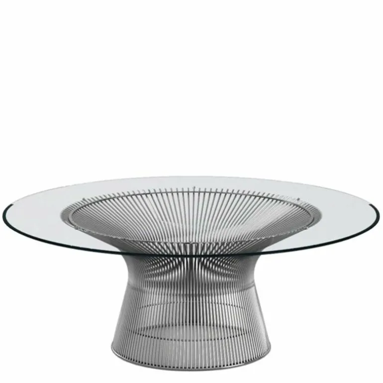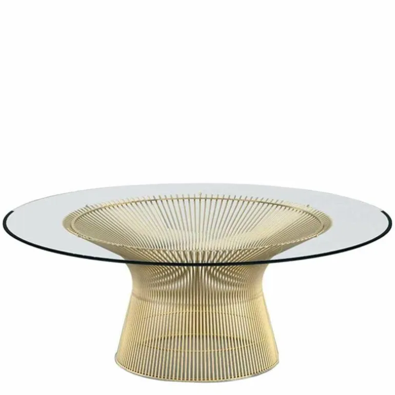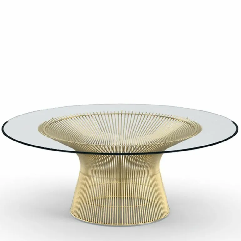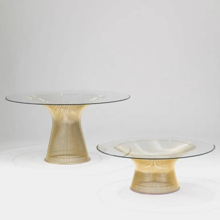 De Knoll Studio Platner Salontafel is een ontwerp van Warren Platner uit 1966. In dit modernistische tijdsperk was de stijlvolle salontafel met zijn verfijnde vormen een prachtige verschijning. Warren Platner had voor ogen om een serie van designmeubilair te ontwikkelen die binnen de decoratieve stijl van Lodewijk XV zou passen, maar dan met een functioneler karakter. De prachtige Platner serie kwam hieruit voort. Kenmerkend voor het design binnen deze serie is de repetitie van verticale draden van staal, welke gezamenlijk zorgen voor een fenomenaal uiterlijk. Door het heldere glazen blad kunt u niet alleen van de zijkant, maar ook vanaf de bovenzijde genieten van deze constructie. Het staal is naar keuze afgewerkt met gepolijst nikkel of 18 karaat goud. De salontafel is verkrijgbaar met een diameter van 91.5 en 107 centimeter. De hoogte is bij beide varianten 38.5 centimeter. Tip: de salontafel is op aanvraag ook verkrijgbaar met een marmeren blad, neem hiervoor vrijblijvend contact op met onze klantenservice. Op zoek naar een kleinere tafel? Bekijk dan eens de Platner Bijzettafel van Knoll op onze website! r