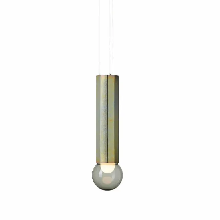De Prisma Single Hanglamp bestaat uit een tienhoekig armatuur van geborsteld staal en gegalvaniseerd zink met een matte of glanzende afwerking. De handgeblazen glazen bol omgeeft de lichtbron en is verkrijgbaar in zowel transparant glas als glas in smoke grey. r