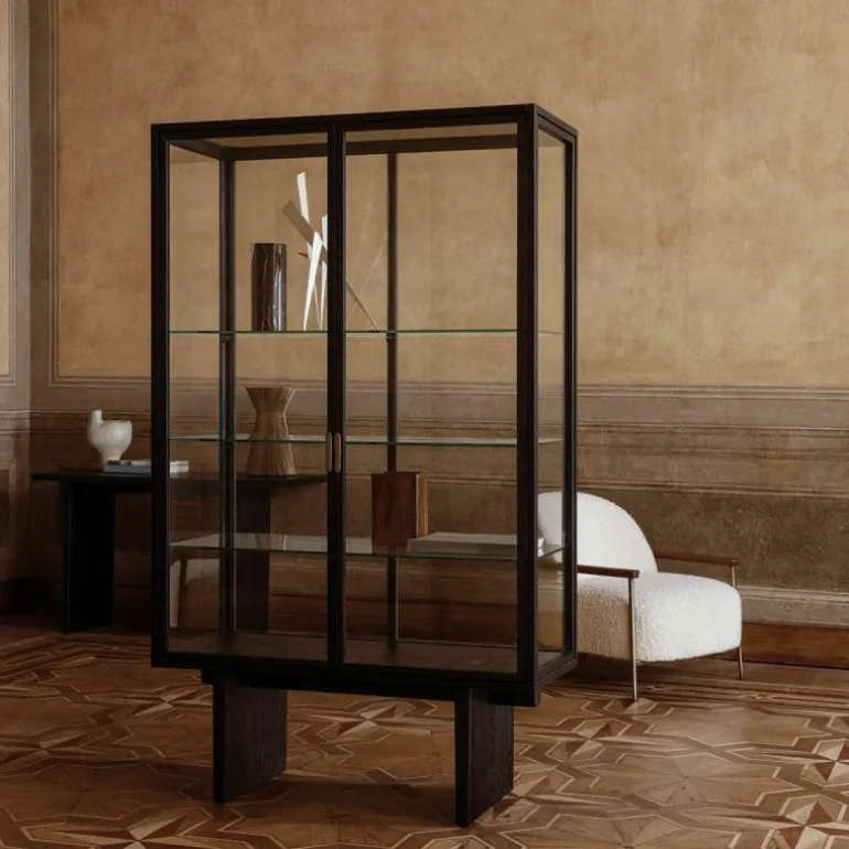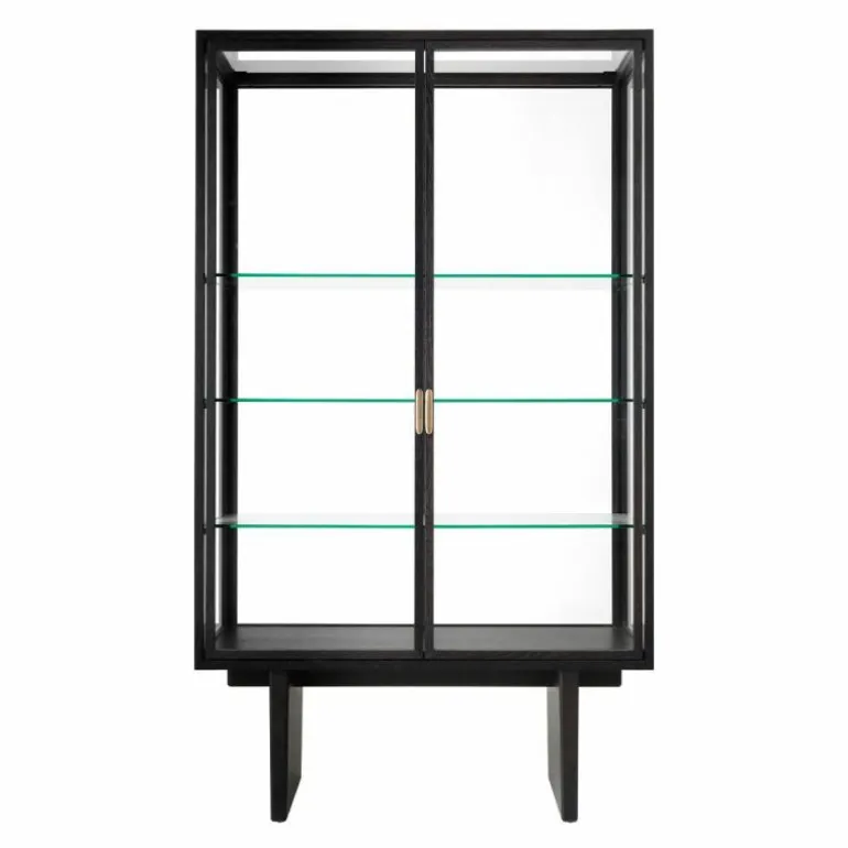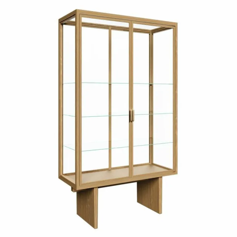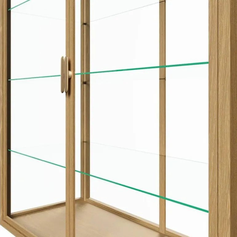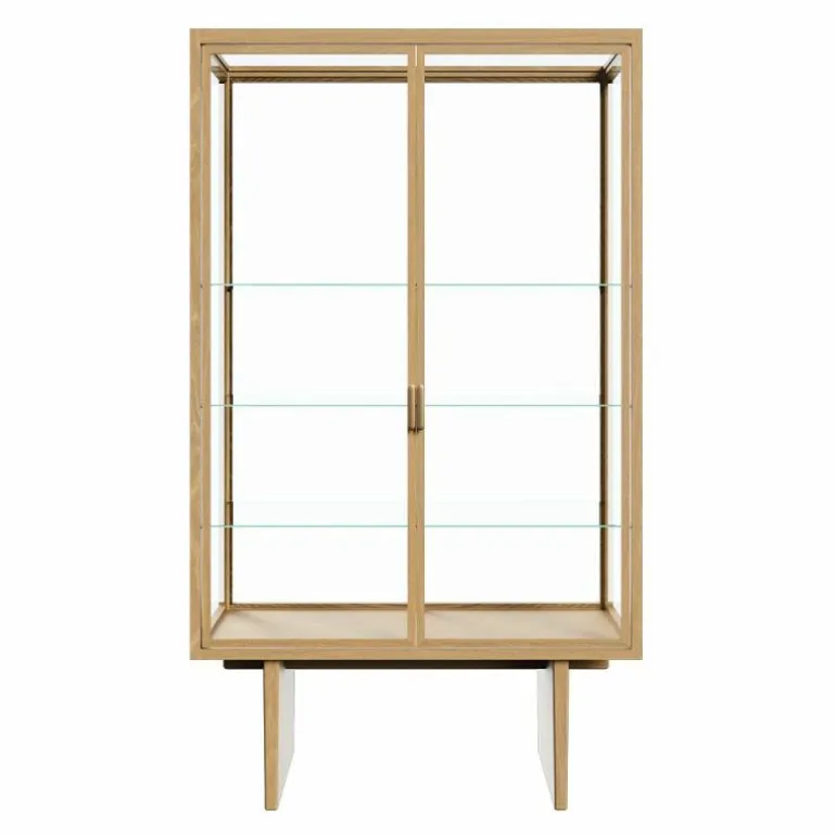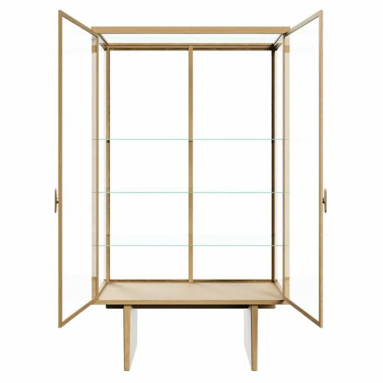 Ook de Private Vitrinekast heeft een herkenbare vormentaal waar de focus wordt gelegd op kwaliteit, materiaal en elegante details. Het design is vervaardigd uit MDF met eikenfineer dat afgewerkt is met een zwart/bruine beits of lichtgekleurde beits. De vitrinekast heeft rondom glas en heeft tevens glazen planken. Hierdoor krijgen de items in de kast alle aandacht. De deuren zijn voorzien van metalen knoppen met antiek messing afwerking. De combinatie van hout, glas en de messing look maakt het design tot een stijlvol geheel.