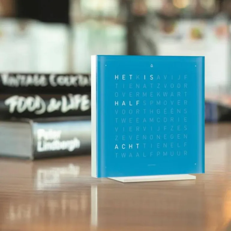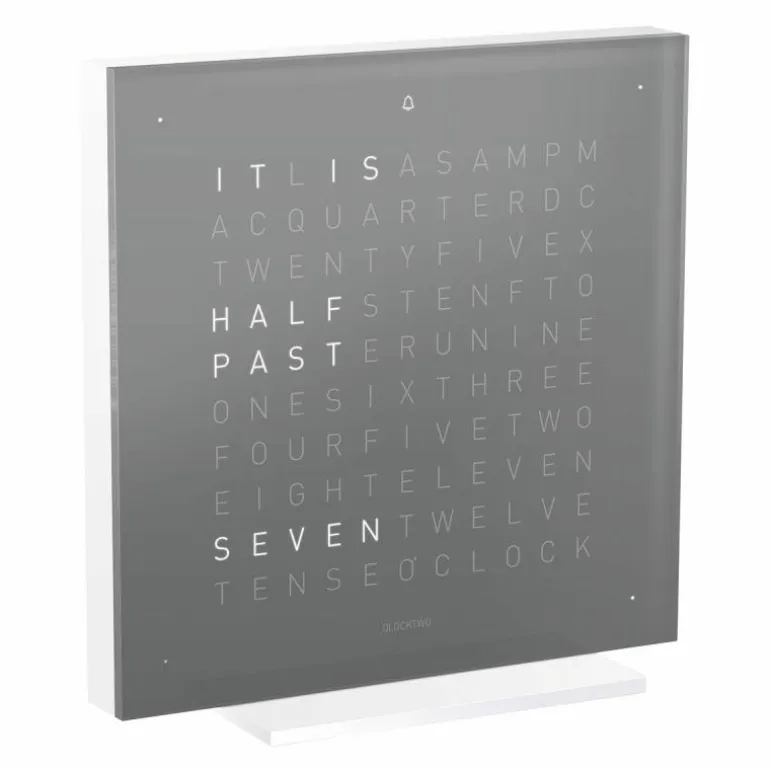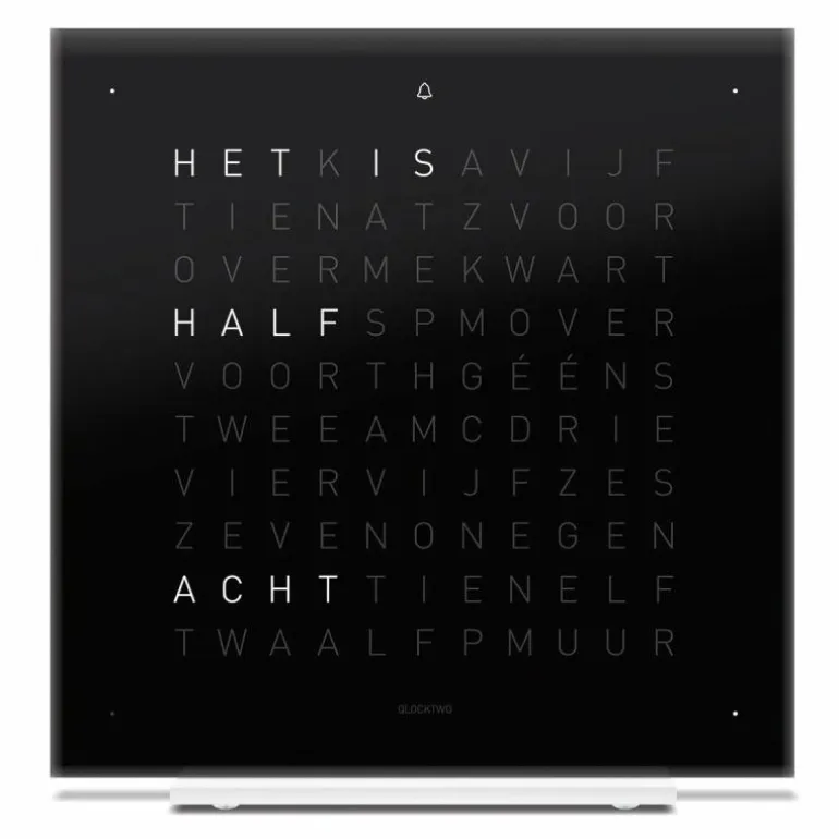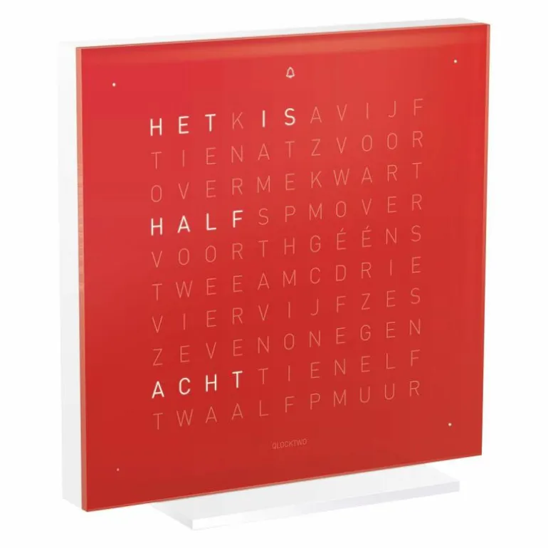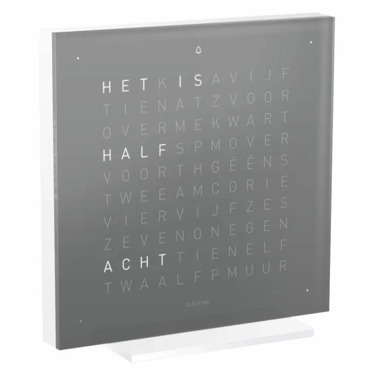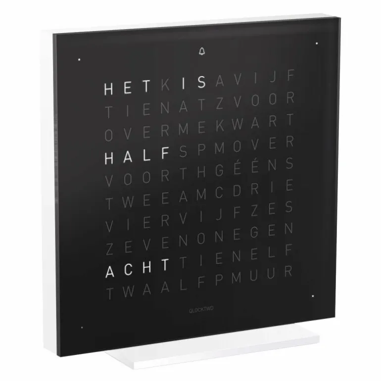 Deze uitvoering met Nederlandse en Engelse frontplaten vervaardigd uit acryl is verkrijgbaar in verschillende kleuren inclusief een wit gekleurde behuizing. Doordat de frontplaten van de tafelklok magnetisch vast zitten aan de behuizing en dus afneembaar zijn, kan de klok naar wens voorzien worden van een front in een andere kleur of taal. r