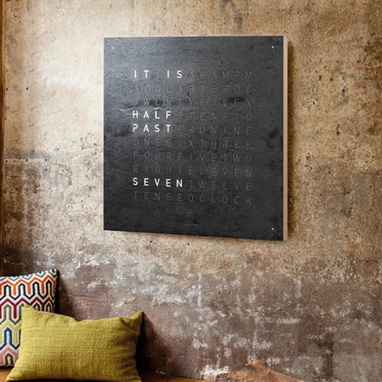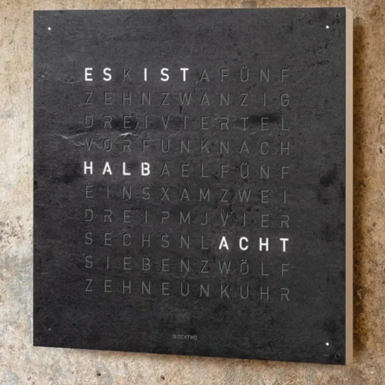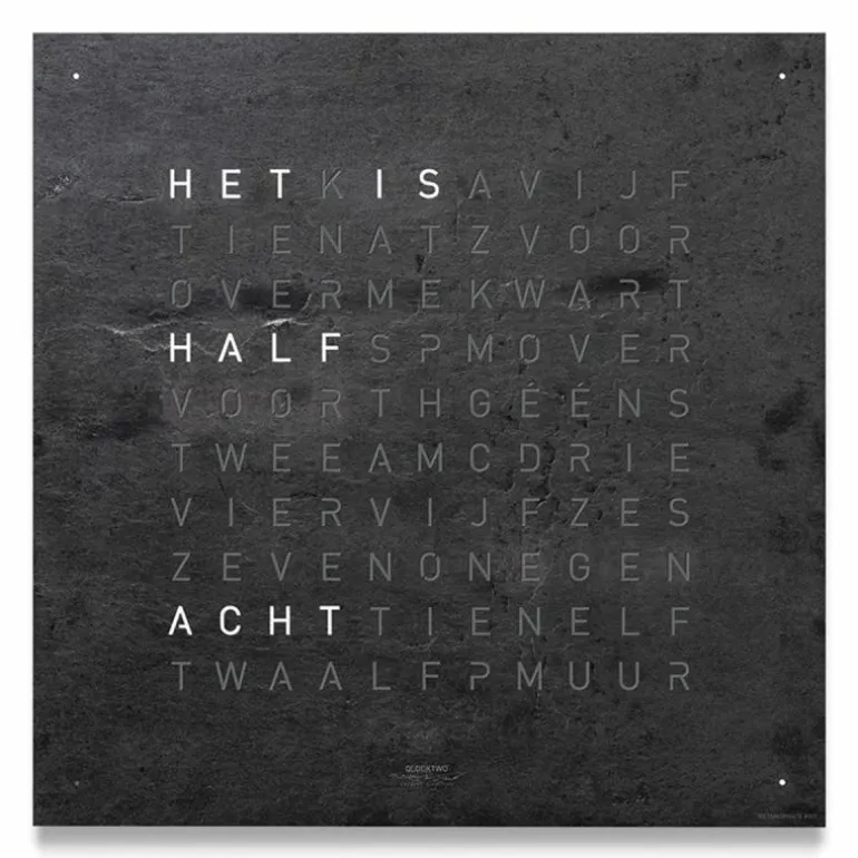 QLOCKTWO dient van stroom te worden voorzien via een stopcontact (110-240 V). Een USB-kabel van 25 centimeter én een witte textiel USB-kabel van 220 centimeter worden meegeleverd. De ingebouwde stroomreserve van de klok bedraagt 24 uur.