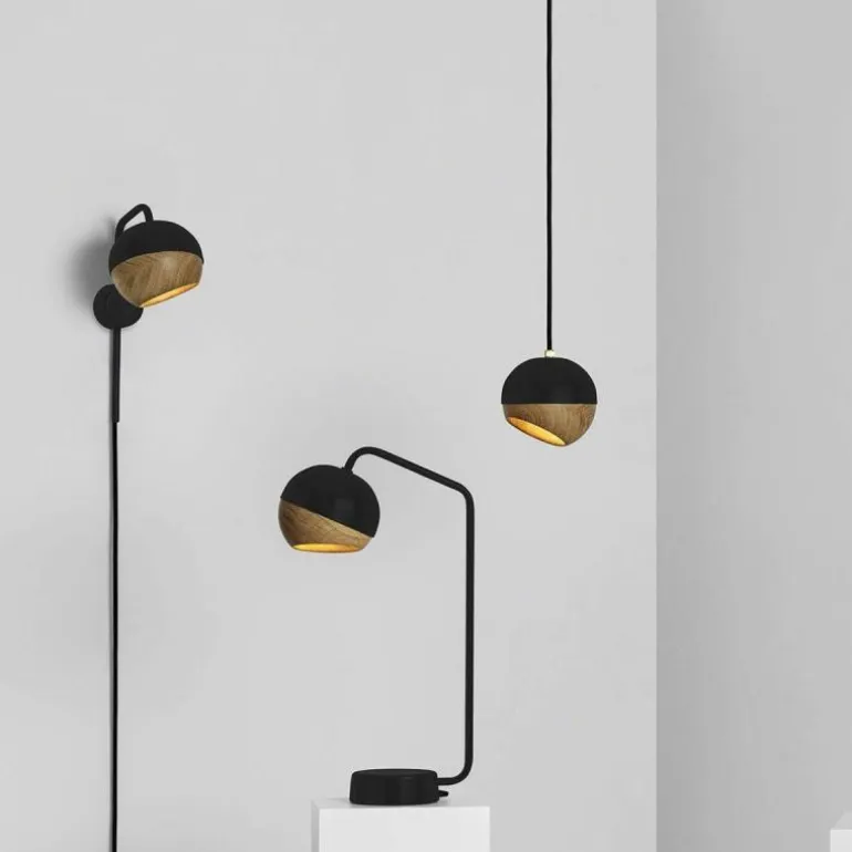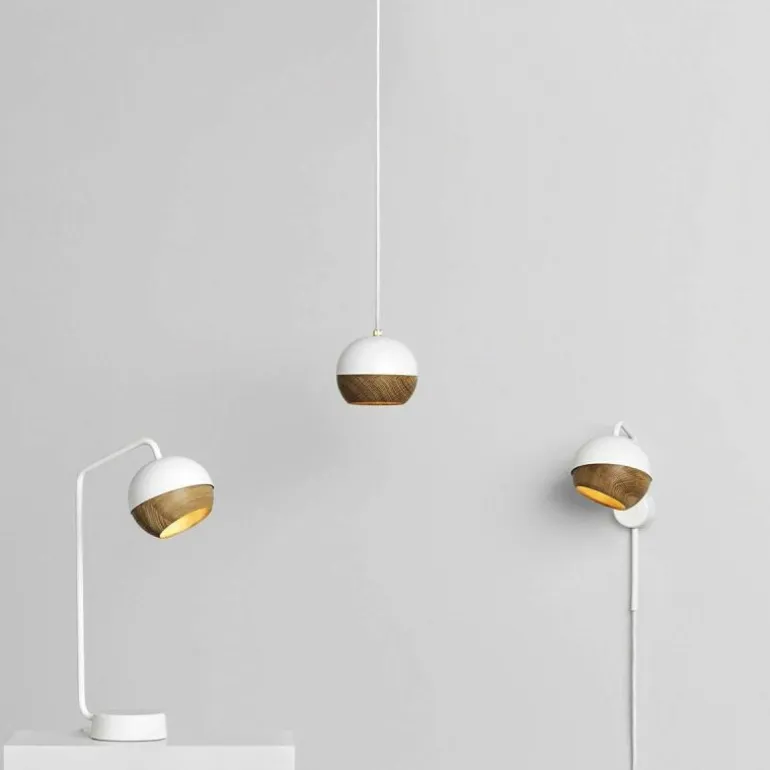 De lamp is gemaakt van FSC-gecertificeerd eikenhout en staal. De stalen kap is voorzien van een gekleurde poedercoating waarbij u kunt kiezen tussen zwart en wit. De witte variant heeft een koord van wit textiel en de zwarte variant heeft een koord van zwart textiel. De lamp is daarnaast ook verkrijgbaar in twee afmetingen. De small variant heeft een diameter van 11,9 centimeter en de medium variant heeft een diameter van 15 centimeter.