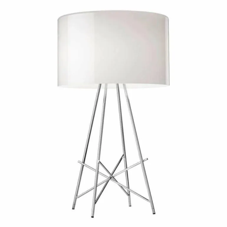 De diffuser is verkrijgbaar in grijs glas, wit metaal of zwart metaal. Door de verchroomd stalen poten ziet deze verlichting er heel hedendaags uit.r