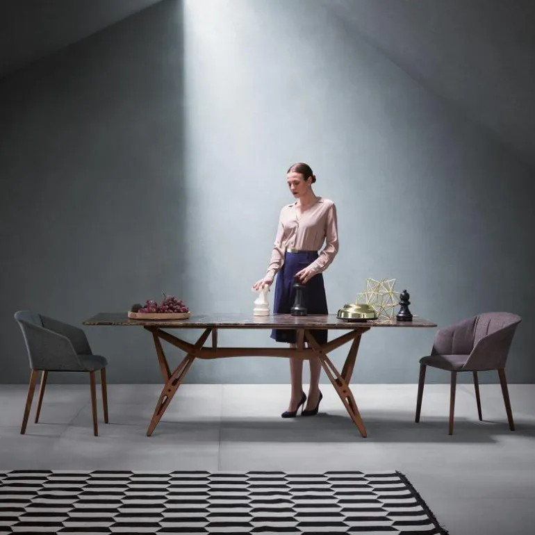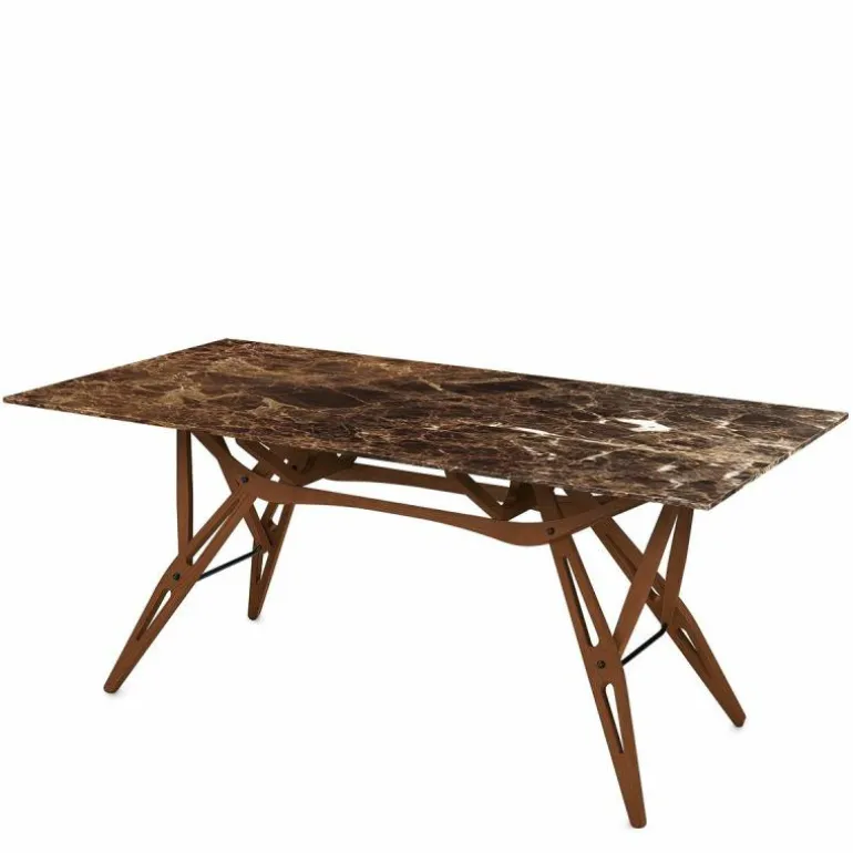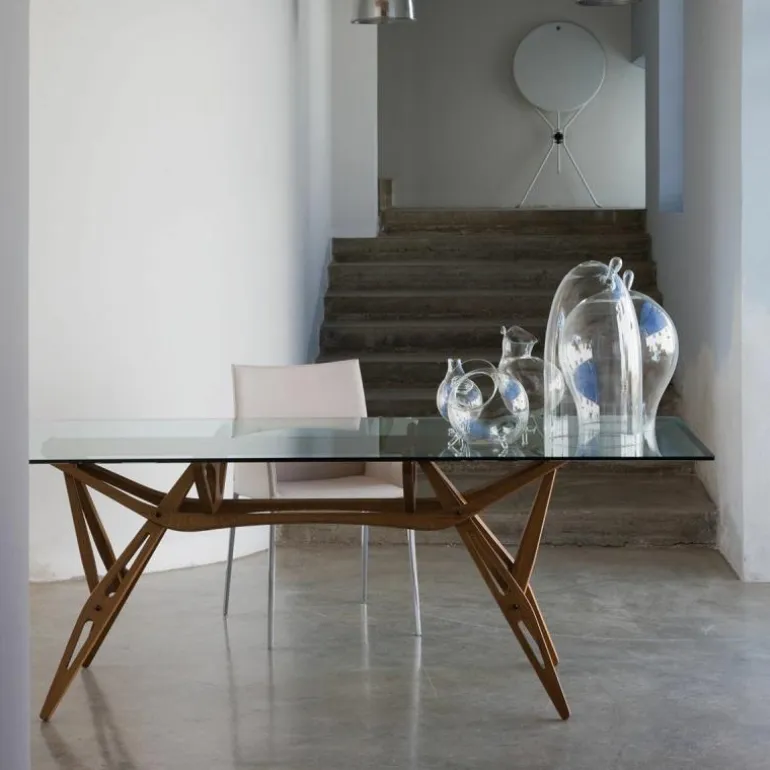 Het massief eikenhouten onderstel van deze tafel oogt in het aanblik vrij complex, maar laat zich langzaam aan steeds meer begrijpen. En wat u ziet, verrast het oog: een perfect mechanisme dat precies in elkaar past door het op maat gemaakt verbindingssysteem. De verbindingen lijken wat weg te hebben van een architecturaal bouwwerk, waaruit een invloed van Eugenio Mollino, een bekende Italiaanse ingenieur en Carlo Mollino’s vader, sterk naar voren komt. Het frame is verkrijgbaar in drie afwerkingen: een naturel uitvoering, een uitvoering voorzien van een zwarte lak en een uitvoering in een walnootkleur.r