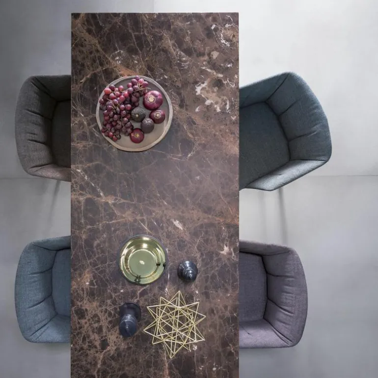 De ontwerper zijn passie voor vliegentuigen komt tevens sterk tot uiting in het tafelblad, dat wat wegheeft van een vliegtuigvleugel. Het blad is uitgebracht in een glazen uitvoering, dat een dikte heeft van 15 millimeter en verkrijgbaar is een ‘clear’ en ‘extra clear’ afwerking. Deze komt in een versie met een afgeschuind of rechte rand. Daarnaast heeft u ook de keuze uit een prachtig blad van Emperador marmer, dat een dikte van 20 millimeter heeft.r