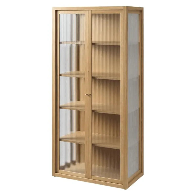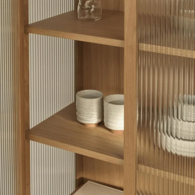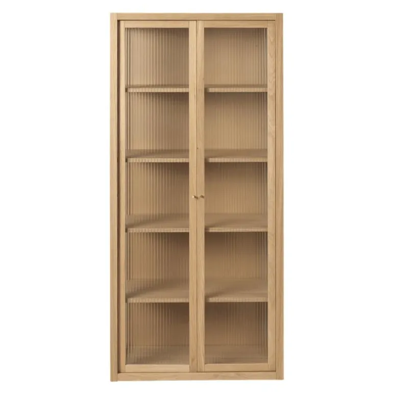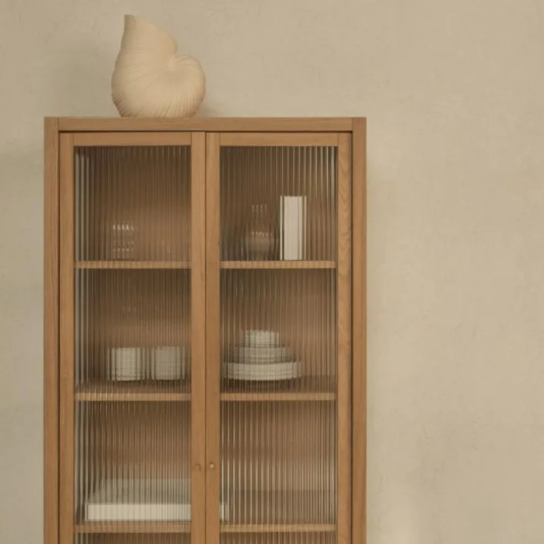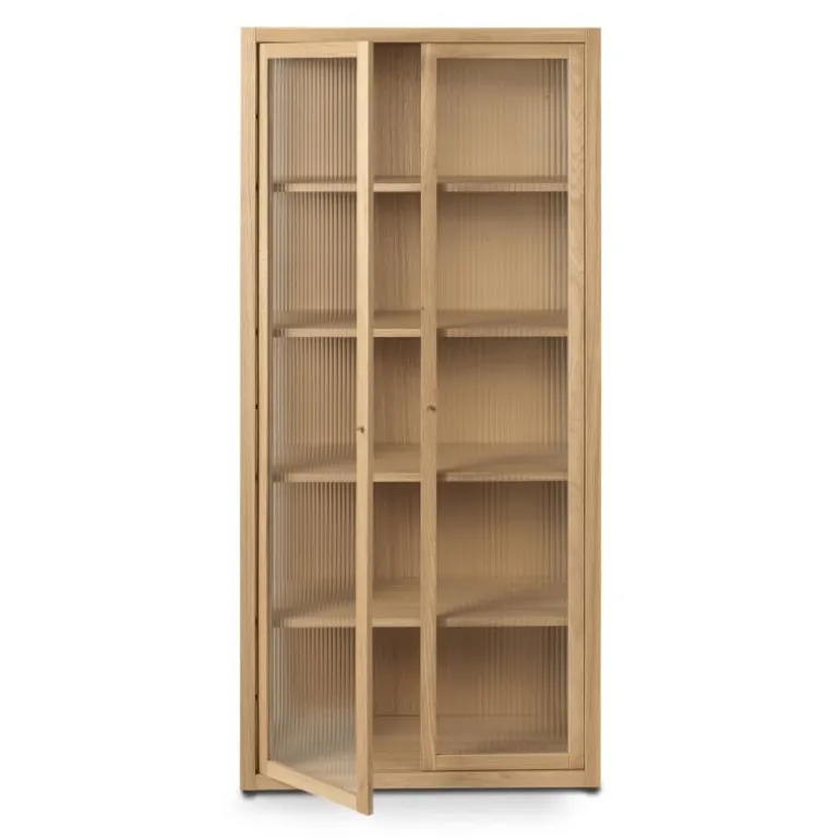 De Reed Vitrinekast van Ferm Living is een zorgvuldig ontworpen kast die functionaliteit en uitstraling combineert. De kast is vervaardigd uit massief eikenhout en eikenfineer, wat zorgt voor een natuurlijke warmte en een solide basis. Het ontwerp wordt gekenmerkt door heldere lijnen en een uitgebalanceerde constructie die het meubel een verfijnde aanwezigheid geeft in uiteenlopende interieurs.Een onderscheidend element zijn de deuren van geribbeld glas. Deze afwerking voegt textuur toe en zorgt voor een subtiele filtering van de inhoud. Wat zich in de kast bevindt blijft herkenbaar, maar wordt niet volledig prijsgegeven. Dit effect creëert een spel van licht en diepte dat bijdraagt aan een elegante uitstraling. De handgrepen van massief messing versterken het geheel en vormen een detail dat aansluit bij de hoogwaardige afwerking van de kast.Binnenin biedt de Reed Vitrinekast veel mogelijkheden om persoonlijke objecten een plaats te geven. De indeling is door de aanwezigheid van vier verstelbare legplanken flexibel, waardoor de ruimte eenvoudig kan worden aangepast aan verschillende soorten voorwerpen. Dit maakt de kast geschikt voor zowel servies en glaswerk als boeken of decoratieve stukken. De combinatie van openheid en bescherming geeft de mogelijkheid om waardevolle items op een stijlvolle manier te presenteren en tegelijkertijd goed te bewaren.De kast voegt zich moeiteloos in uiteenlopende woonruimtes. In de woonkamer vormt zij een representatieve plek voor decoratieve objecten of boeken, in de eetkamer biedt zij een elegante opbergplaats voor servies en in een werkomgeving fungeert zij als praktische maar karaktervolle aanvulling. Door de ingetogen vormgeving en het gebruik van natuurlijke materialen behoudt de Reed Vitrinekast altijd een harmonieuze aanwezigheid.De balans tussen esthetiek, gebruiksgemak en duurzaamheid maakt dit meubelstuk tot een waardevolle investering. De zorgvuldig gekozen materialen zorgen voor een lange levensduur, terwijl de doordachte details het ontwerp tijdloos maken. Het meubel is ontworpen om dagelijks gebruikt te worden, zonder dat dit ten koste gaat van de uitstraling.De Reed Vitrinekast van Ferm Living is daarmee meer dan een praktische opbergoplossing. Het is een meubel dat de ruimte verrijkt met karakter, een uitgekiend ontwerp en een blijvende kwaliteit die de tand des tijds doorstaat.