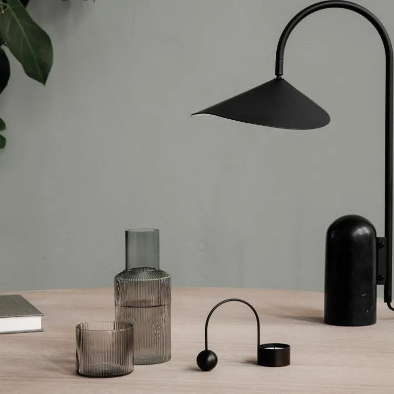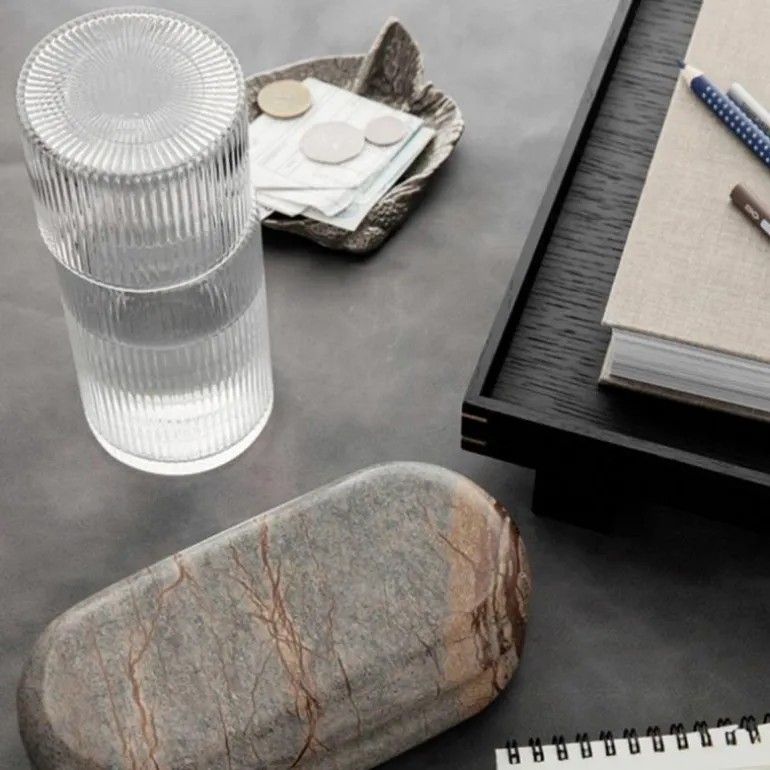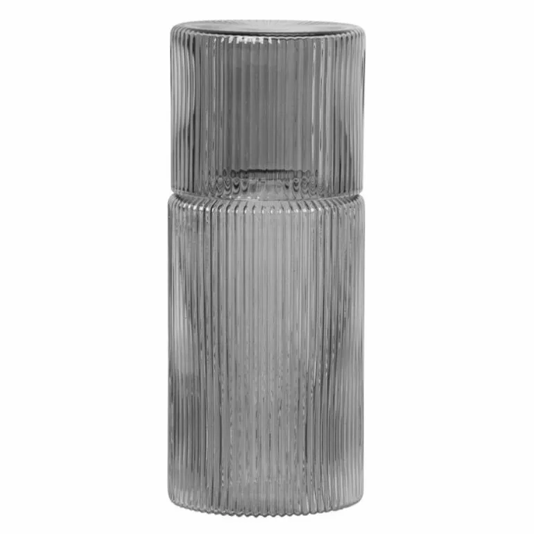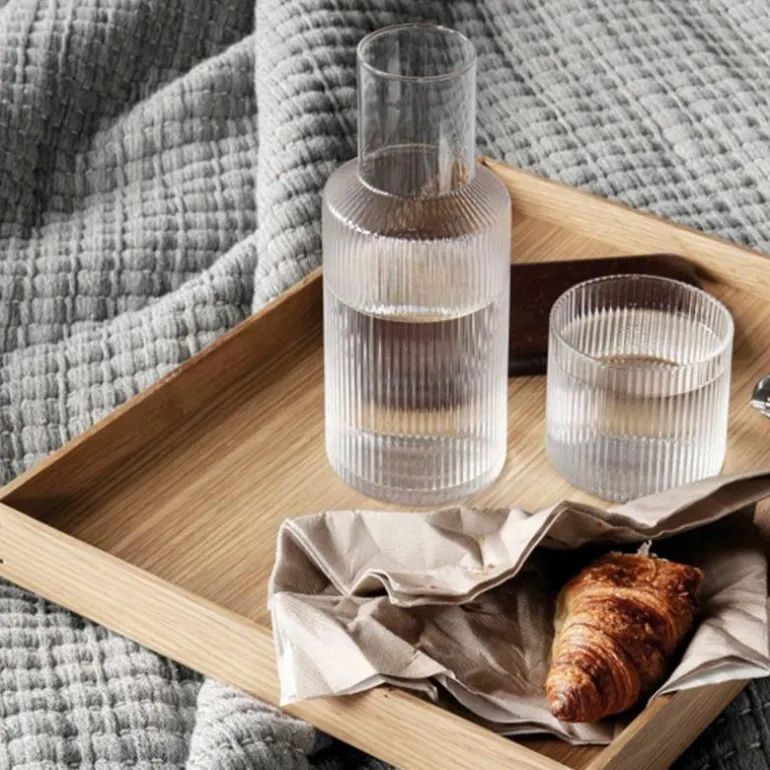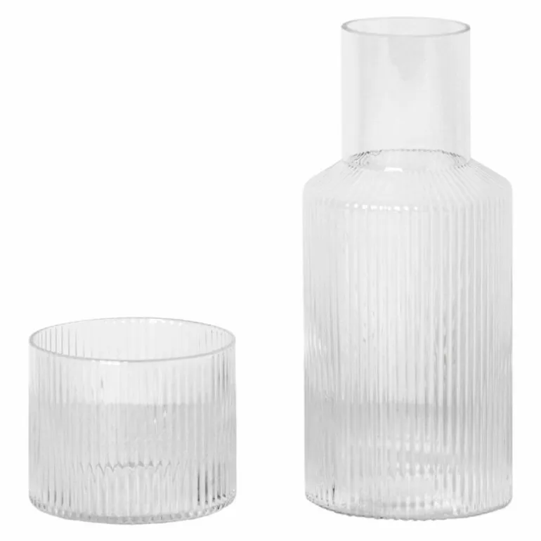 De Ferm Living Ripple Karaf Set is een uitbreiding op de al zo prachtige Ripple serie, gekenmerkt door een geribbeld oppervlak. Nieuw aan deze set is de handzaamheid. Het glas dient tevens als een afsluiter voor de karaf en dat maakt dat deze set ervoor zorgt dat u uw water altijd in stijl bij de hand hebt. Op het nachtkastje, op uw werkplek, komt deze set van karaf en glas goed van pas. r