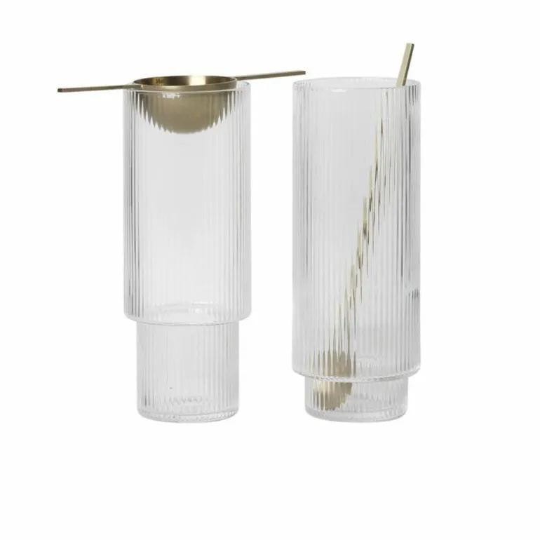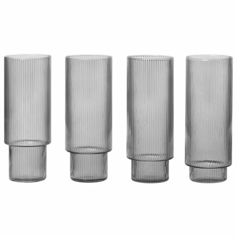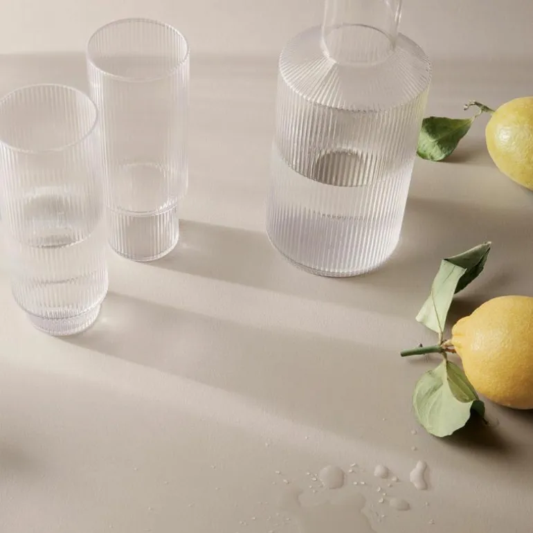 De Ripple Longdrinkglazen van het Deense merk Ferm Living zijn ontworpen door Trine Andersen en stuk voor stuk op een vakkundige manier mondgeblazen. Door het glas in een mal te blazen ontstaat het fijne ribbelpatroon, wat deze glazen die moderne, elegante look met een vleugje art deco geeft. Ze verschillen allemaal iets van elkaar en vormen een natuurlijk onderdeel van een avond in goed gezelschap. De longdrinkglazen zijn een speelse toevoeging aan een casual samenkomst en de finishing touch in een formele setting. Schenk uw favoriete drankje in en kijk hoe een iriserend spel van licht en texturen in de rimpelingen van het glas verschijnt. Naast dat de Ripples perfect zijn als waterglazen of sapglazen, zijn ze ook erg geschikt als (highball) cocktailglazen.r