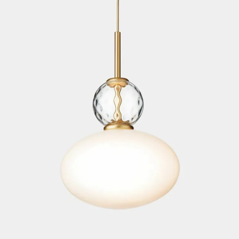 Alle drie de lampen hebben één ding gemeen: kalme organische vormen van mond geblazen glas. De Rizzatto 32 hanglamp uit de serie kenmerkt zich door de gebalanceerde verdeling van een kleinere transparante gevormde glazen bol die is gepositioneerd boven een grotere bol van opaalglas. Een verbindende lijn van messingkleurig geadoniseerd aluminium loopt door de transparante glazen bol heen tot in de sfeervolle bol van opaalglas, waar deze uiteindelijk het licht laat ontvouwen. De Rizzatto 32 lamp straalt pure balans en kalmte uit, en krijgt een bijzonder chique uitstraling dankzij de subtiele extra messingkleurige details in het armatuur. De andere prachtige lampen uit de Rizzatto serie van Nuura vindt u terug bij de productfamilie.